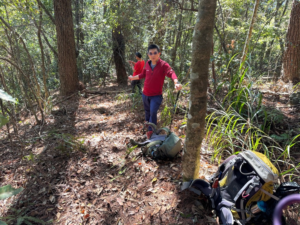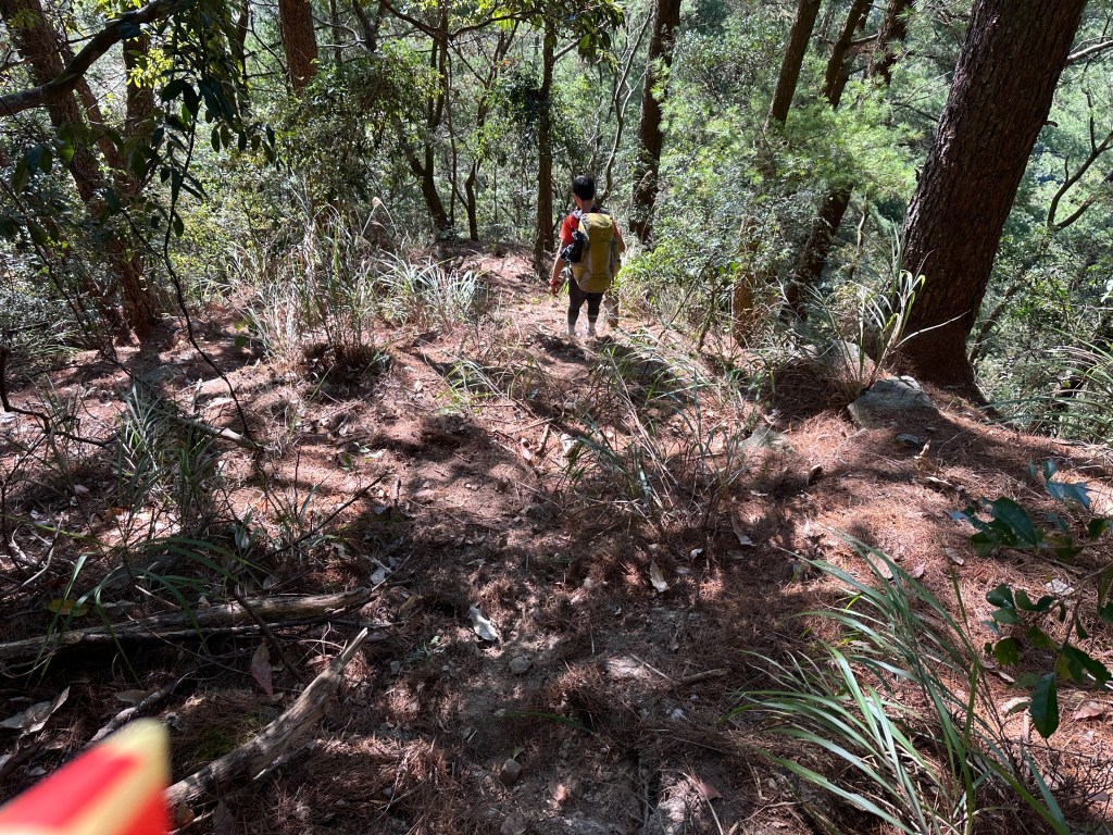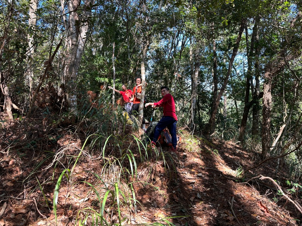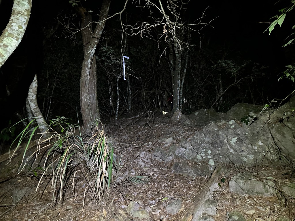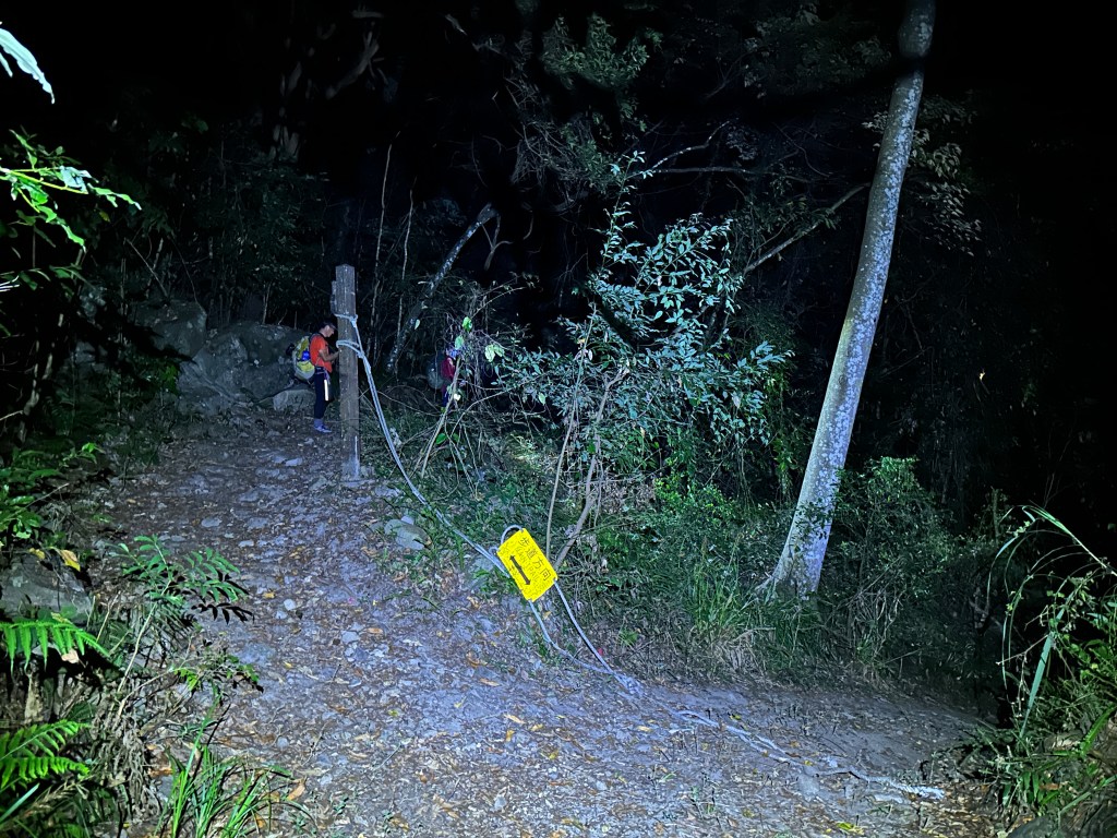 Peter表達他不想再上去,所以我們三人就將背包卸下,將主要的裝備集成在一個背包裏,由Jun代勞背著。這600公尺也是沙沙的路徑,或許是因為摸黑而上才倍感辛苦,布條不算明顯,且路徑也算得上凌亂,布條很少,Jun跟Smile則一路綁了近百條的布條。
