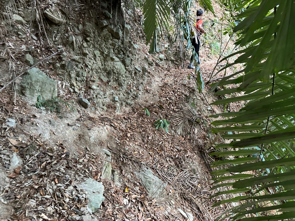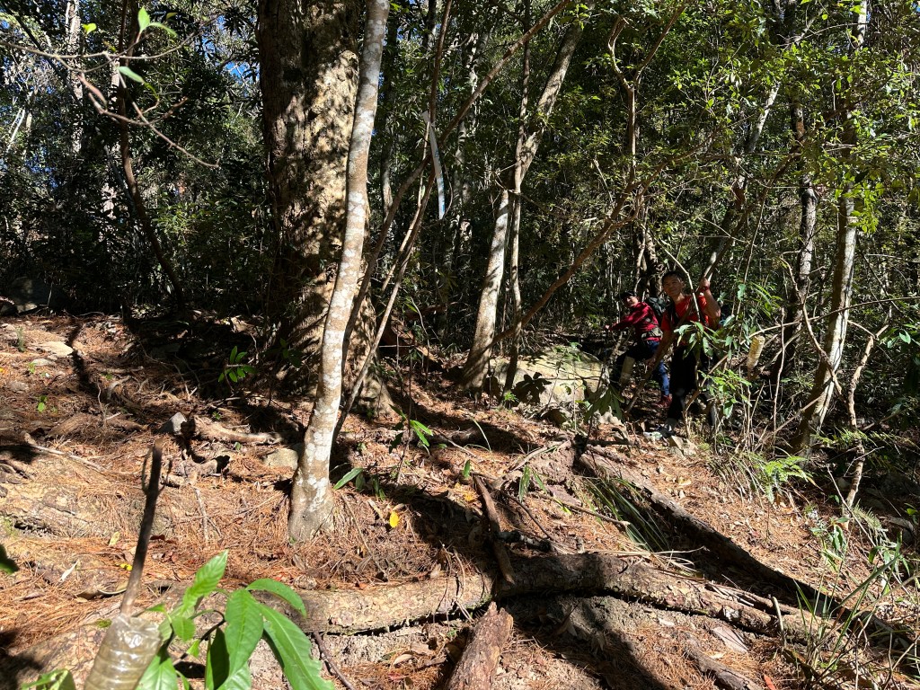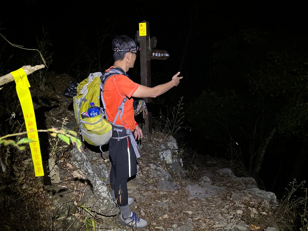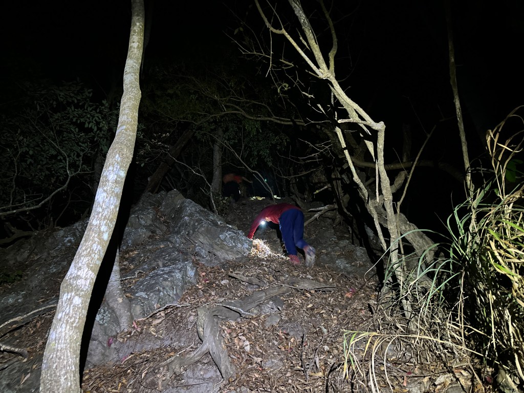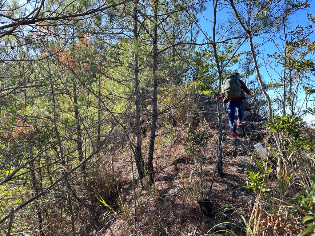 Peter表達他不想再上去,所以我們三人就將背包卸下,將主要的裝備集成在一個背包裏,由Jun代勞背著。這600公尺也是沙沙的路徑,或許是因為摸黑而上才倍感辛苦,布條不算明顯,且路徑也算得上凌亂,布條很少,Jun跟Smile則一路綁了近百條的布條。