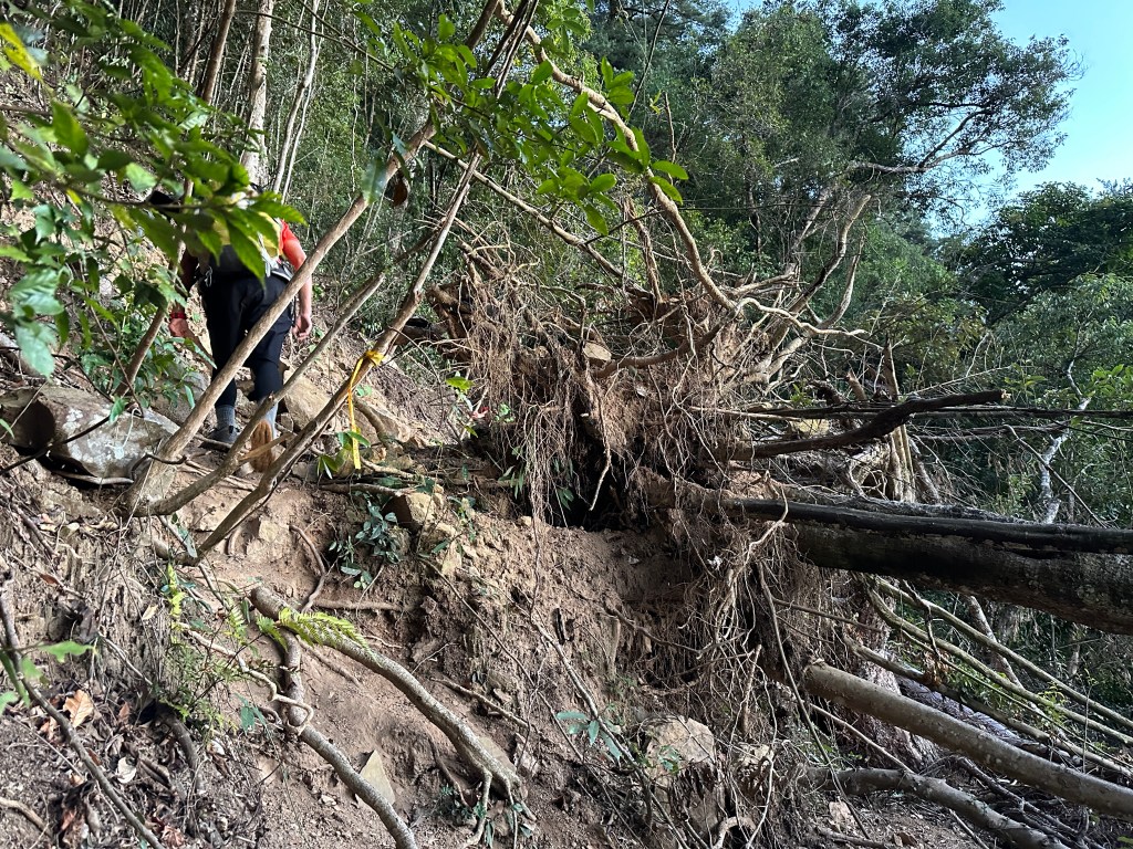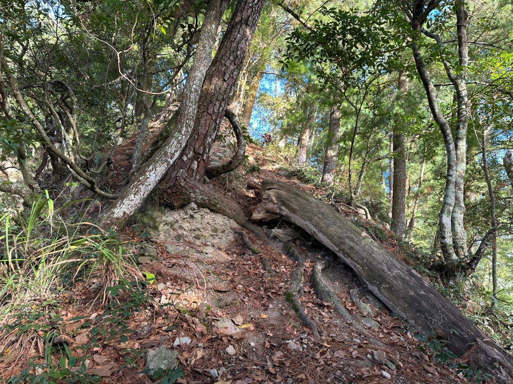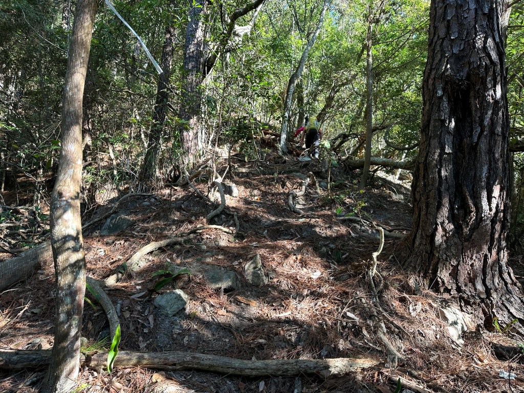由登山口跨越倒木後,就馬上面臨崩塌路徑,路幅小且斜滑長度約有100m,通過後,左轉直接接上稜線一路陡,約在H860m時上到電塔,這裡是一處小平台,可以喘息休一下。再來有100m的平坦路,接著就一路陡到三角點,大都有45度的陡度。布條不多,路徑稍凌亂。