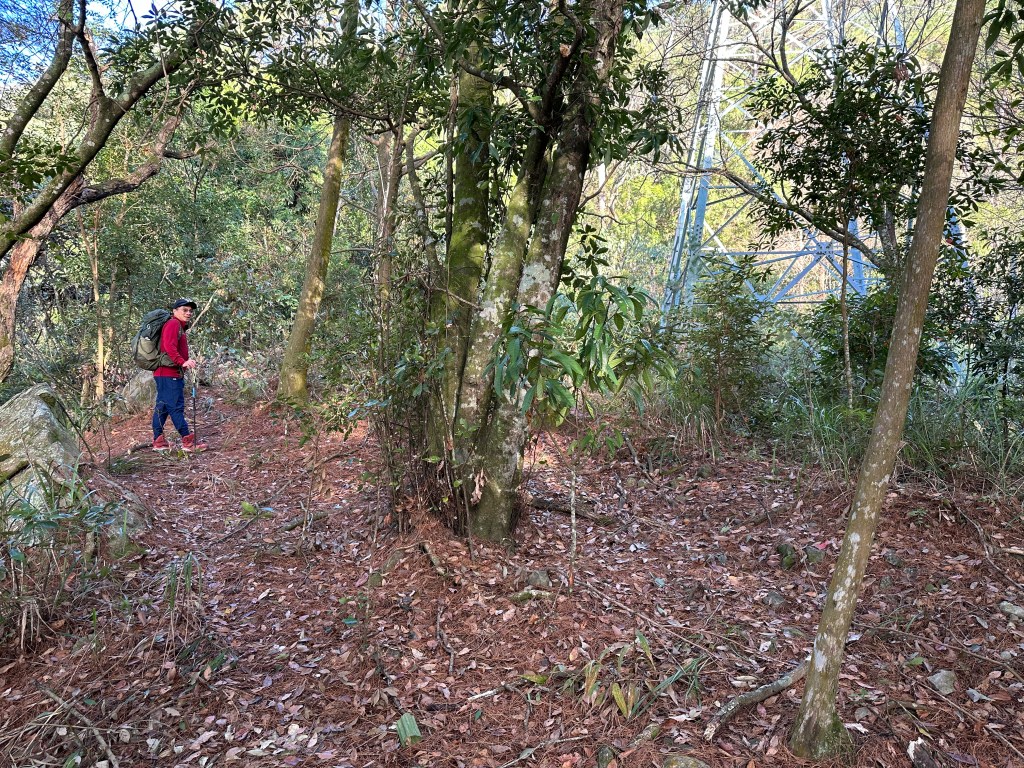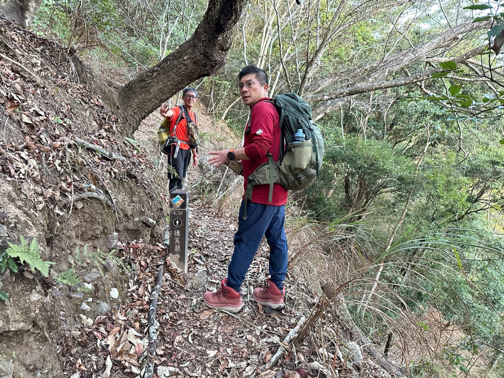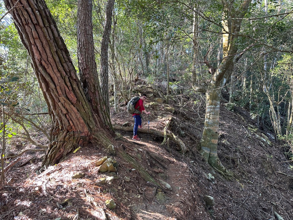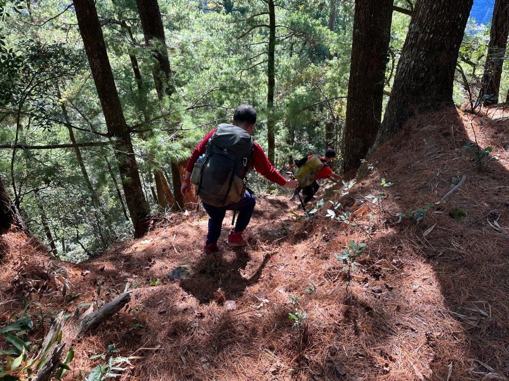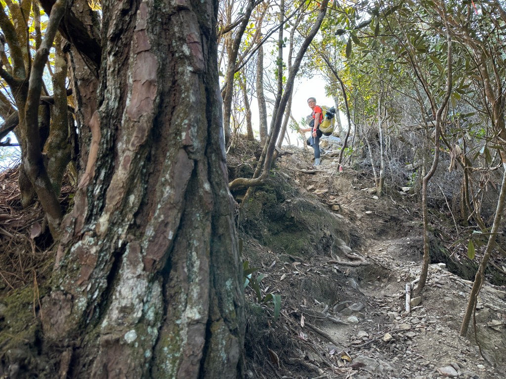 Peter走快但不小心稍為走錯了一段。陡上在沙沙的落葉路徑上,不覺有異;陡下時,才感受到沙沙路徑的威脅,有幾處比較狹窄的瘦稜,路徑沙滑要謹慎!花了不少時間,才回到東峰登山口。
