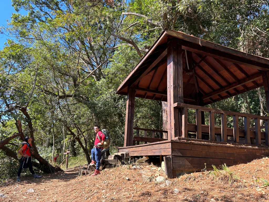 接下來才是今天的重點!東卯山東南稜上東卯山,事前做過功課看到很多山友的資料或影片,都說這一段像鳶嘴山的攀爬!從北松鶴山登山口再往前走50m,即可看到涼亭,這裡也是東南稜上東卯山與德芙蘭生態步道的交叉口,亦即為東卯山東南稜登山口,為了方便我給它稱為涼亭登山口。