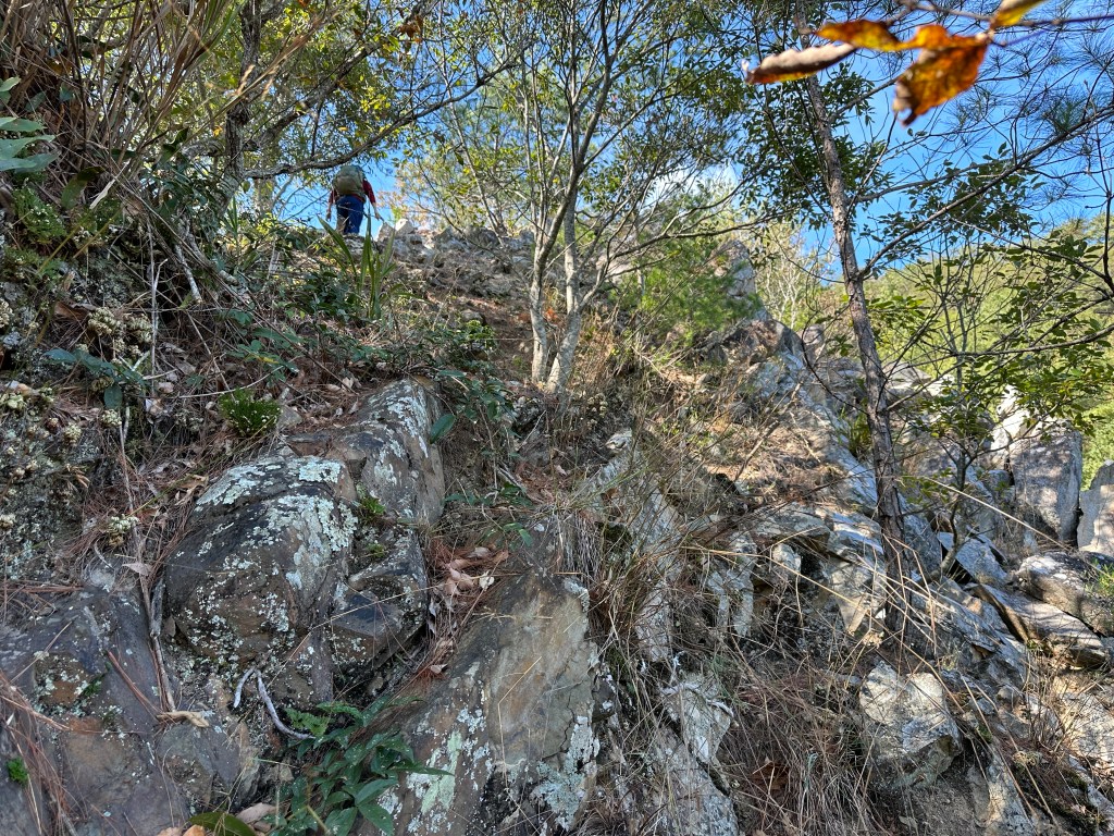 但接下來仍在陡峭的岩壁路上持續陡上,一直到通過H1290m的三叉戟岩區後,路徑再度轉為平緩,再轉為陡峭就會進入樹林裡。在這一段過程中Smile拍的不亦樂乎啊!我一定是緊張大師,一直催促著Smile前進,心中一直在謀想這裡耽誤過久,只怕最後兩峰就都得一路摸黑?