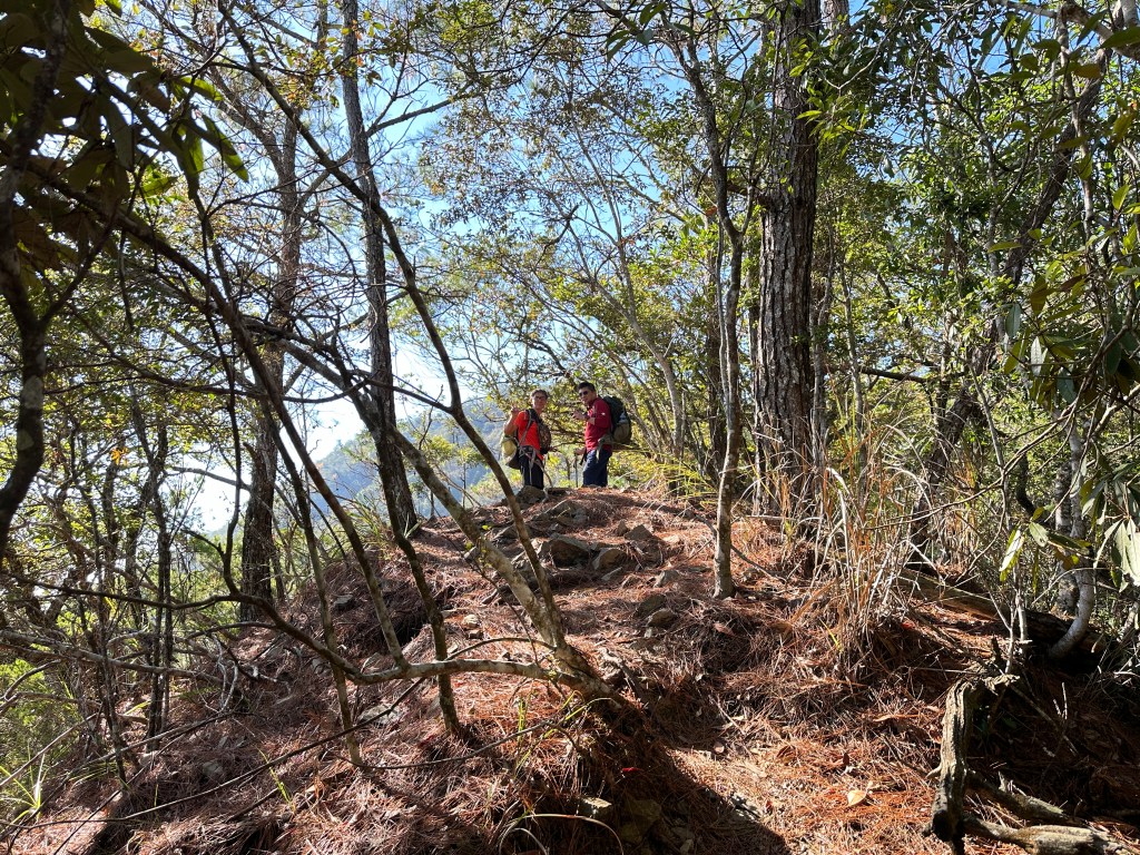 其實四人在這一段都會忍不住駐足攝影啊!在H1300m脫離岩壁區後,再度進入陡峭的樹林稜線,到了H1500m的小平台已過中午!四人就在這裡休息了25分鐘吃午餐!接著通過1522峰及1530峰,再往前一段就接上了屋東岔,後面的路徑我們就都走過。