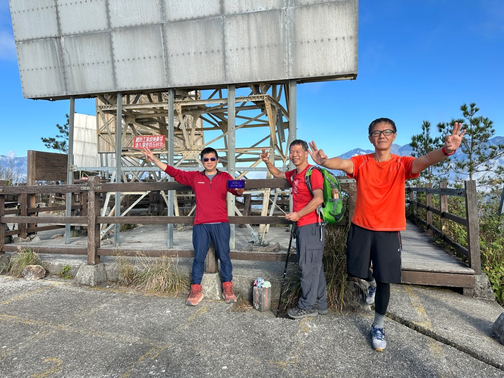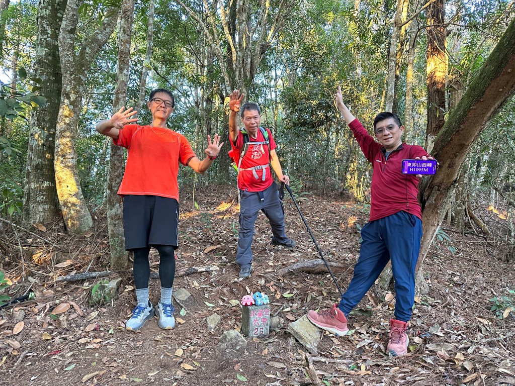 從15:35到16:36只用了1小時就抵達西峰,中途追過了不想小跑的Peter,在4.2K的距離(實際衡量的距離大概只有3.6K)要走下海拔600m的高度,路徑條件雖佳,但”跑起來”也壓力山大!三人正在西峰與三角點拍照時,Peter也恰好趕上,當然也要讓Peter留下足跡,拍完照已經是下午16:47。