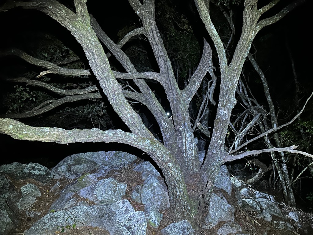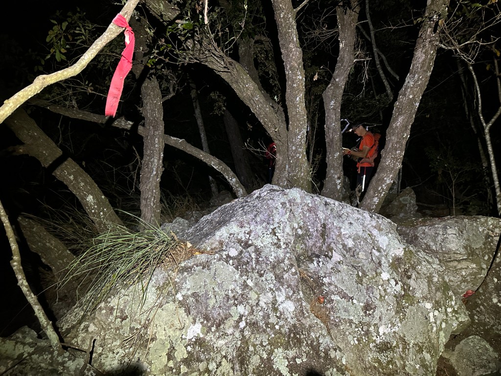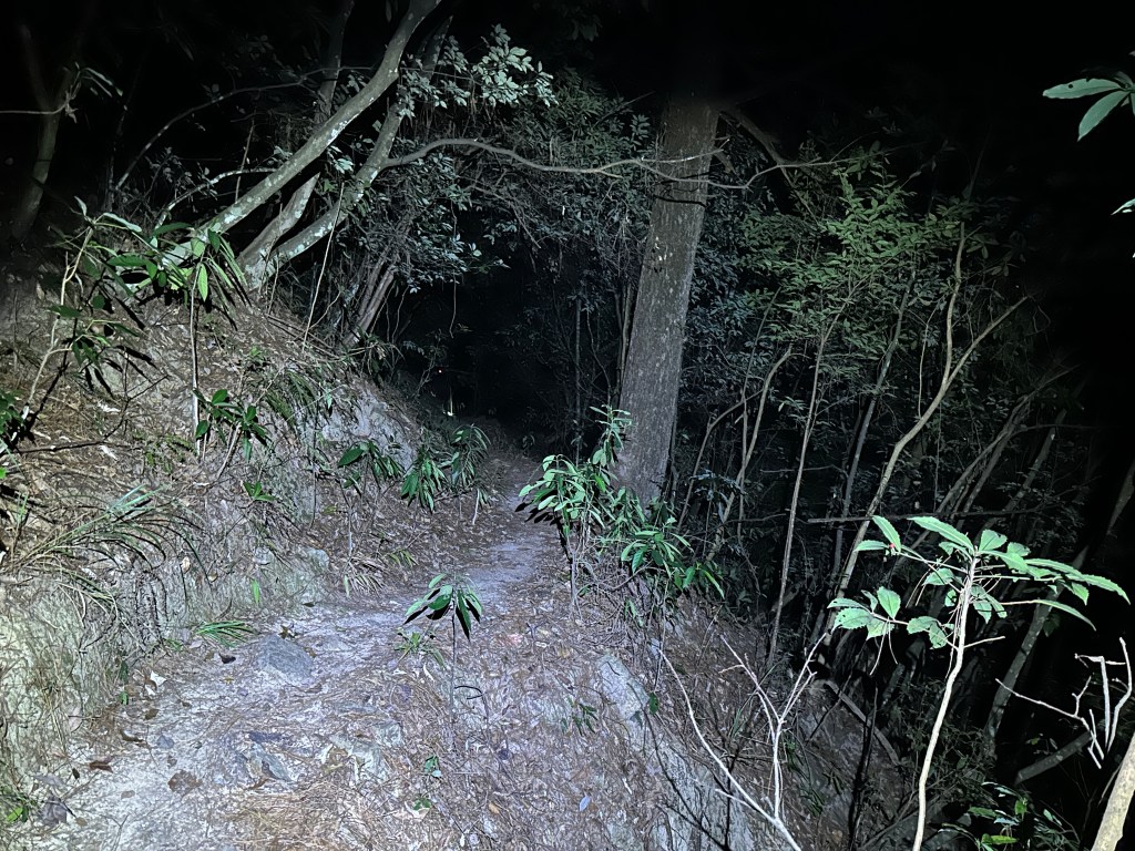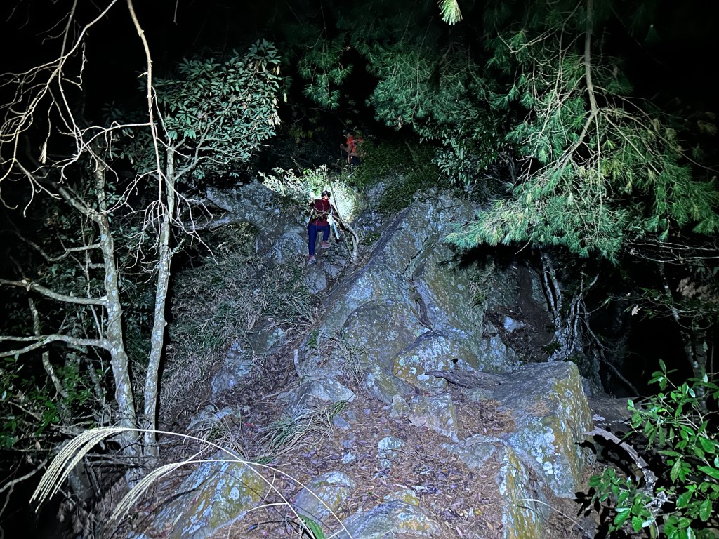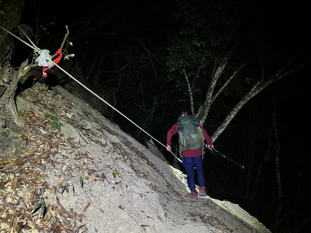 這一條路徑越往上走,瘦稜型態越發明顯,即使我們用的頭燈已經是超亮超廣型,都仍可感受到兩側是斷崖地形的恐懼感,有點像東南稜的垂直岩壁,三人一路戰戰兢兢,既找路徑也綁布條,登頂前200m,路徑轉為岩石岩壁型態,需非常小心兩側的極陡深斷崖邊坡。