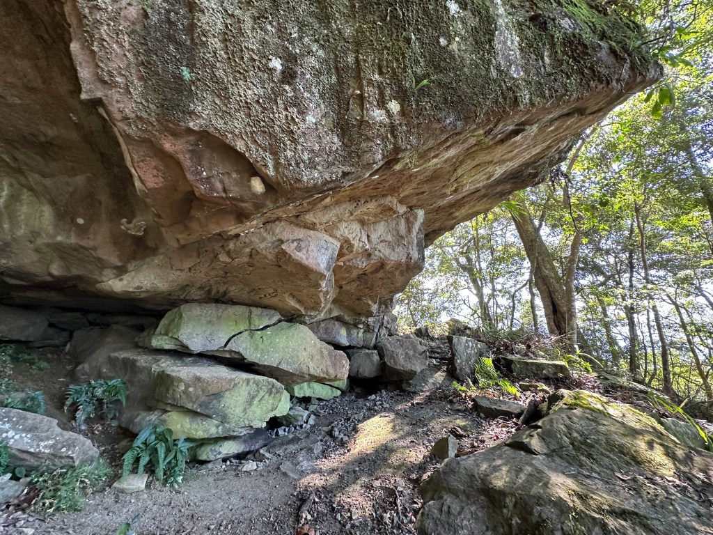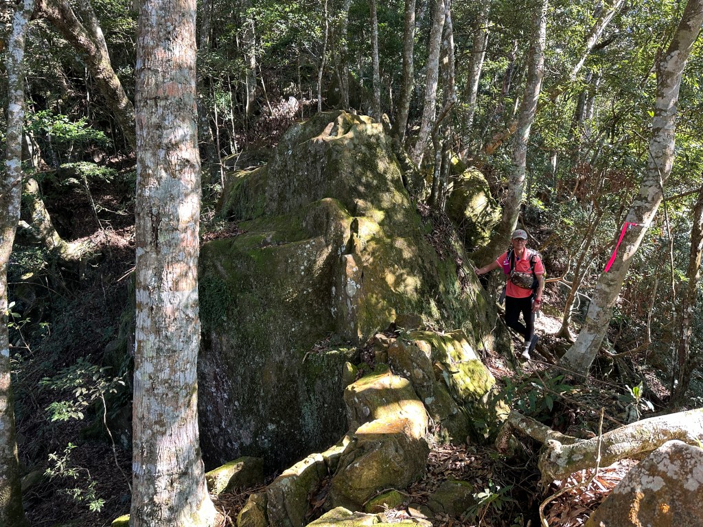 由西南峰先陡上至鵝公髺山登山步道岔,距離1.8K要由海拔H1012m陡上到H1550m,再由步道岔走近1K的距離到鵝公髻山,所以還需要2.8K的距離。一路走在極陡岩石稜線上,經過兩處的大岩壁,必須腰繞而過,接上了鵝公髻山登山步道後,突然有柳暗花明又一村的感覺!