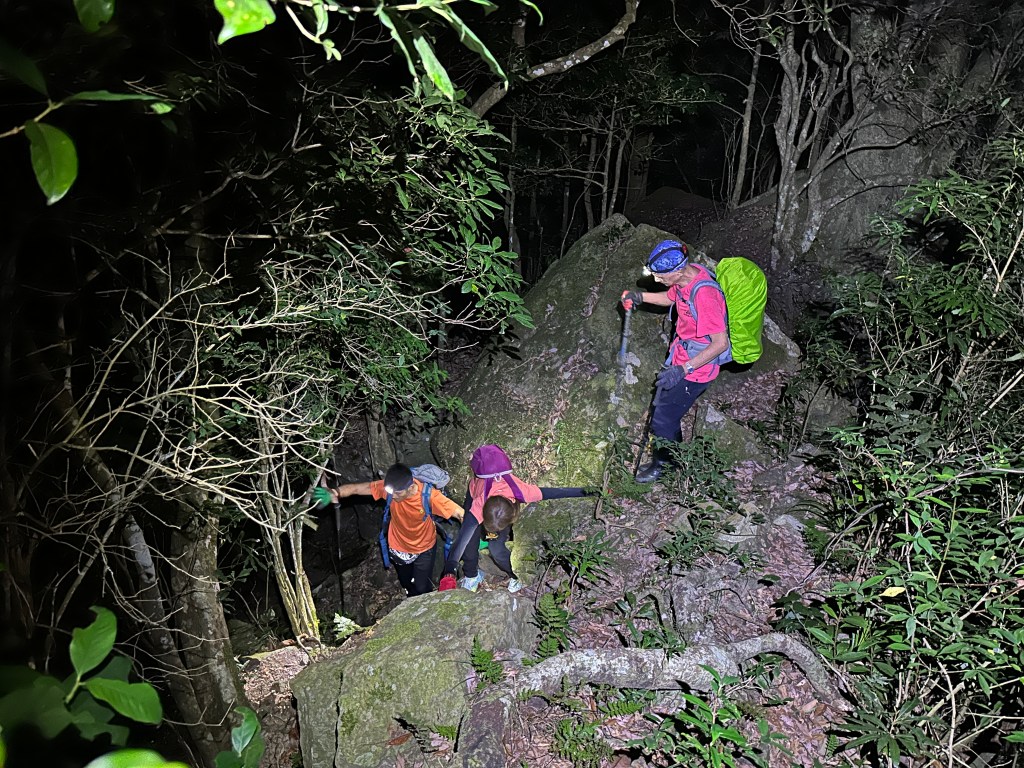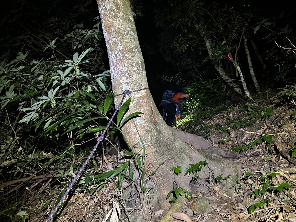 原本以為西南稜已經非常難走,沒想到東河線也好不到那啊!一開始就是幾近垂直的一路陡下,好處就是這一段比起西南稜繩索多了不少,走到一半,已經天黑!加上夥伴Fanny可能之前比較少走中級山路線,因此大夥就慢慢地走順陪Fanny,並以安全為首要考慮,由Smile帶頭探路,由Jun壓隊。