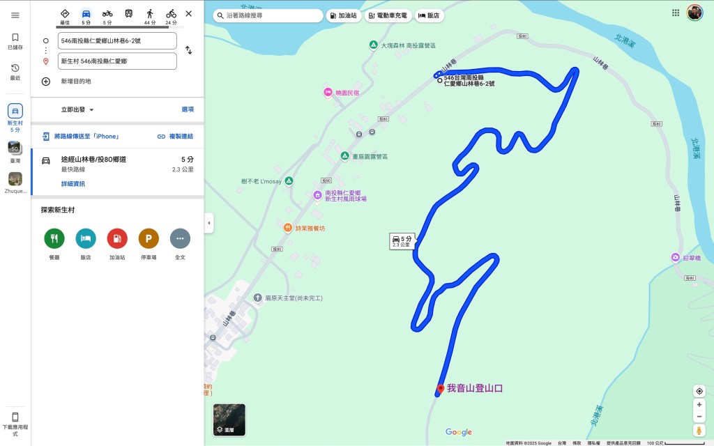 請朋友們直接利用Google導航到我音山登山口,由投80線的月夢田-花樹營區露營區旁右岔的產業道路開車進入,距離有2.3K,這一段到我音山登山口的產業道路,路徑狹小中途都難以會車,陡峭適合四輪傳動車。