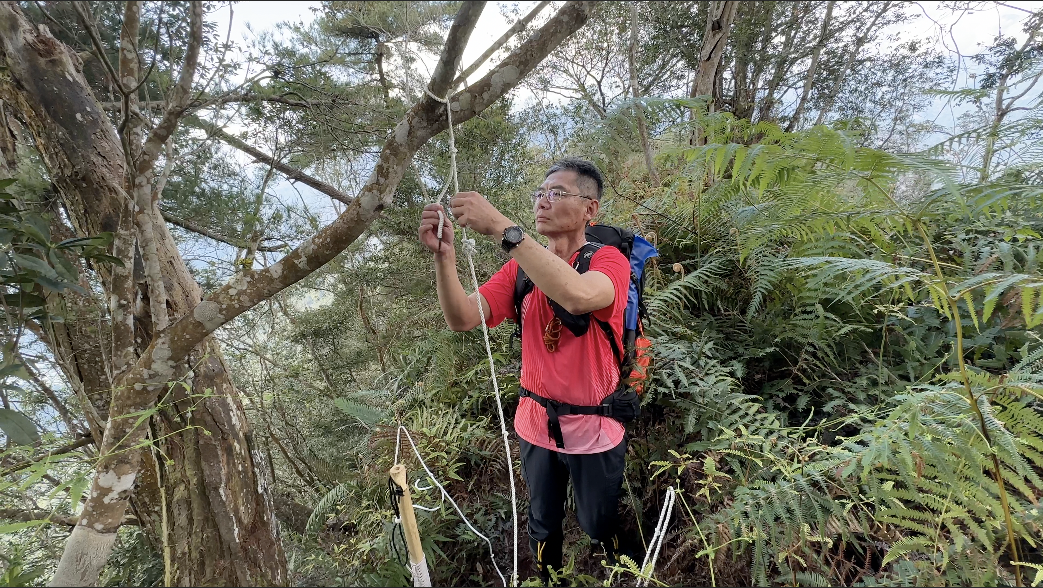 由登山口開始,陡上走約220m很快就抵達我音山北北峰,再持續陡上走0.8K就來到北我音山。由北我音山繼續走,先經過一段平坦的竹林路徑,接著山徑轉陡,陡上到超過海拔H1160m後,就會來到一段右側為斷崖邊坡的路徑,此路段的幅度很窄,右側又是深不見底斷崖,通過時要走慢一些,沒有繩索!但今天我們在回程時,在此段綁上了一段繩子,目前走過可以拉繩而過會安全很多。