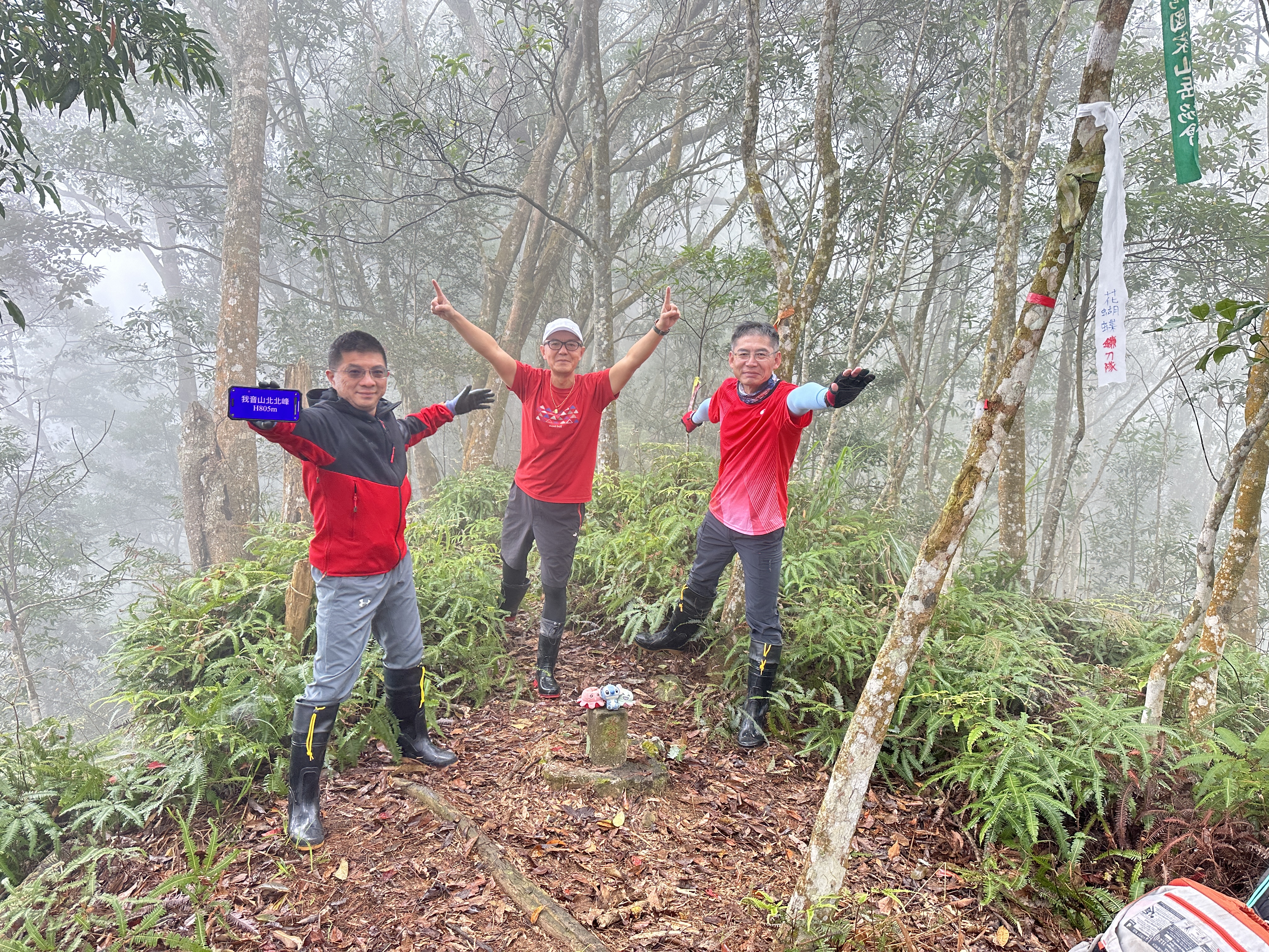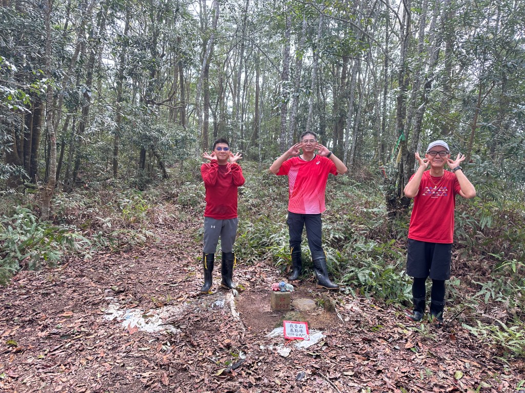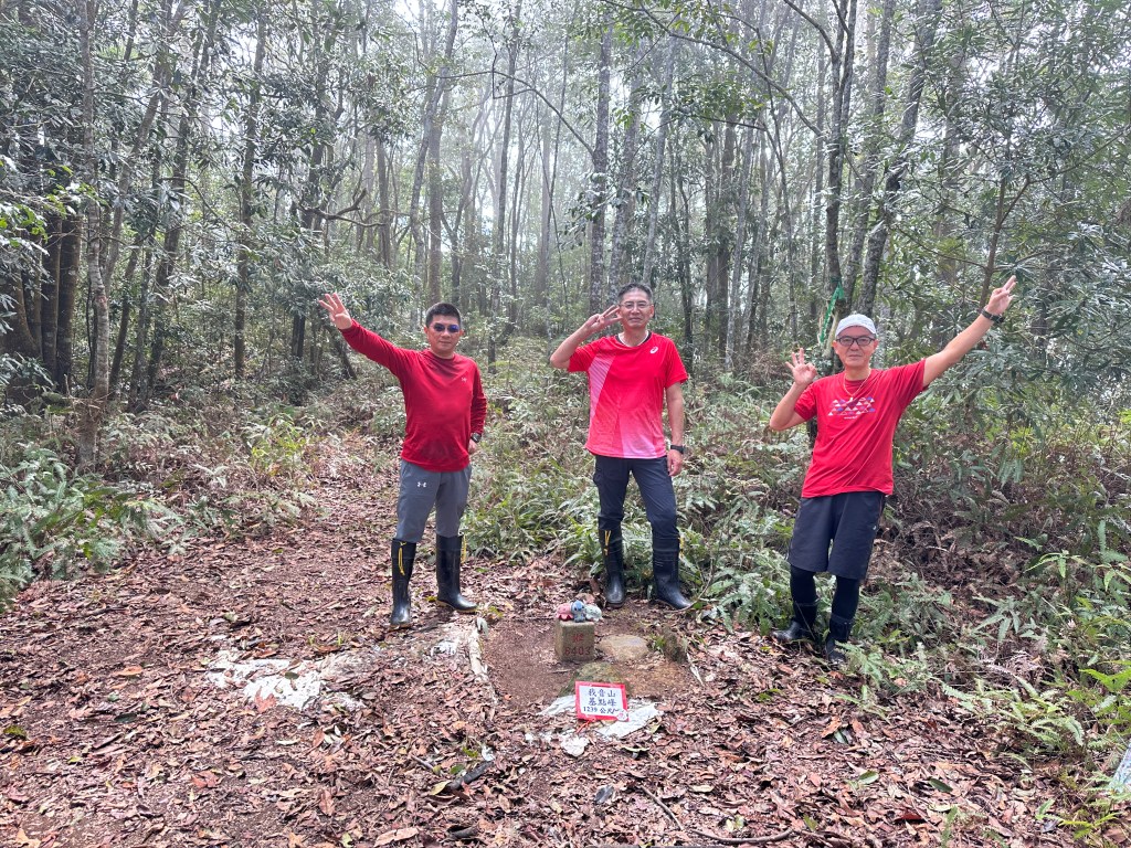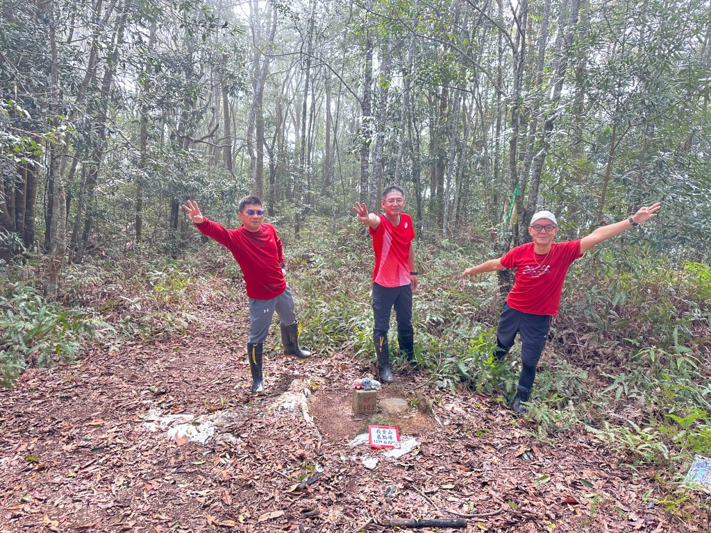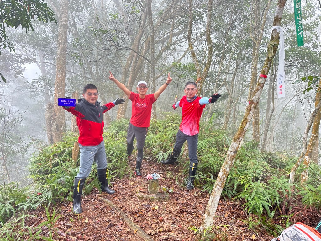 投影片:我音山北北峰。走了220m的距離就抵達。左起:我(Gosen)、Jun、Allen。08:58