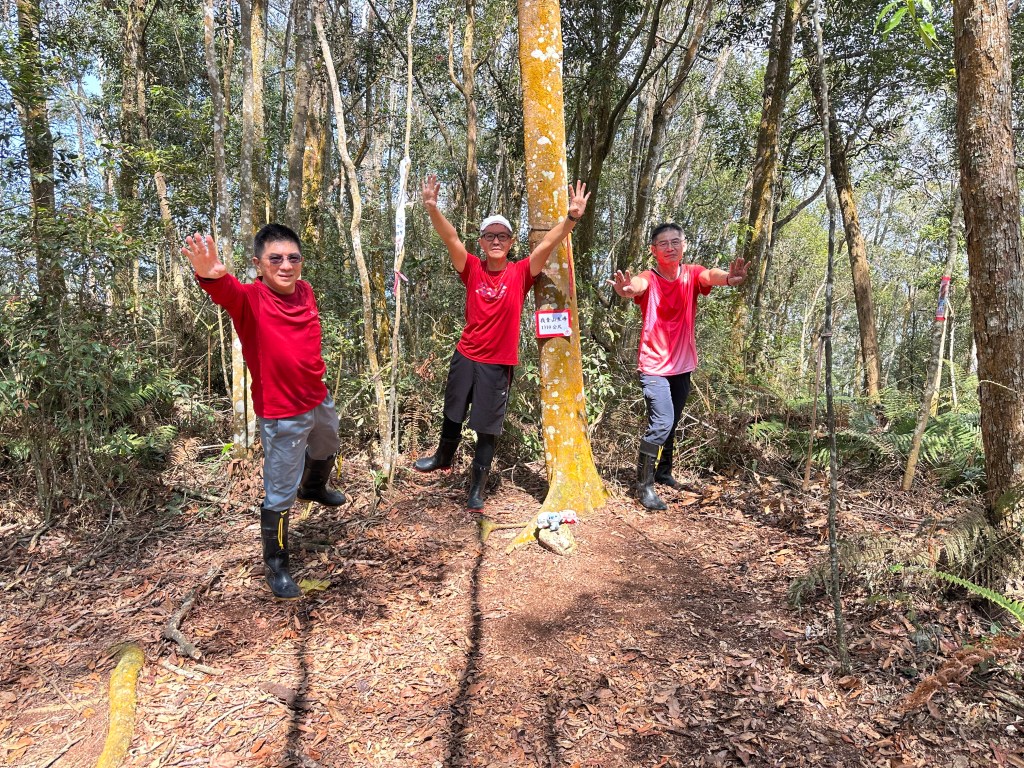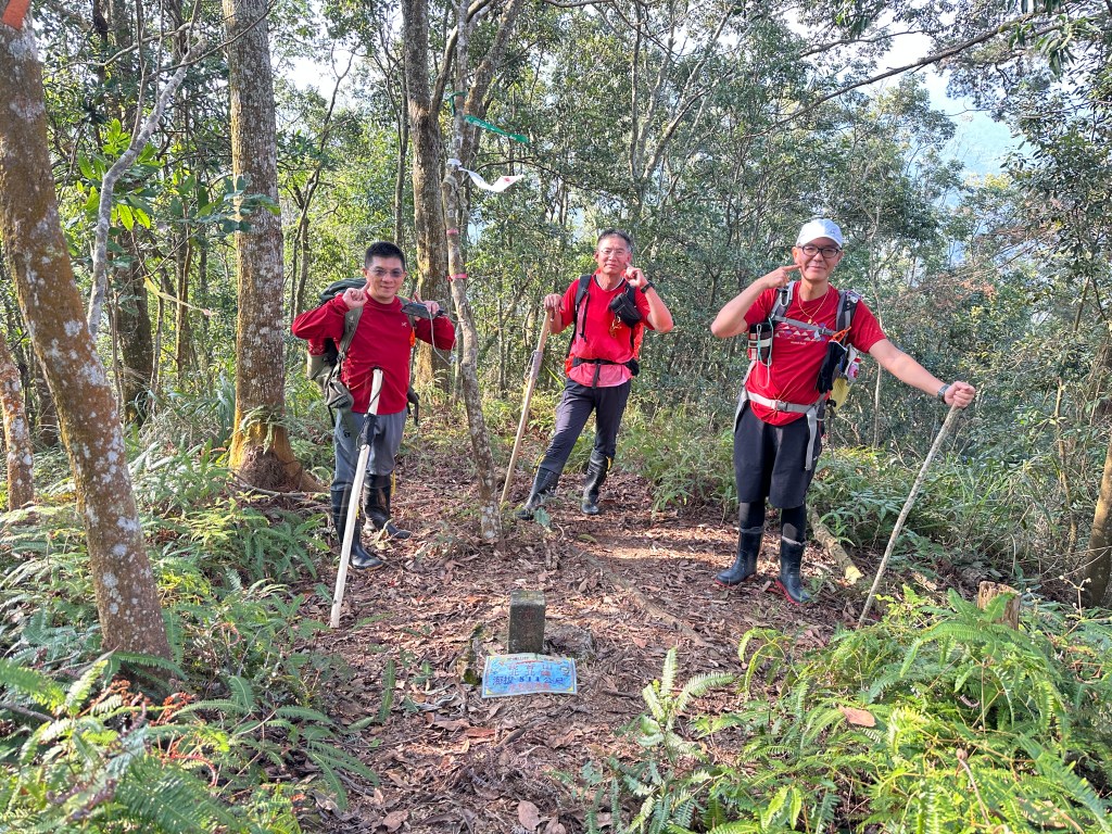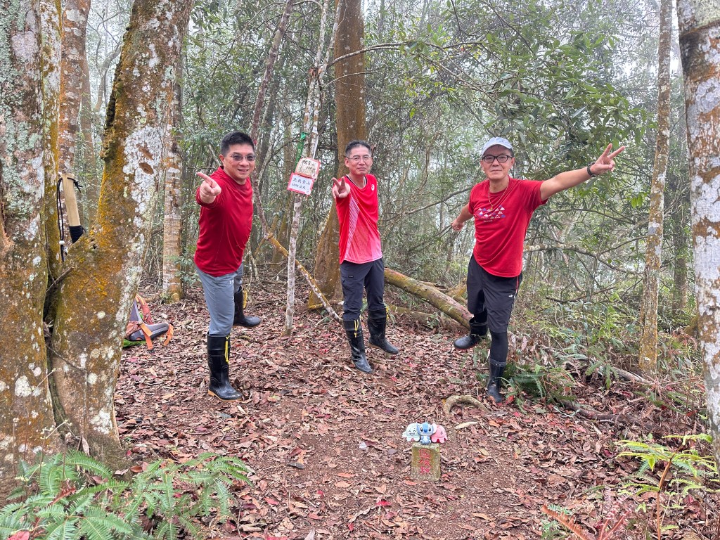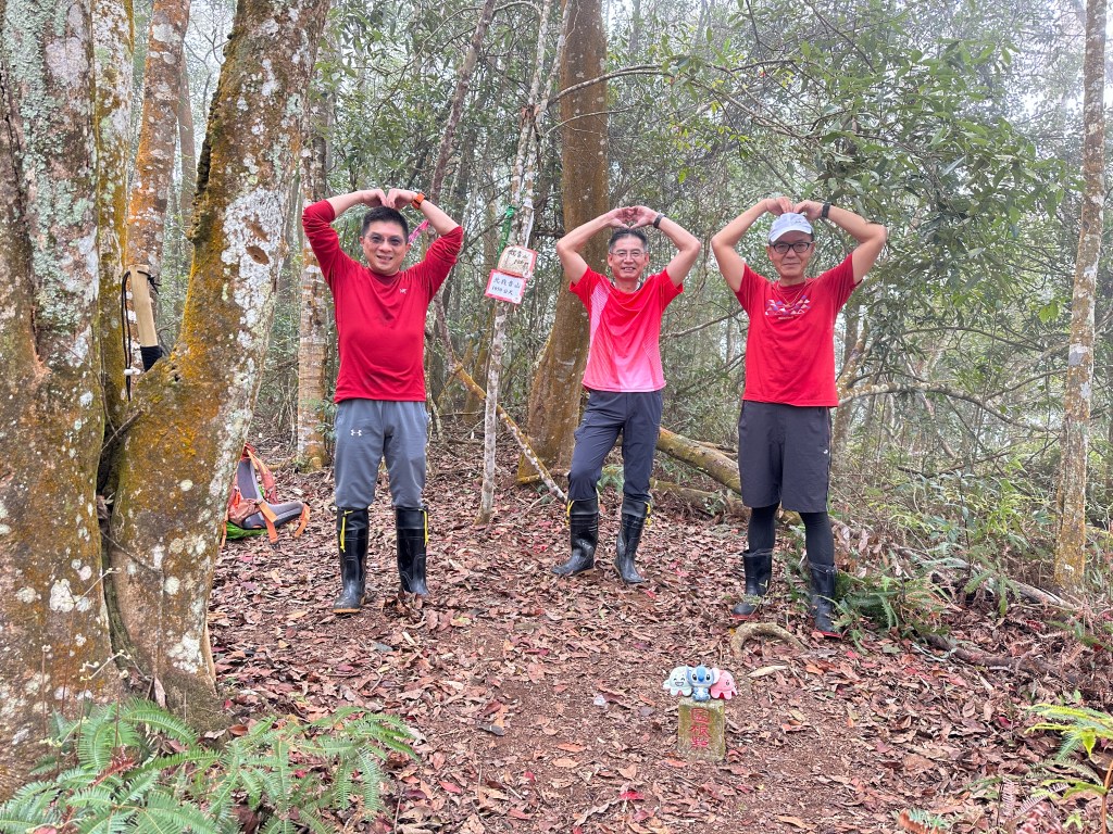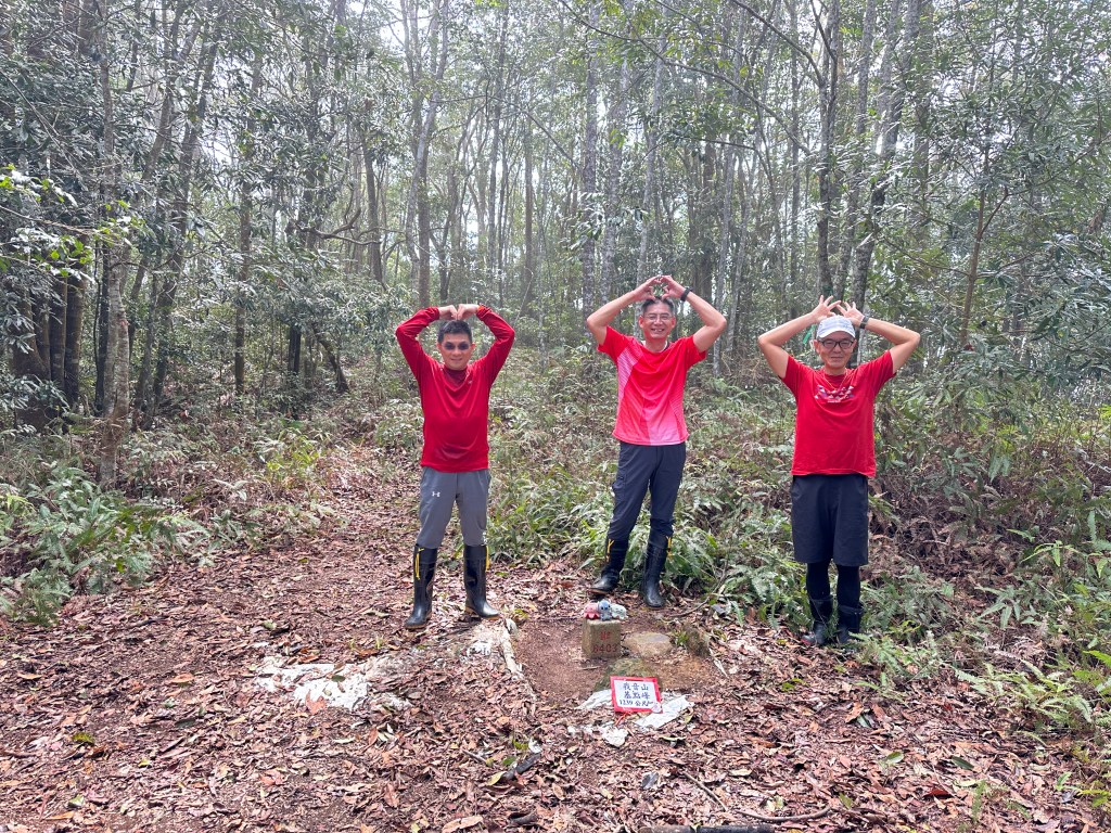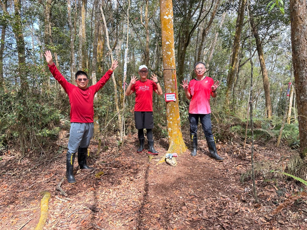 投影片:我音山北北峰。走了220m的距離就抵達。左起:我(Gosen)、Jun、Allen。08:58