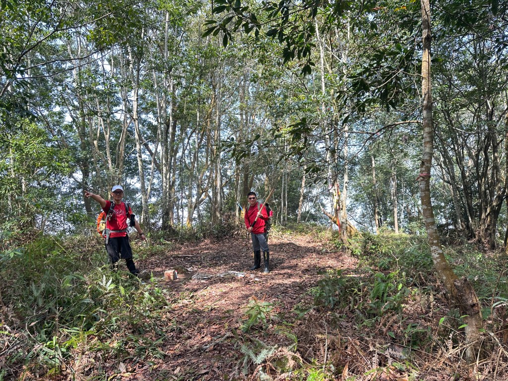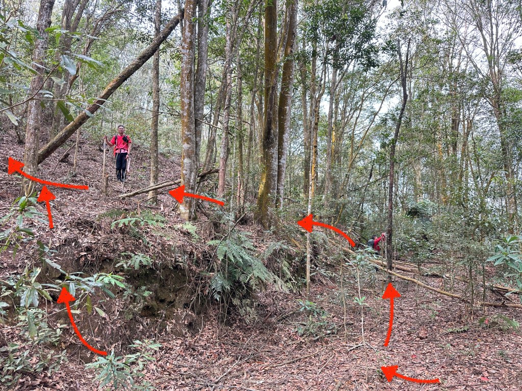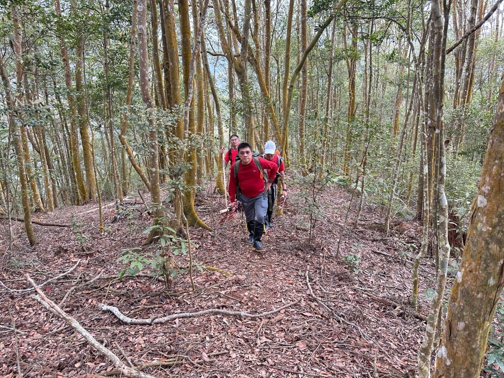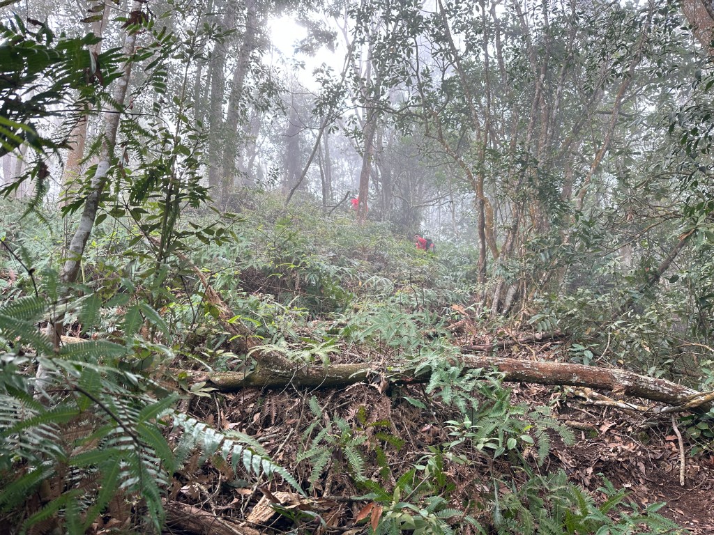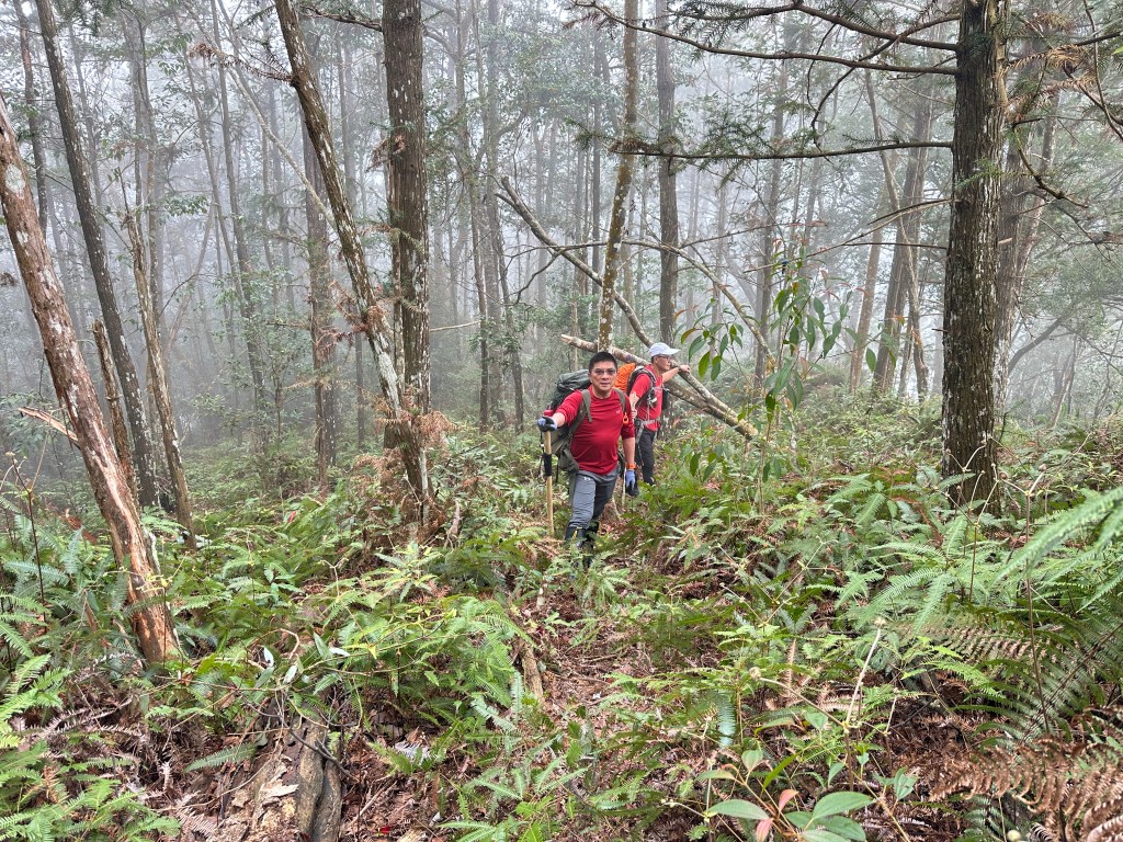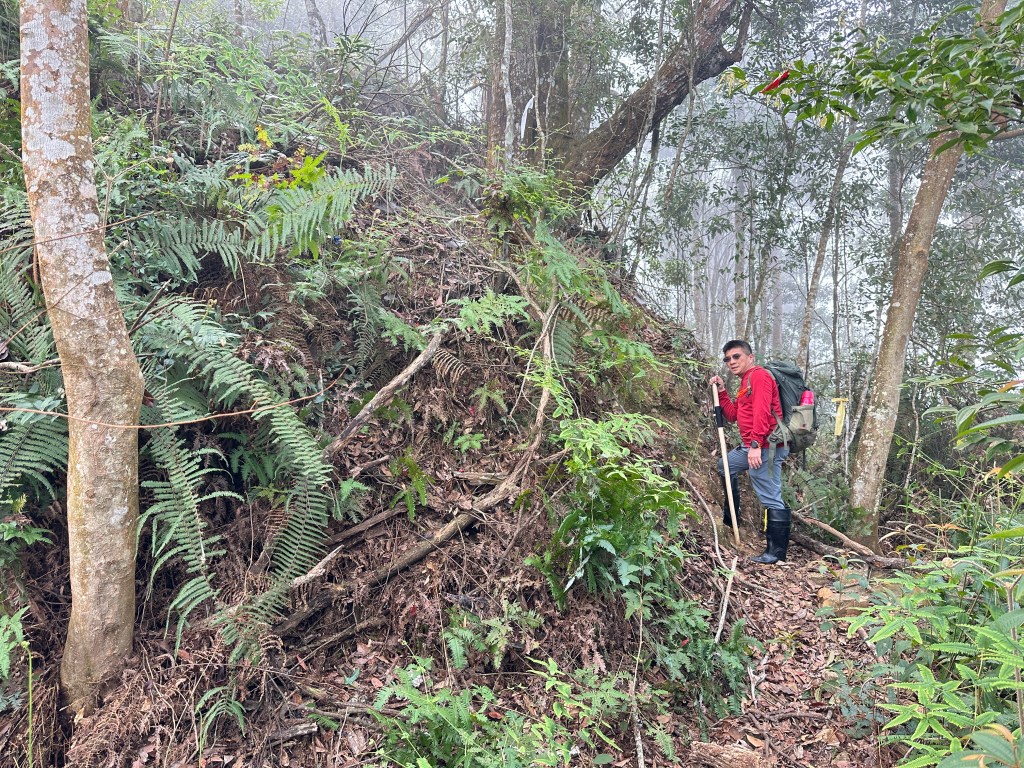 原有計畫繼續陡上往關刀山岔走,但因為隔天要走惠蓀O聖,因此我們繼續往前走0.8K的陡下,下到鞍部,看到了木屋遺址之後即回程。並回到主峰午餐休息。接著就依照原路而回。