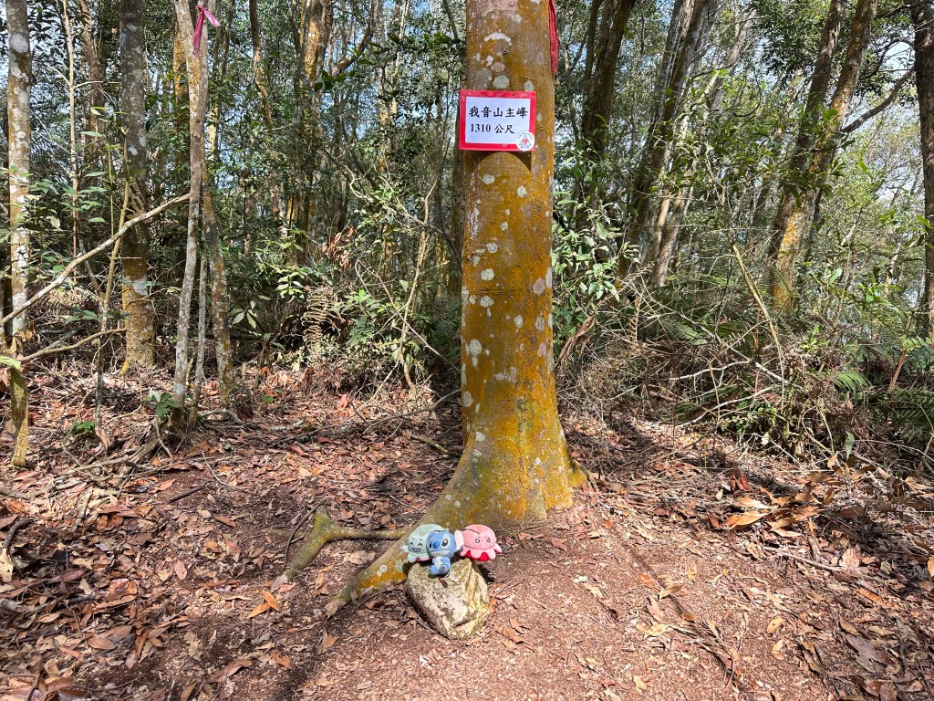通過邊坡斷崖後,很快就抵達我音山基點峰,腹地蠻大但沒有展望。繼續陡上走0.7K後抵達我音山主峰,但在抵達最高處前20m就會看到一個基點,再往前走20m感覺上才會最高處。主峰這裡是一大片的寬稜,腹地蠻大。