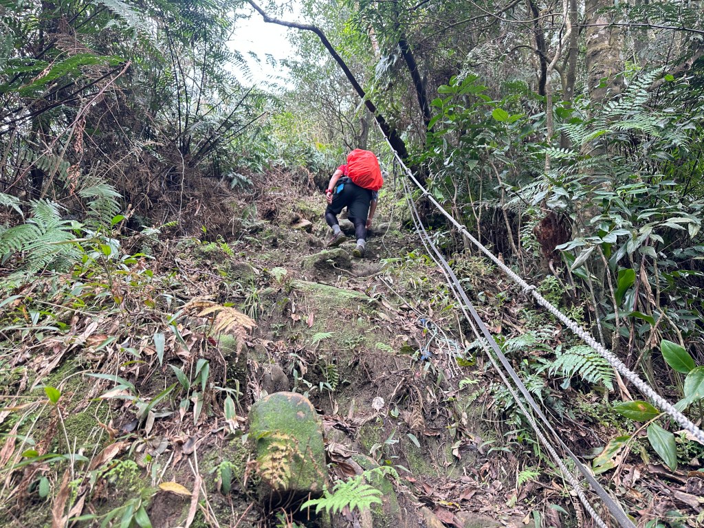 接著經過長春觀,沿著產業道路往前走將近100m,來到直潭山5K登山口,右轉後一路陡上,經過直潭山西峰,這是沒有名牌的基點?左側的左岔可通往永福路,我稱這裡為永福路岔A,繼續直走再通過永福路岔B,再來就直接拉繩直上直潭山。