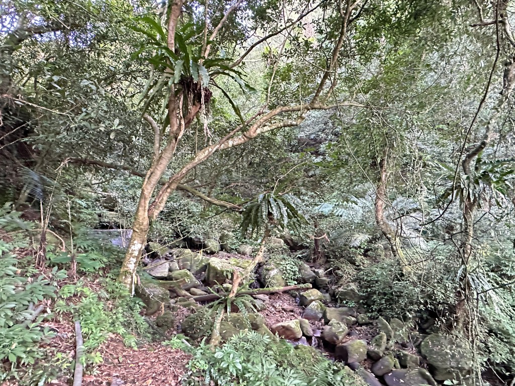 由暗寶劍山下到墓園這一段,芒草有被整理過,但路徑濕滑不算好走!出山徑會接上「蔡潔生墓園」,再沿著墓園公路穿過鐵門後抵達青潭花園寶塔岔,在此左轉入蘭溪,先走約500m的林道,要進入蘭溪前的路徑急左轉會看到一台小型挖土機,穿過挖土機陡下接上蘭溪,由此要沿著蘭溪走900公尺的溪流路徑,必須一路穿梭橫跨於蘭溪兩側且跨越溪石而走,這一段沒有辦法走得快,每一步伐也要小心勿滑倒。