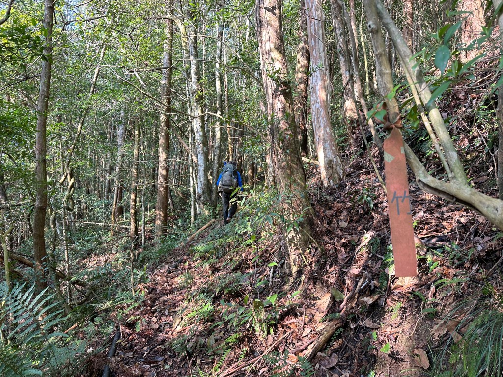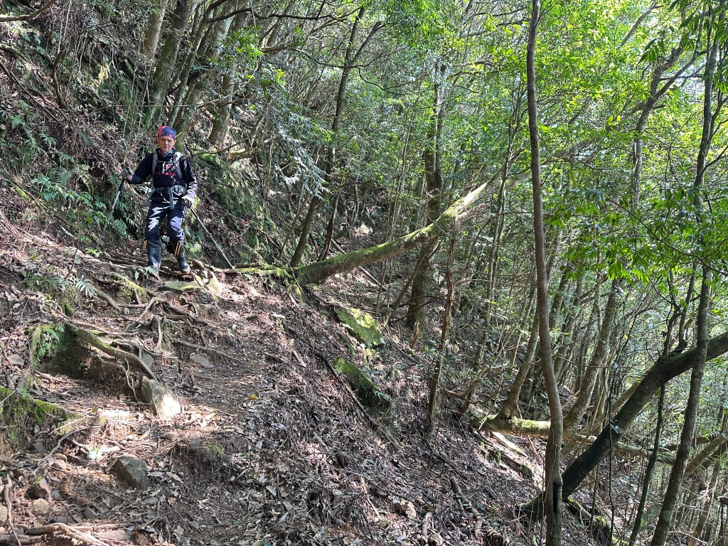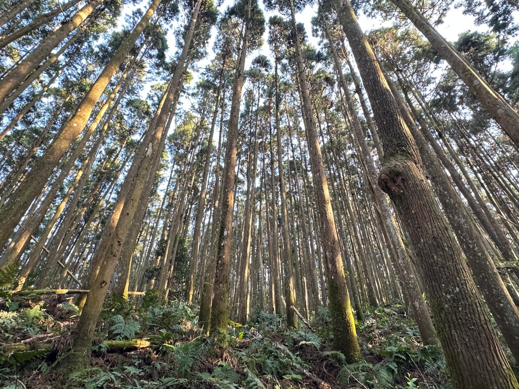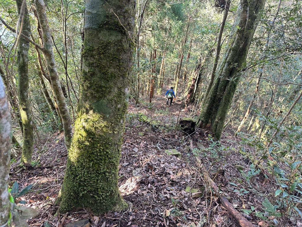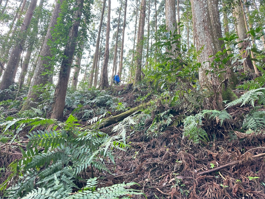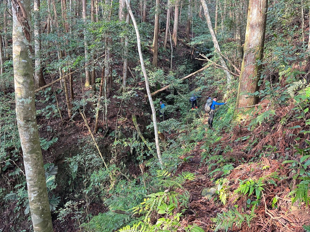 稜線路這一路上,為了讓路徑辨識更容易我們綁了不少的布條,這一路都是走在高大筆直的柳杉林內,看起來甚是優美!如果要由黑森林陡上到小島田山,其實走稜線路就好,這樣可以規避山腰路地形上的風險!