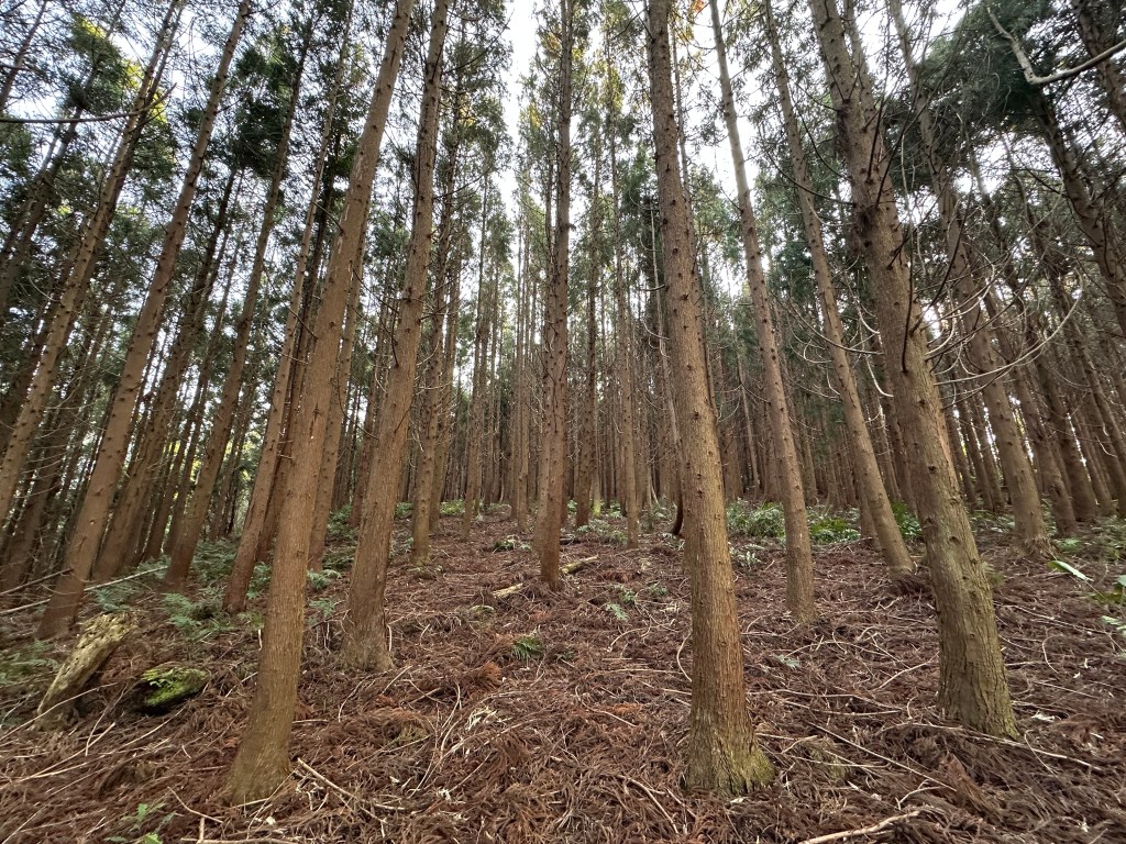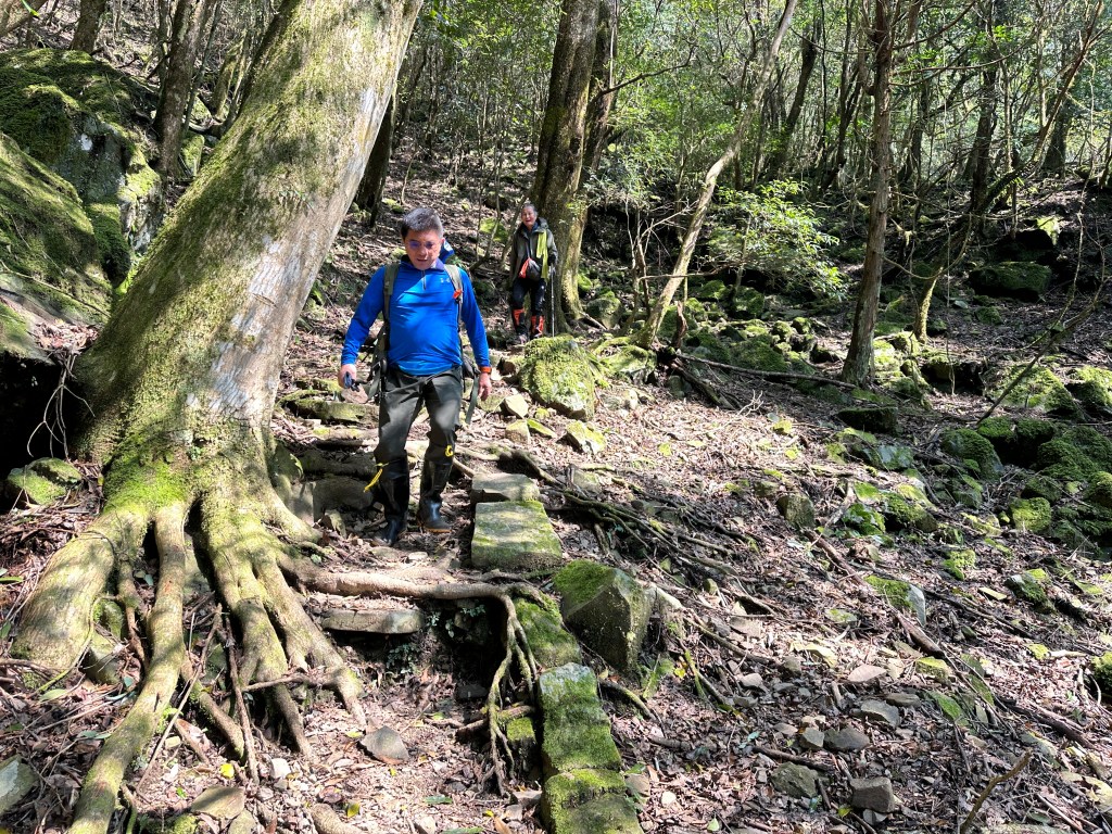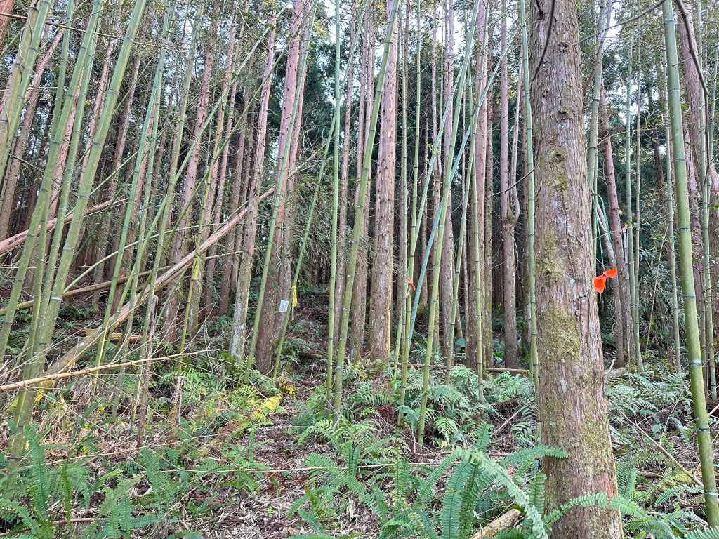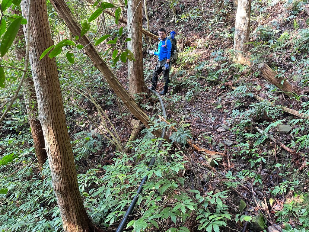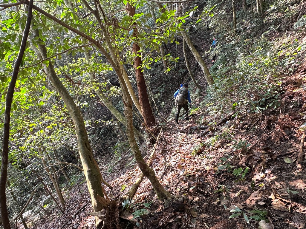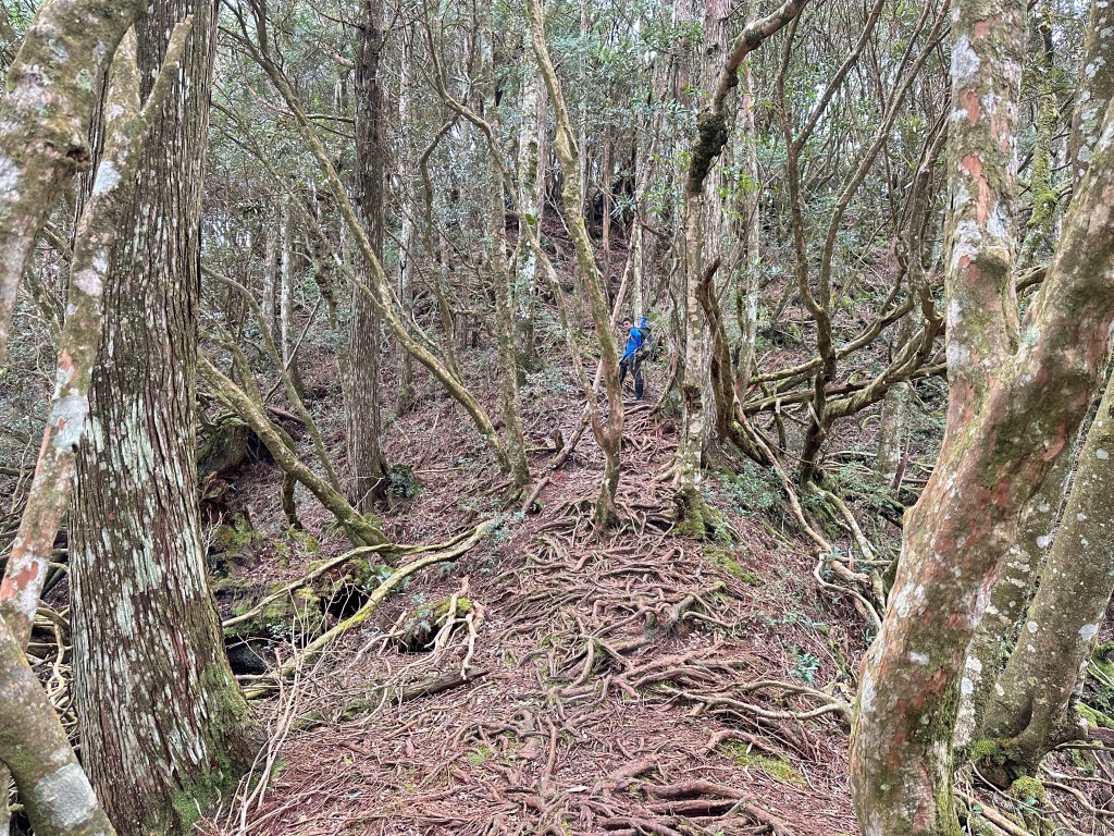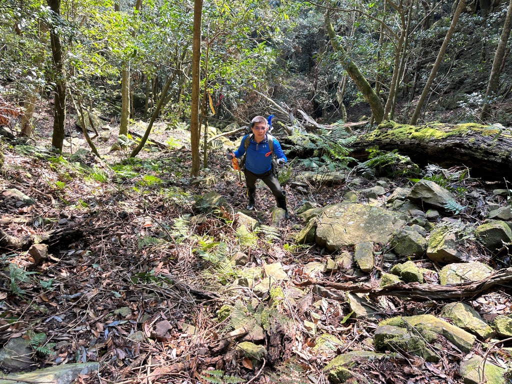 稜線路這一路上,為了讓路徑辨識更容易我們綁了不少的布條,這一路都是走在高大筆直的柳杉林內,看起來甚是優美!如果要由黑森林陡上到小島田山,其實走稜線路就好,這樣可以規避山腰路地形上的風險!