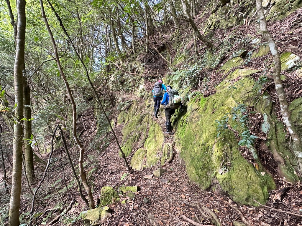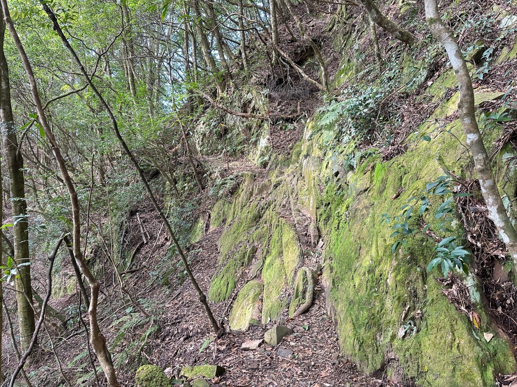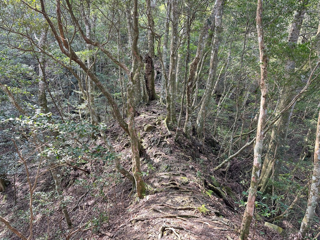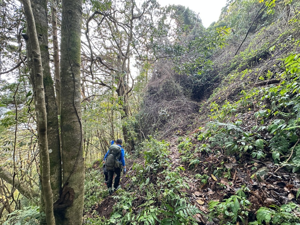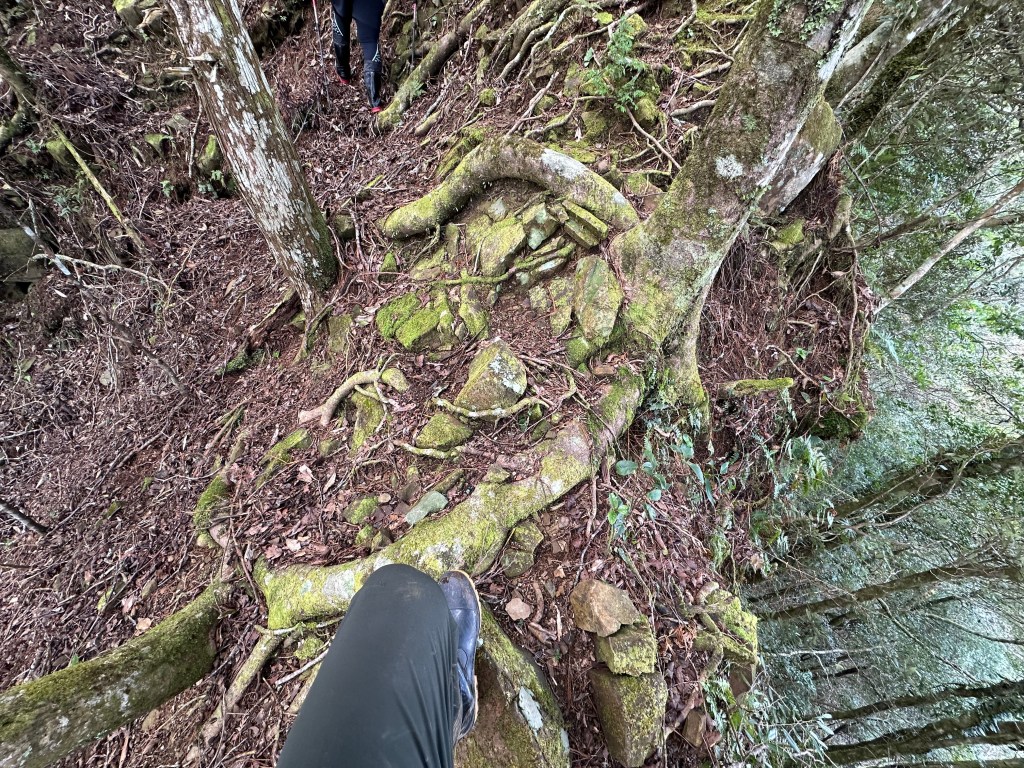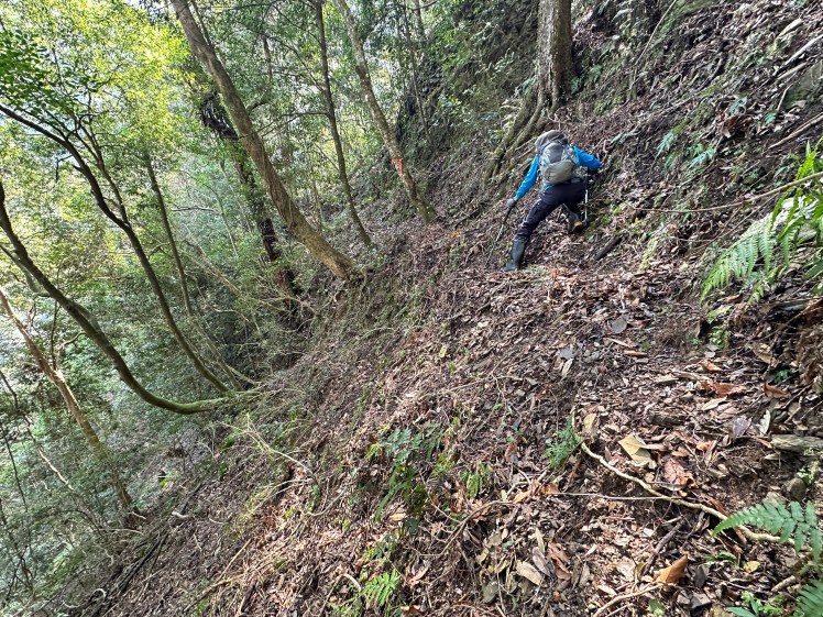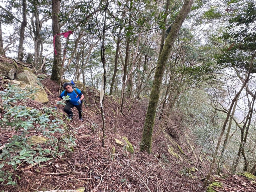 路徑一下子就抽高陡上,邊坡超深,有鐮刀隊以前所綁的繩索,瘦稜陡上到H1487m左右,轉變為70度左右的邊坡超細路徑橫切,邊坡下超級深邃,但路幅只有半個腳寬啊!有繩索,但此段不容易綁繩,所以,繩索稍微鬆散不好抓,我個人覺得蠻怕的。