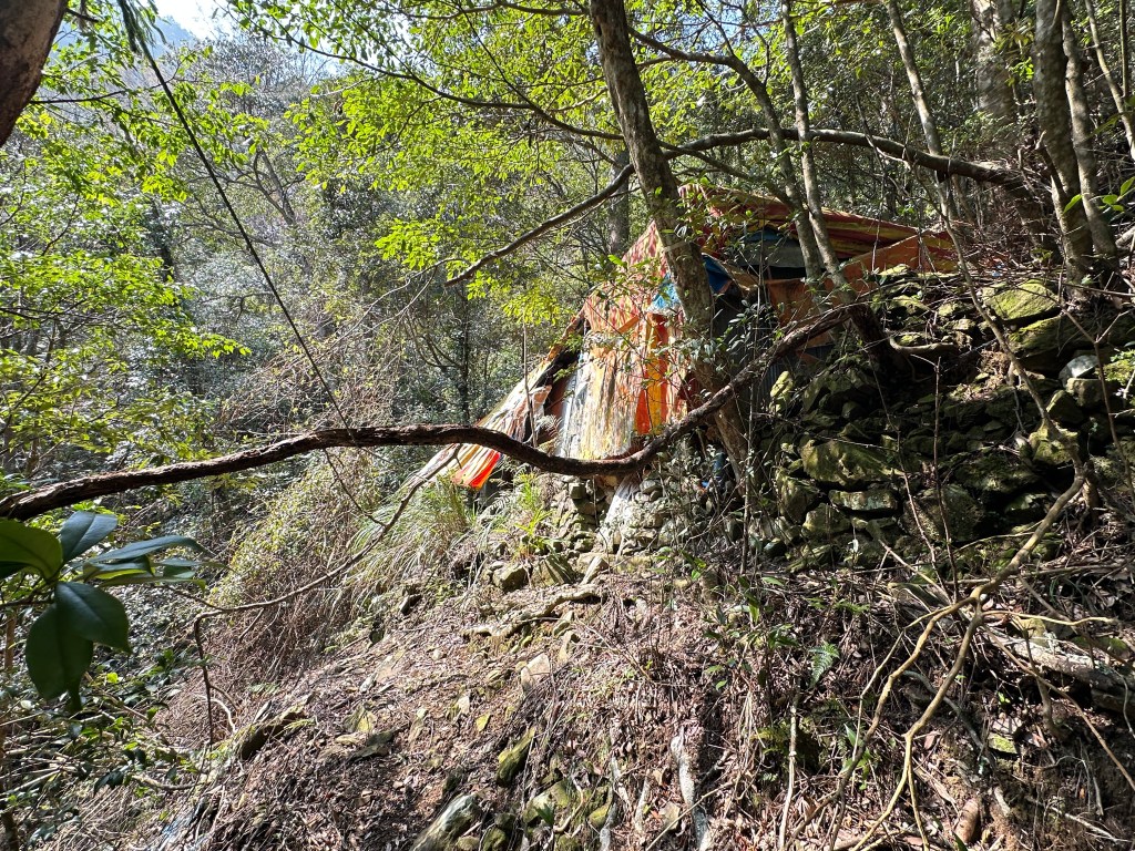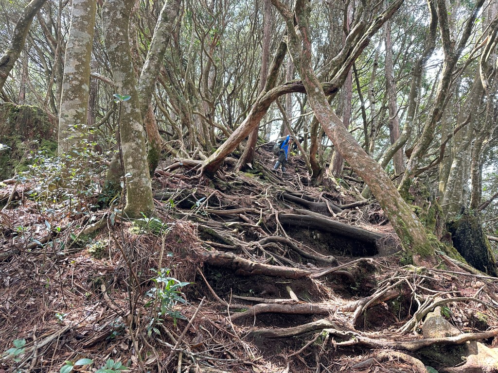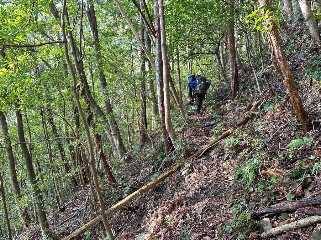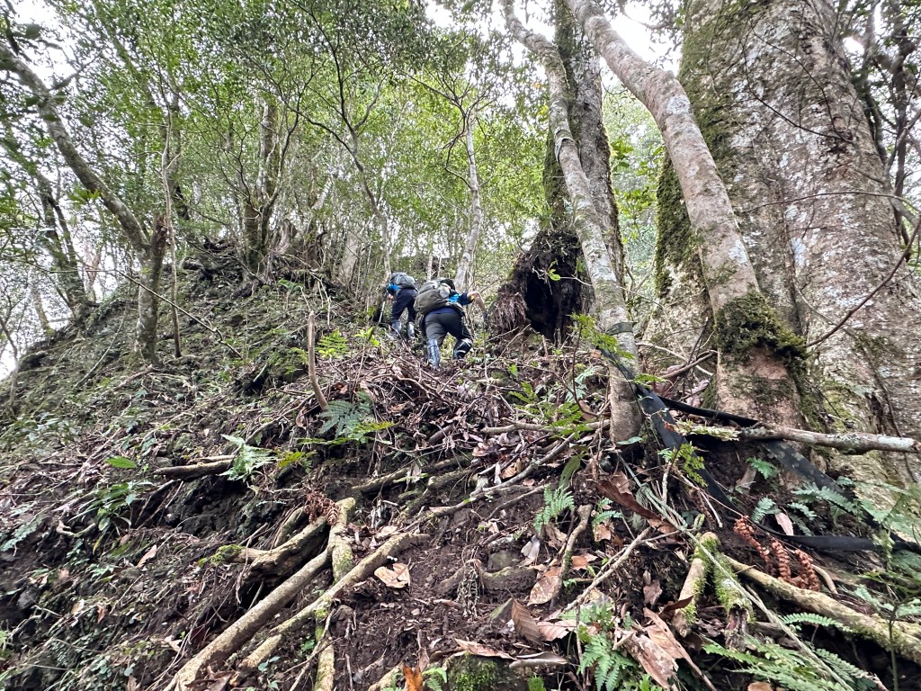 通過後,路徑轉為右上的稜線路,一開始就可以看到左側有一個廢棄帆布工寮,由此工寮一路角度超大的瘦稜陡上,部份繩索不能再使用,因為有些樹頭已經腐朽,馬上,跟在後方的Smile要求拉樹根樹幹陡上