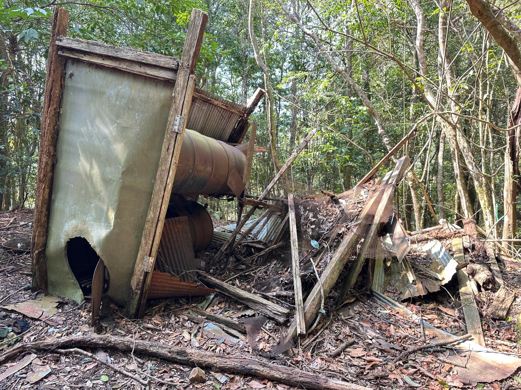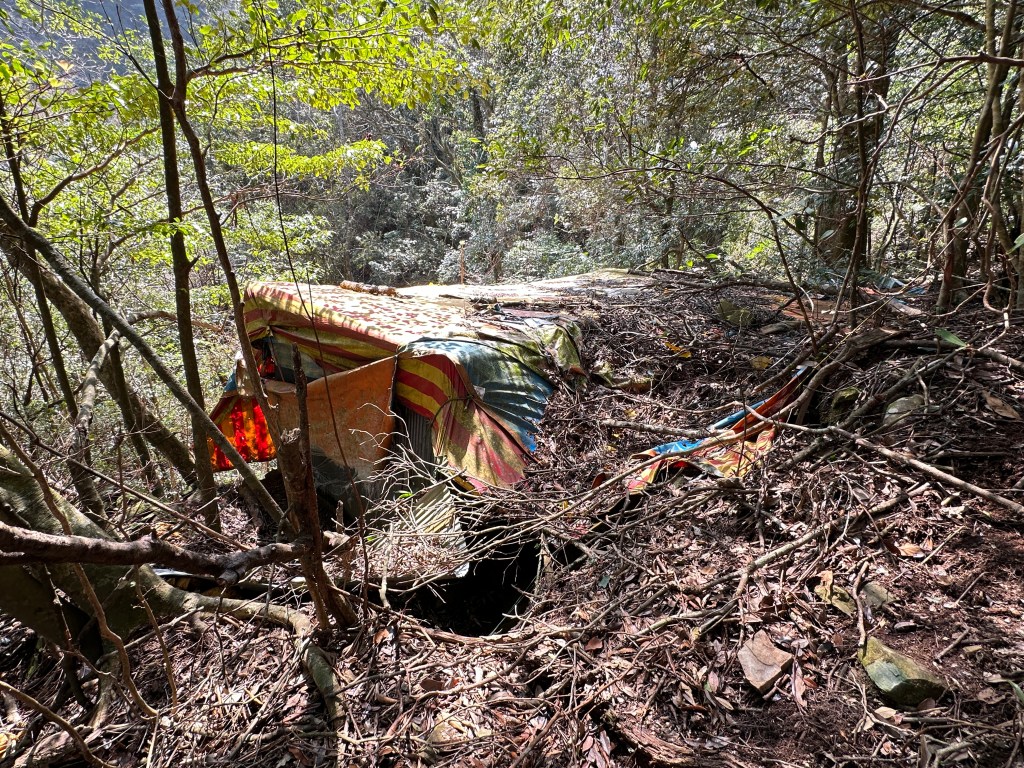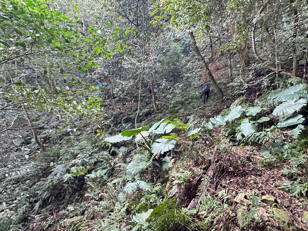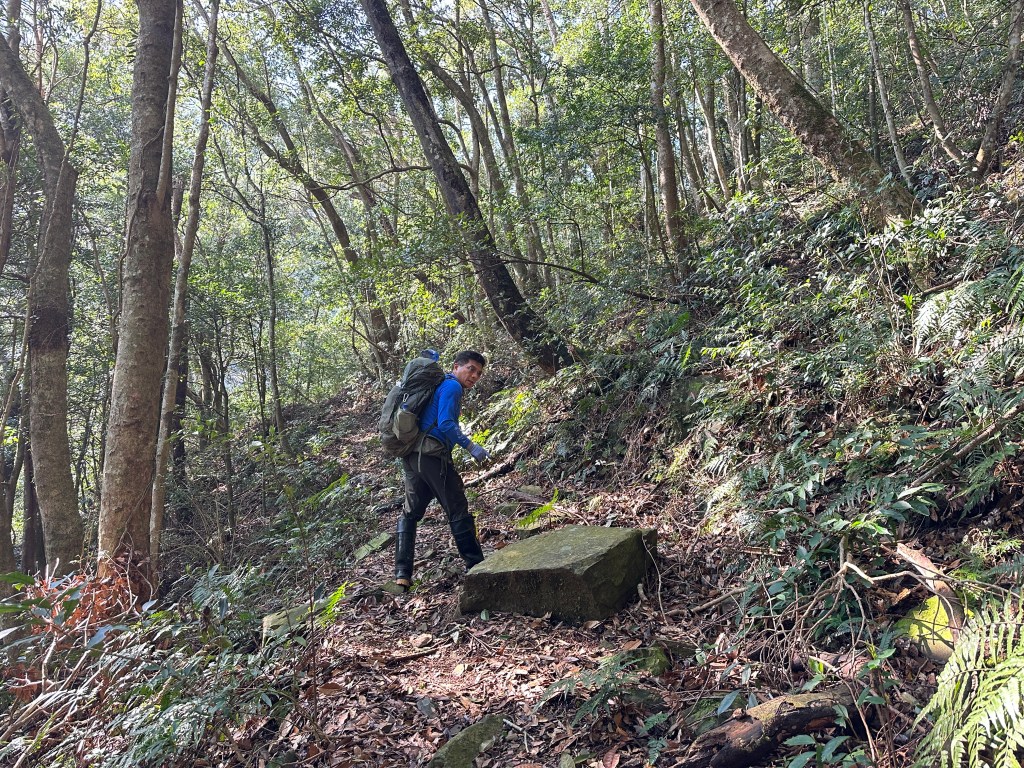 通過後,路徑轉為右上的稜線路,一開始就可以看到左側有一個廢棄帆布工寮,由此工寮一路角度超大的瘦稜陡上,部份繩索不能再使用,因為有些樹頭已經腐朽,馬上,跟在後方的Smile要求拉樹根樹幹陡上