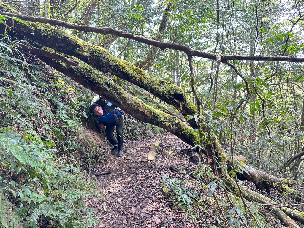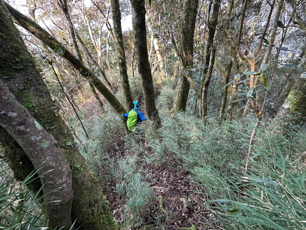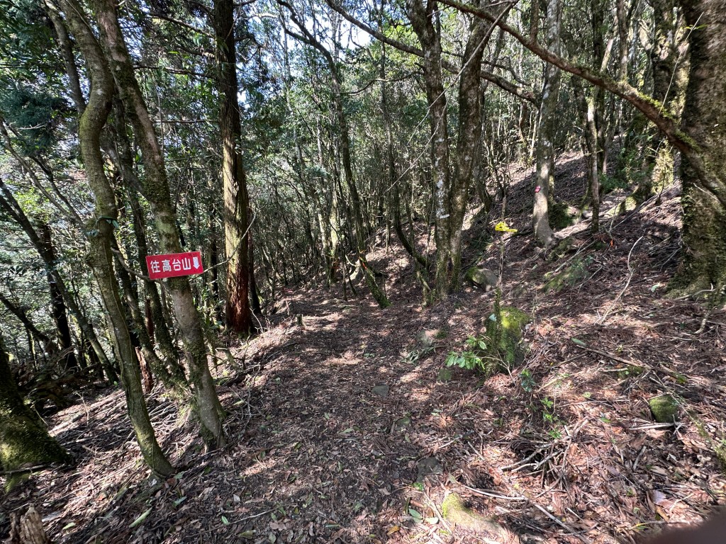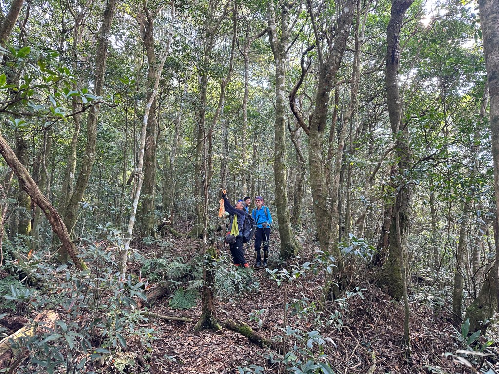 稜線路這一段的距離約有2.4K,其中在H1390m左右會經過黑森林峰,陡下時黑森林峰位於路徑岔出右側20m的小山頭上,由桃園鐮刀隊所命名並做了名牌!