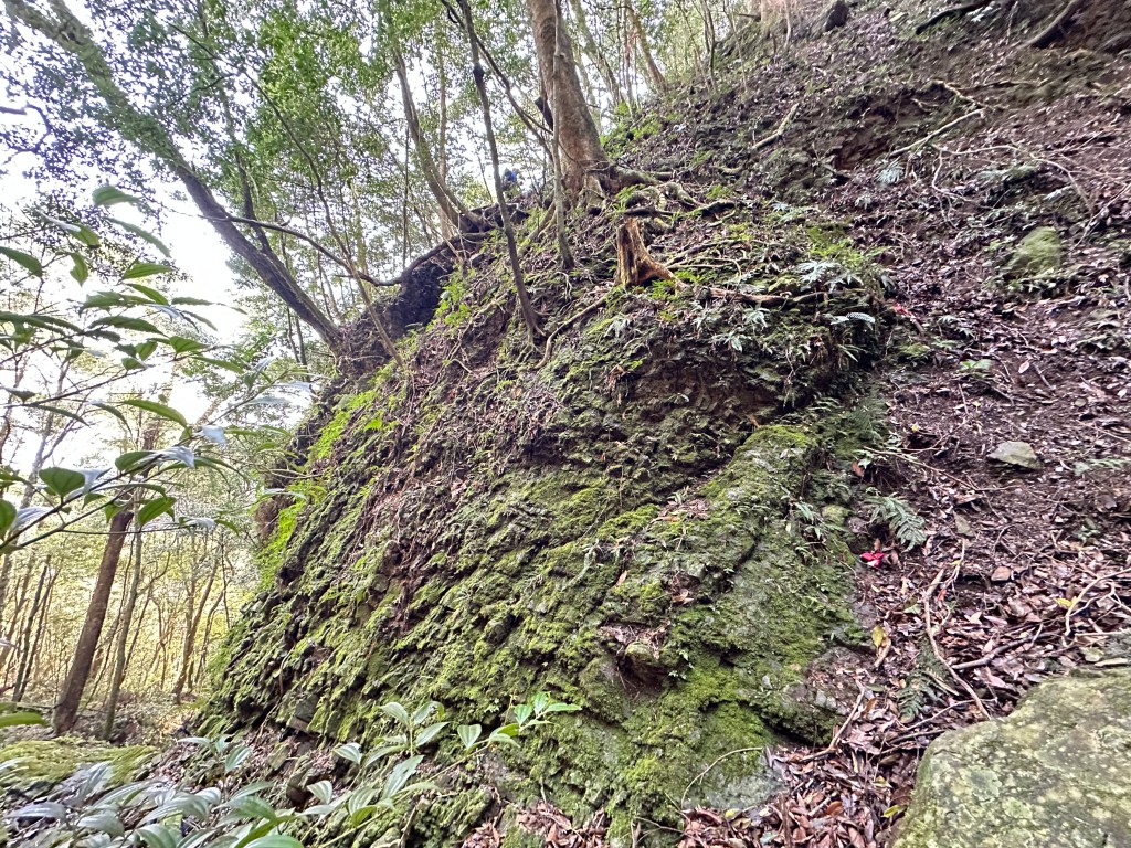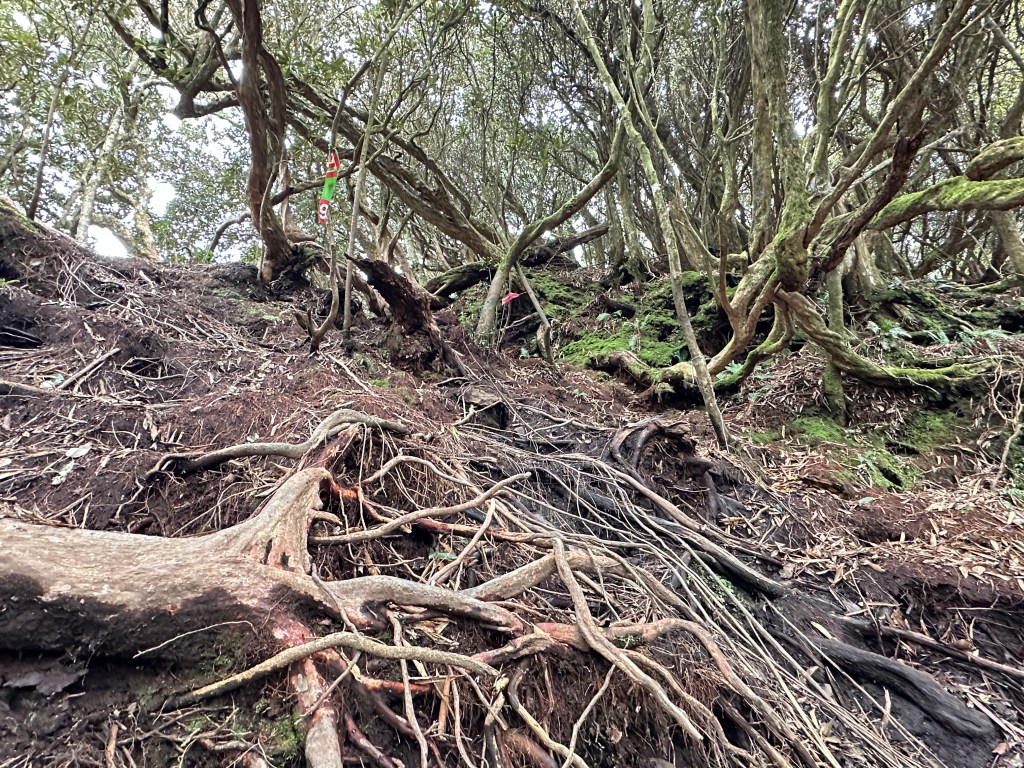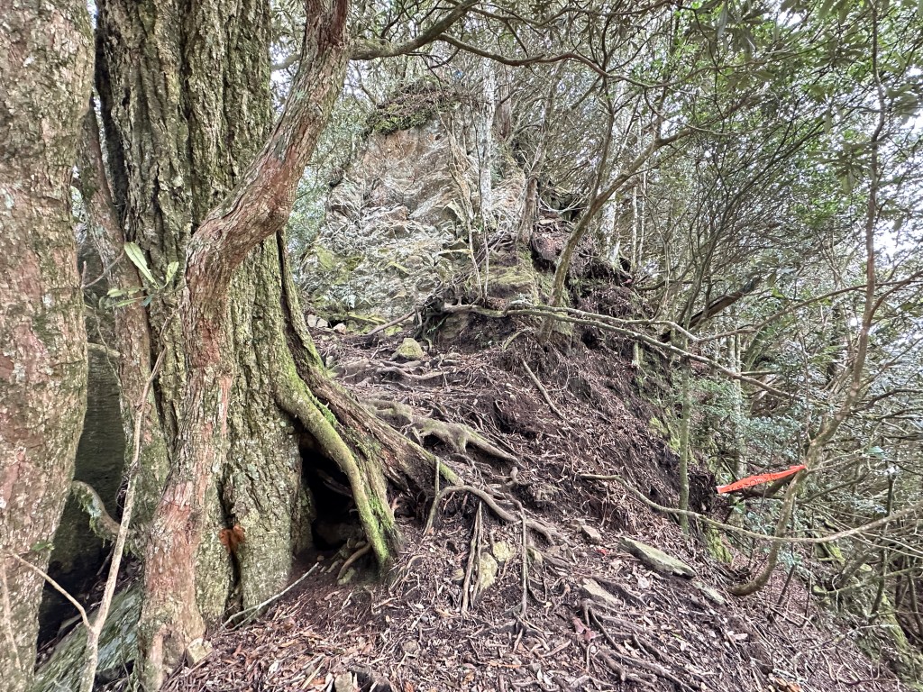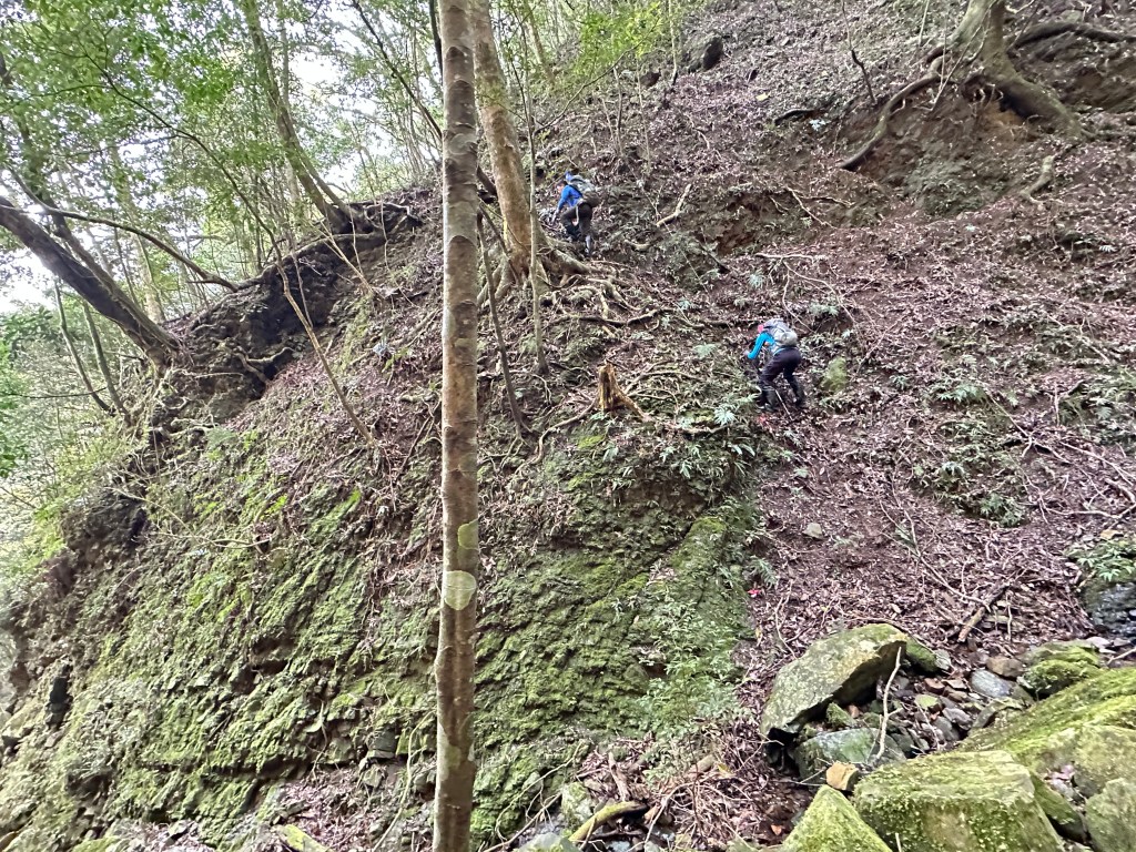 投影片:繞過前方的邊坡路後,就連上了橫切山壁這一段!有繩索,但有些鬆垮,不好拉,因此在最前方還有我(Gosen)幾乎沒有拉,因為路徑幅度超小且土質鬆軟,整個人幾乎要趴在山壁上,在紅色布條後連樹根都找不著!這一段是這一天裡最危險的一段,我認為。09:45