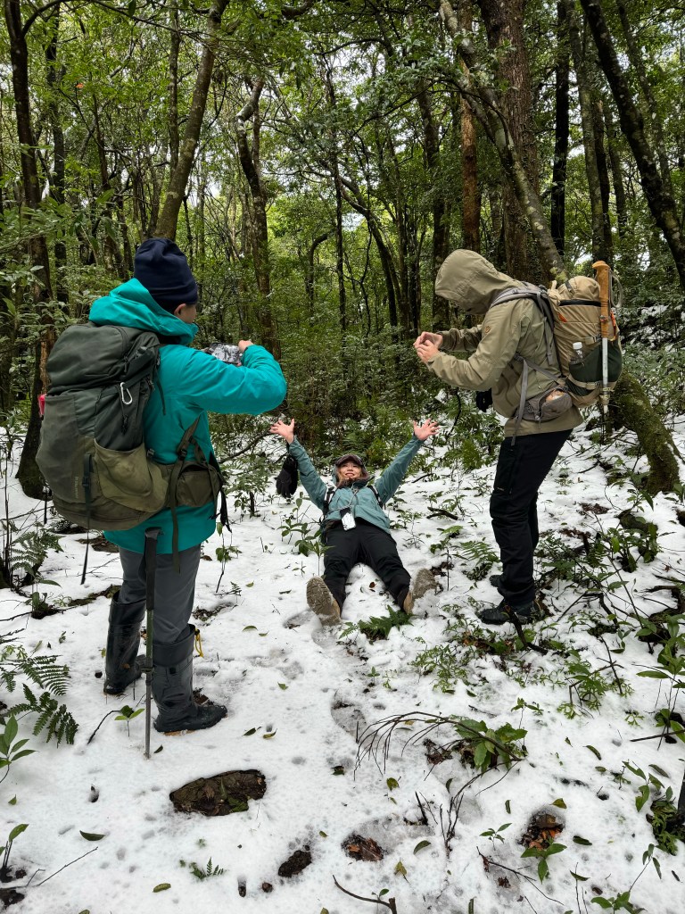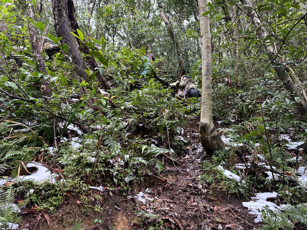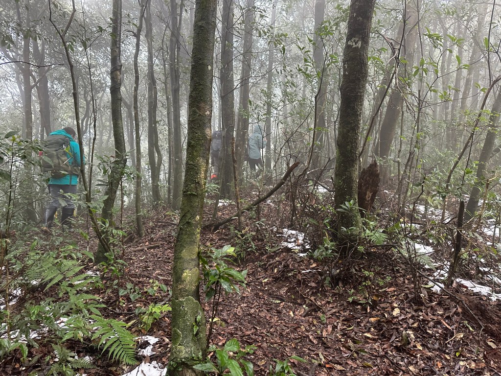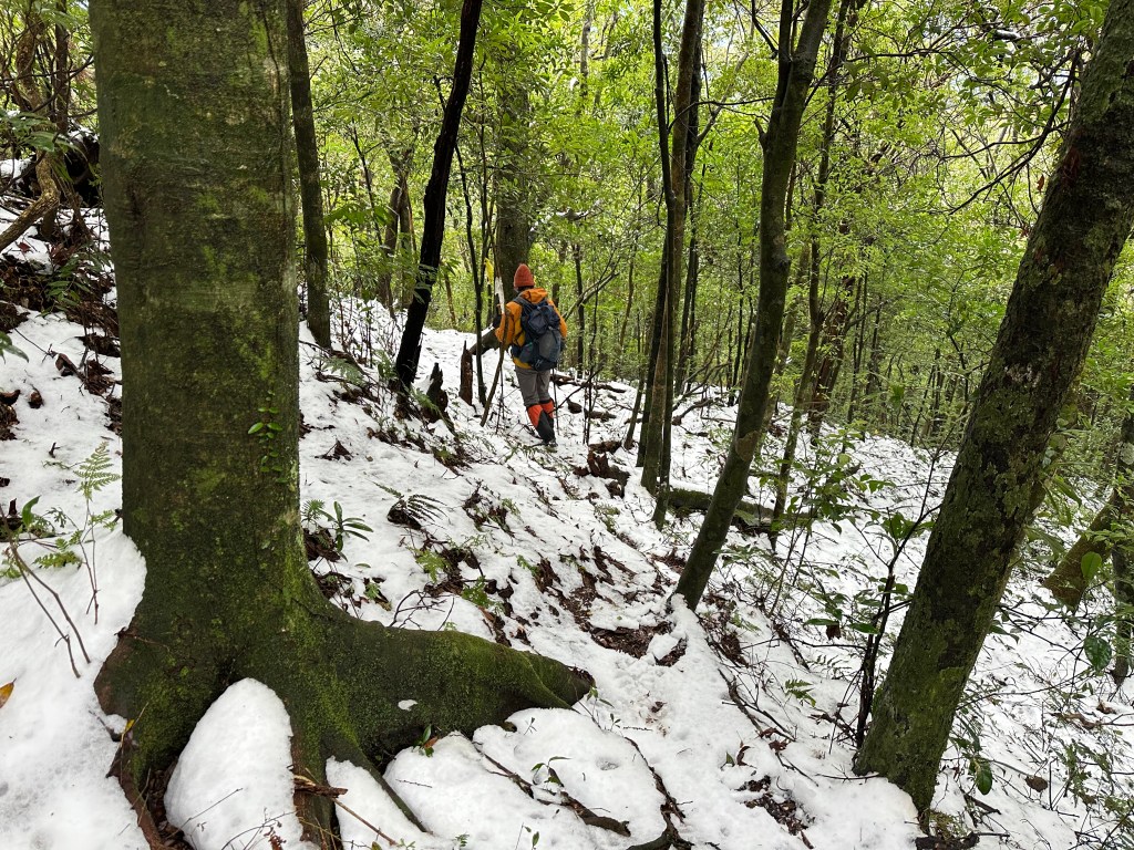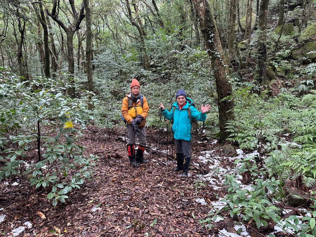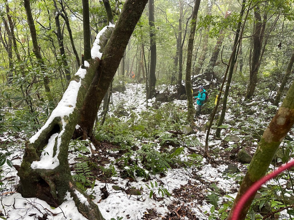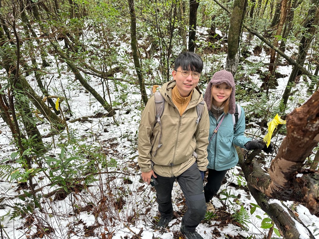 當我們脫離傳統步道開始往南稜線走時,有一些遊客看到,眼神滿是"你們走錯了"的問號?也不解釋了啦,要先走0.8K抵達1205峰的高處,沒有想到,這一段的路徑上是滿滿的雪!Wendy興奮的仰躺在雪地上!我也山寨的模仿一下!這裡是整個行程中雪跡最豐厚的位置!