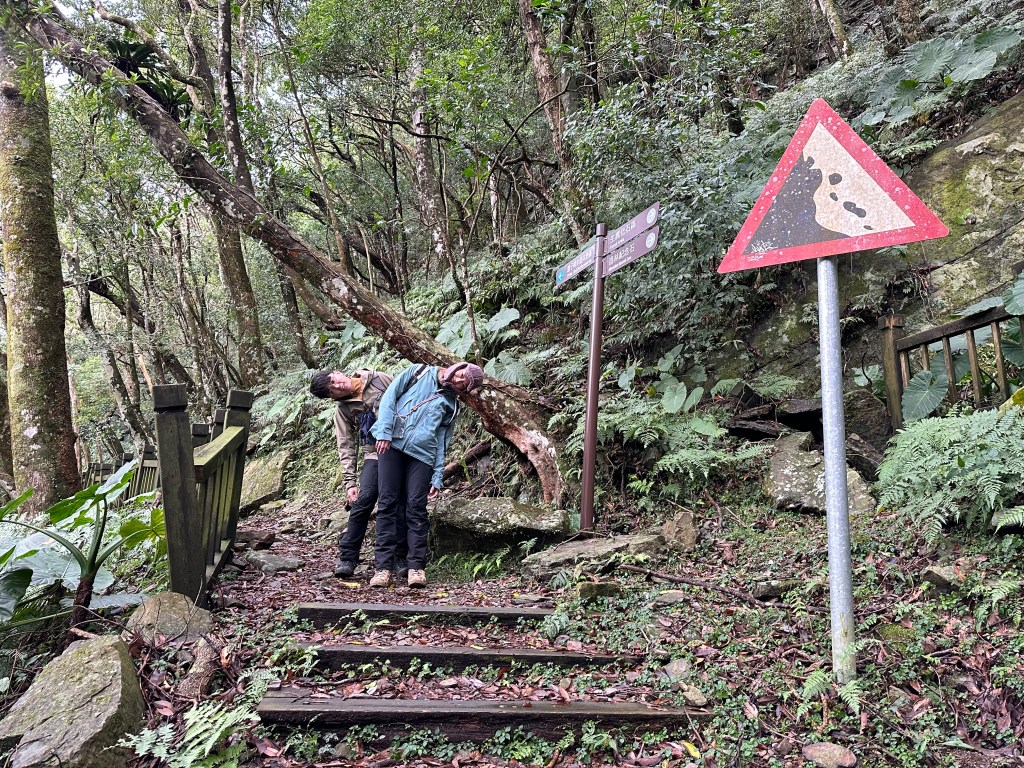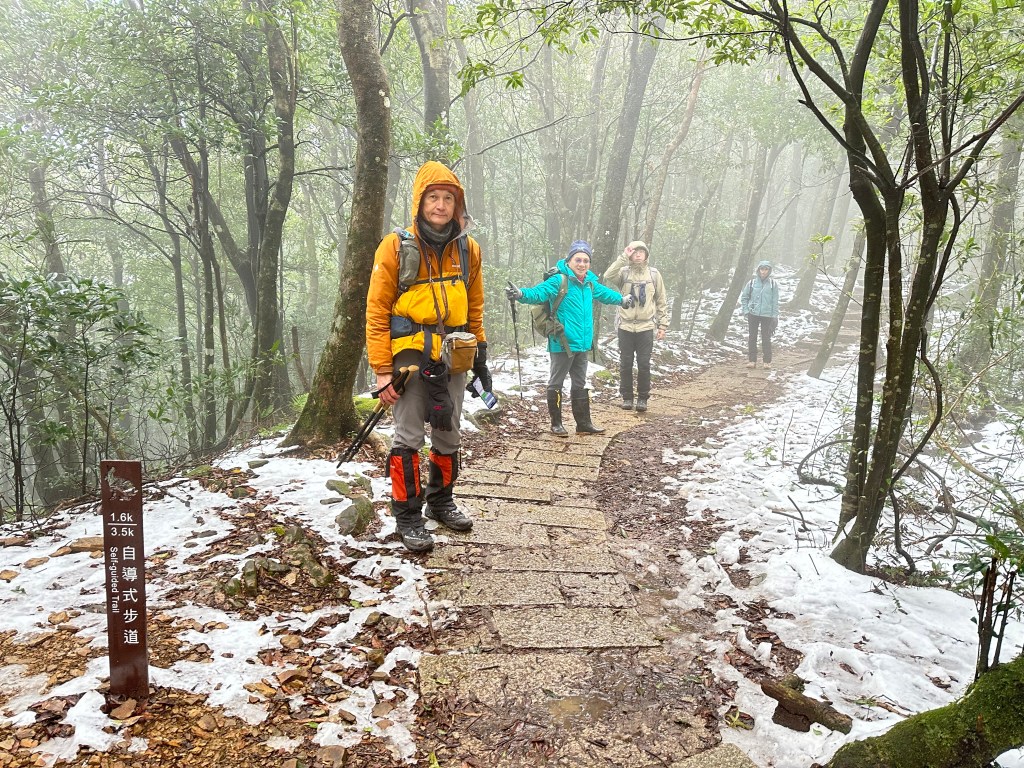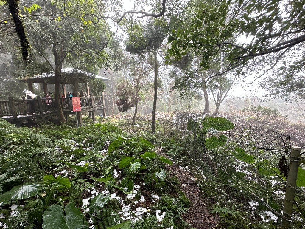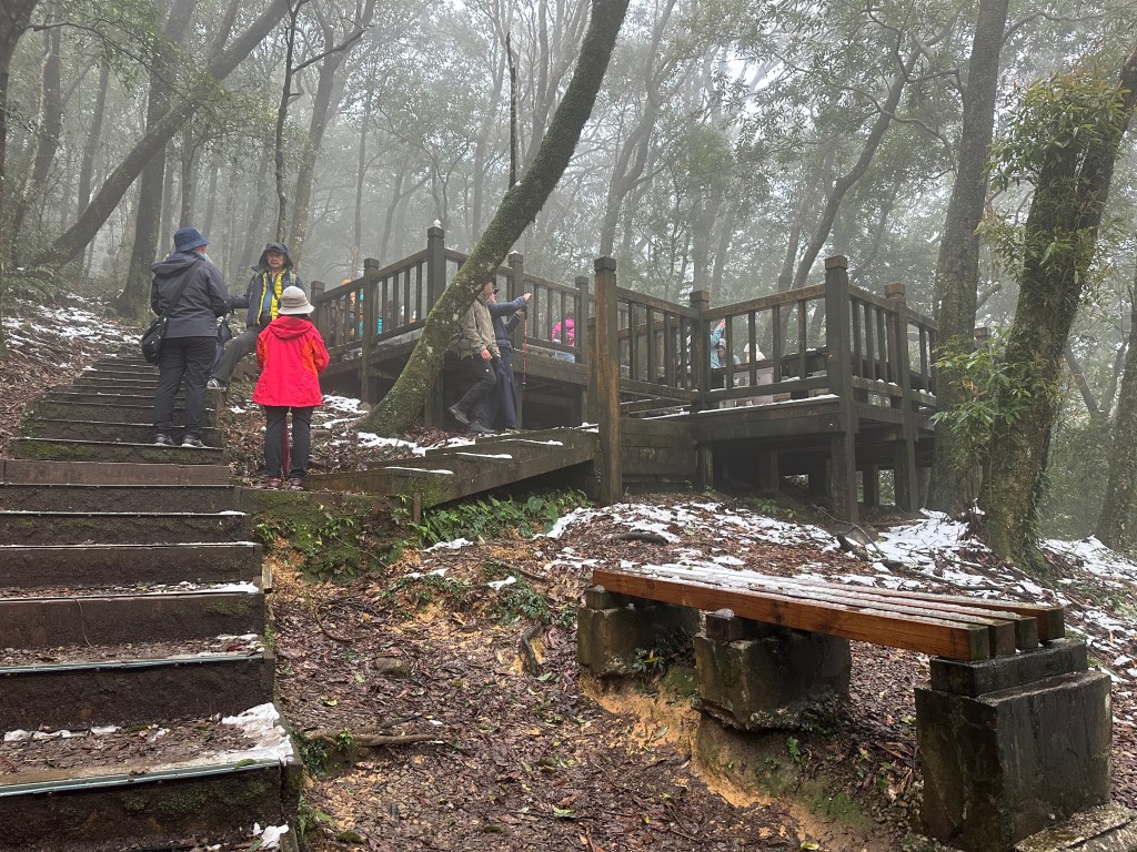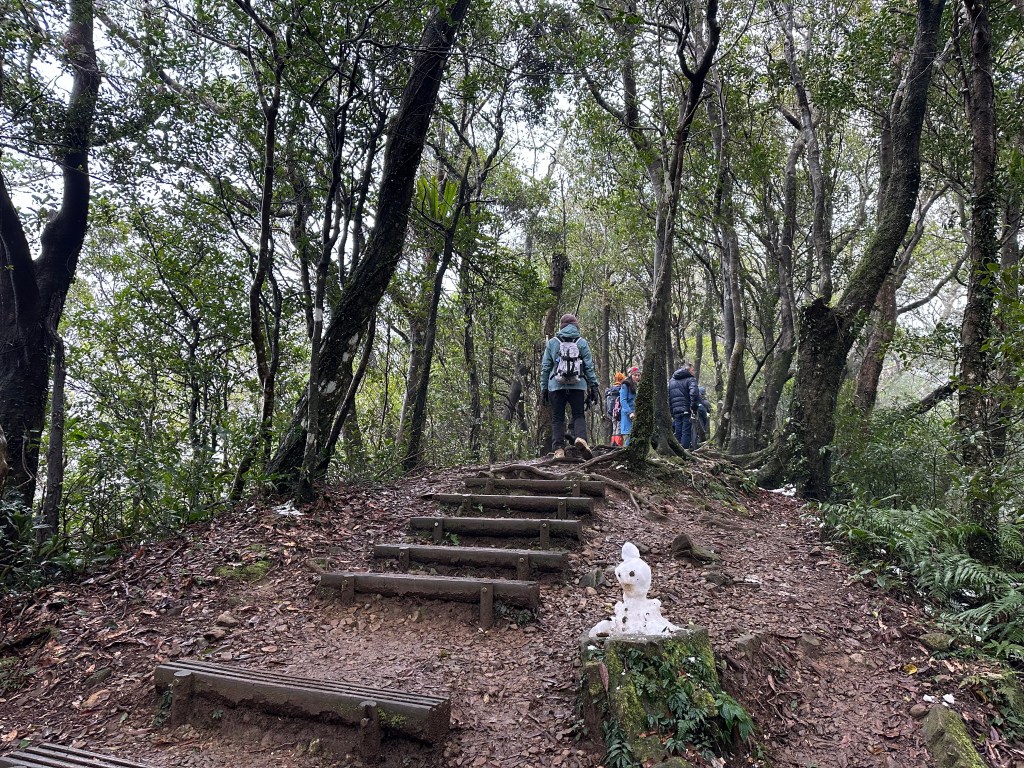 在涼亭H1050m這裡,除步道外,兩邊草叢上雪跡已經不少!接著,沿著自導式步道一路陡上,就會看到不少之前所堆出的雪人,兩側堆雪愈來愈多,超過H1150m後,連步道上也都有一層薄薄的雪冰,抵達東眼山,這裡的人潮雖不算多但也一直接湧而至。