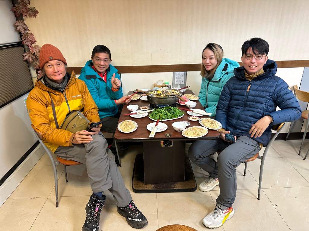 24日這一天仍然超寒冷,一行人開車到大溪,吃了一頓薑母雞,先去去寒再說!Smile與我今天穿雨鞋,走在雪地裡可以防滑,但是不太防凍!或許需要穿上兩層的羊毛襪!但是,David、Wendy與Link三人穿的是登山鞋可以防凍!給朋友們參考!