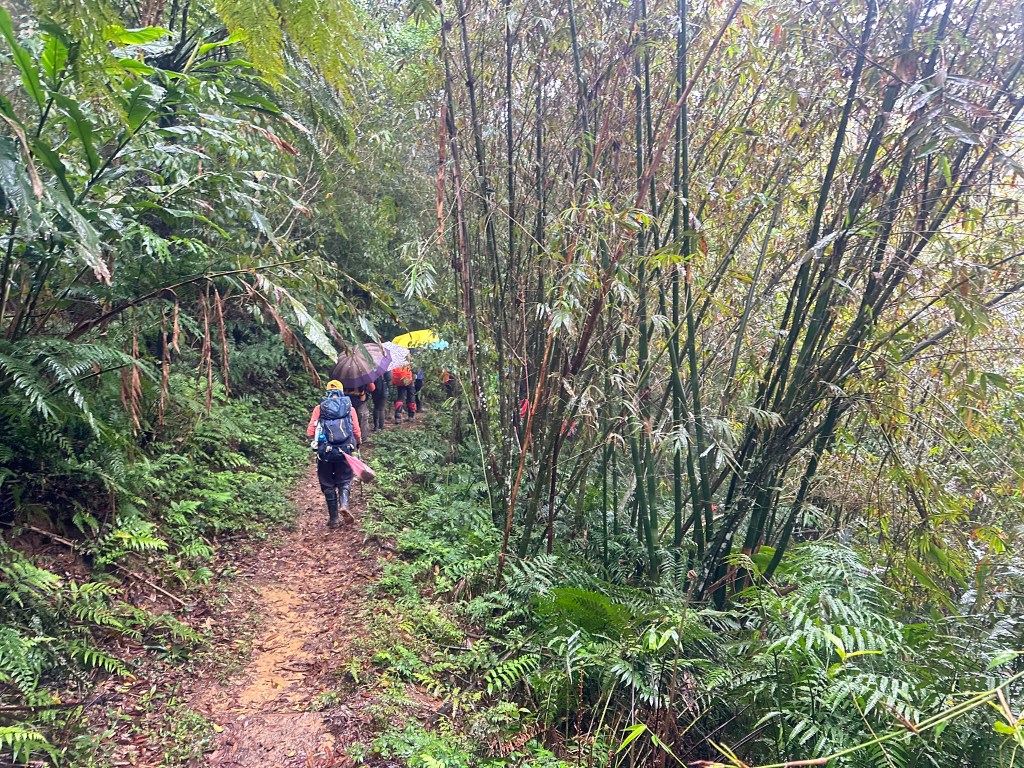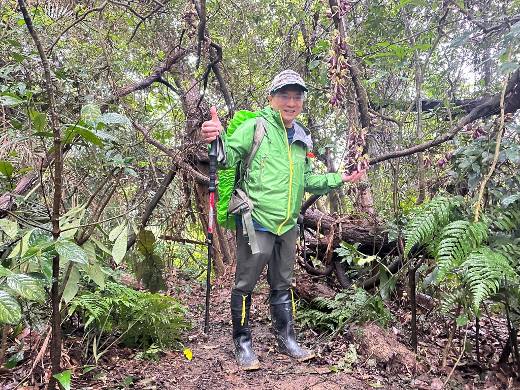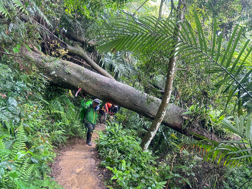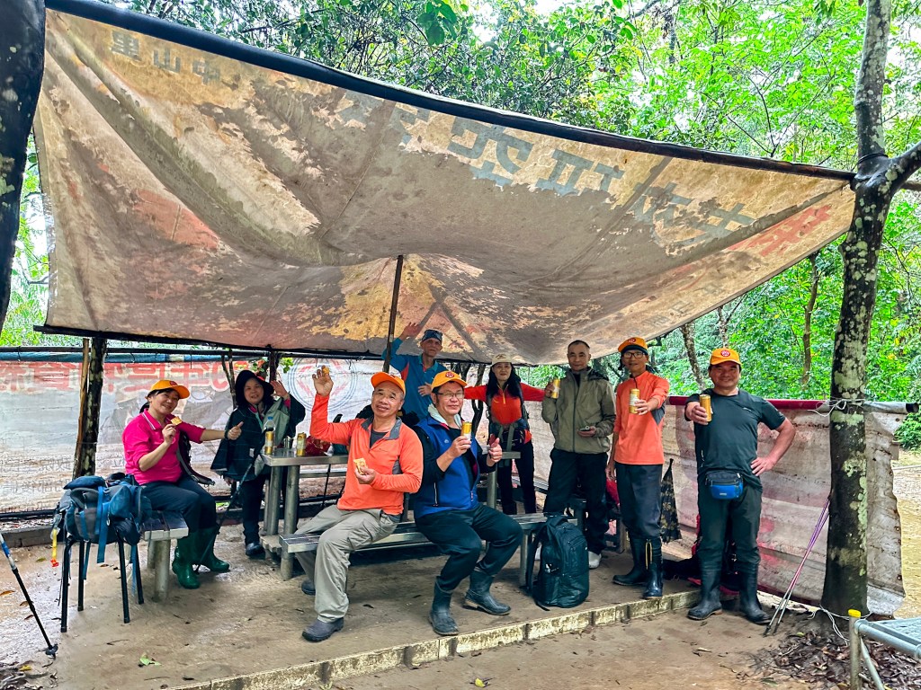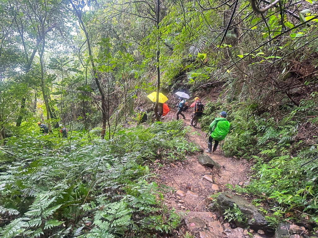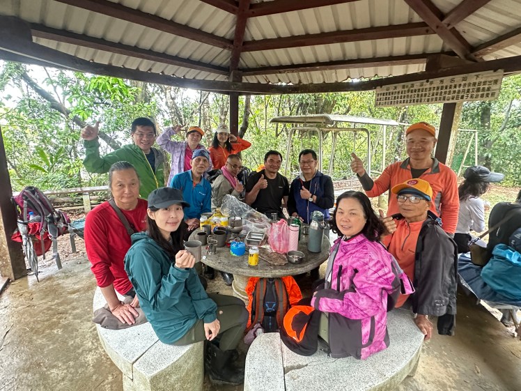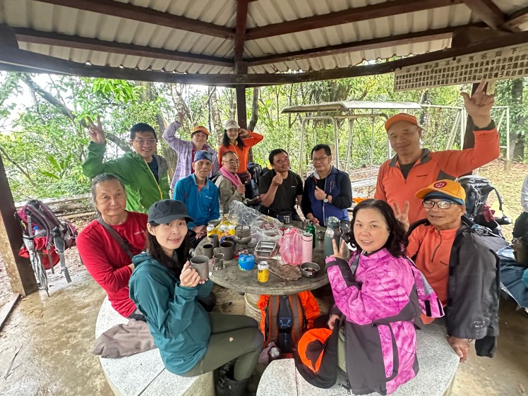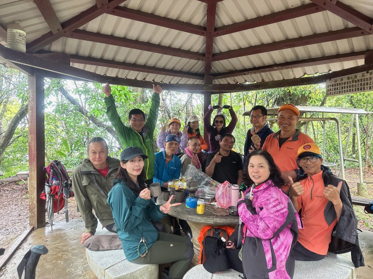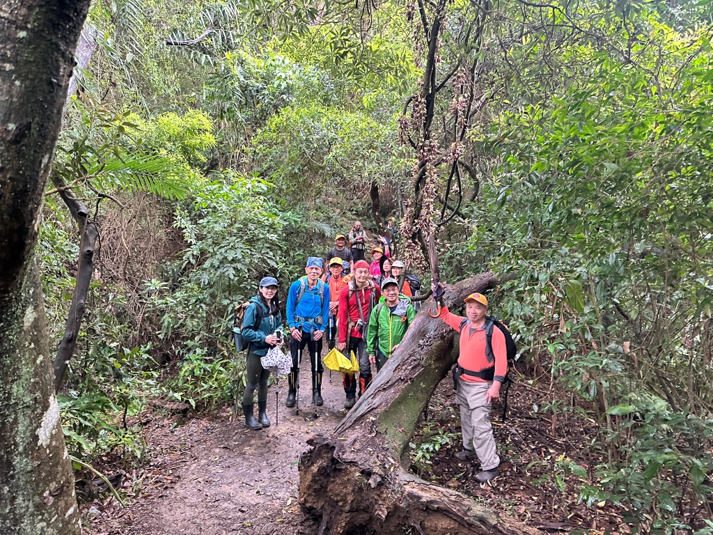 接著,就由鐮刀隊彭帥帶領我們一路繞出不少O型路線,沒想到?溪洲山也能這樣走?在接近溪洲山前有出現一些血藤,但連兩日的大雨,已經將大半的血藤給打落在地!一行人走到溪石亭午餐,大休了2小時(10:19-12:27)。