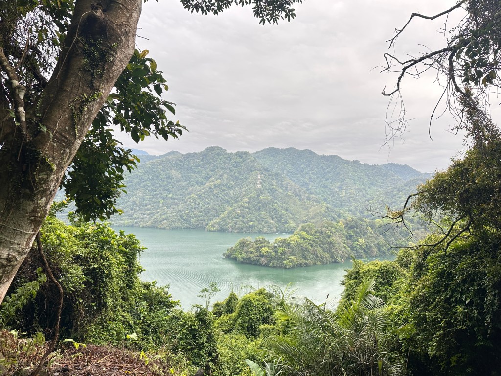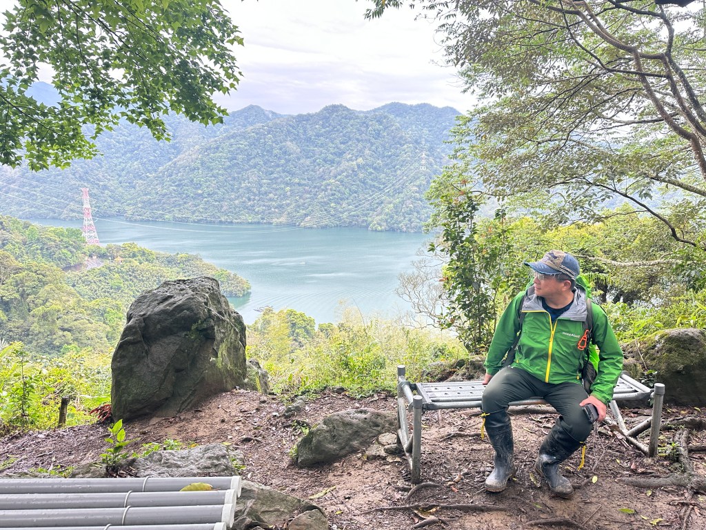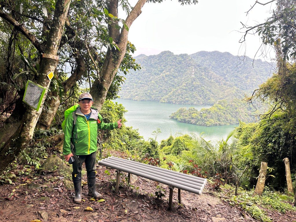 上圖:離開新溪洲山,繼續前行走200公尺,就會來到這處觀景台,此時雨停且陽光開始忽隱忽現,石門水庫變得清朗許多。Smile跟我(Gosen)在此停留十幾分鐘。16:03-16:16