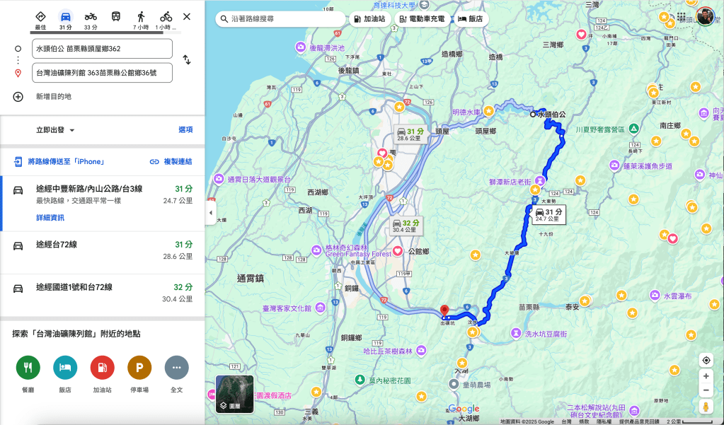 我們是準備兩台車相互接駁!一早都先開車到明德水庫水頭伯公,流一台車在這裡,在搭另一台車到台灣油礦陳列館,陳列館旁有兩層樓的停車場,底層算是室內、上層是戶外停車場,其中上層有廁所可用。