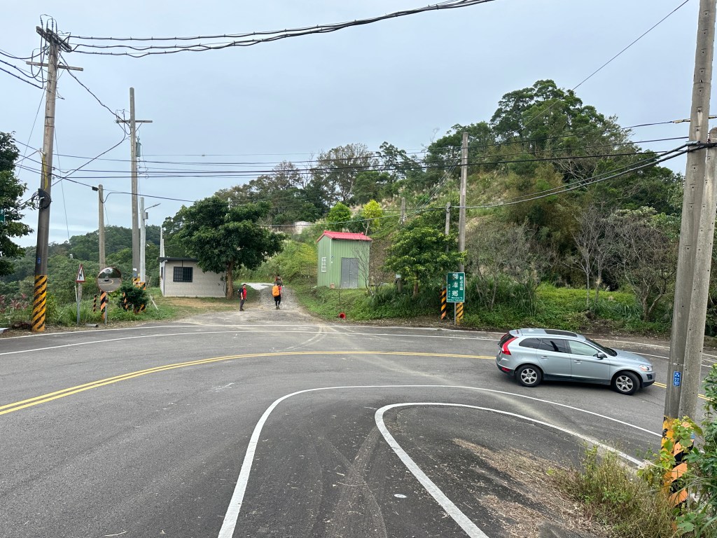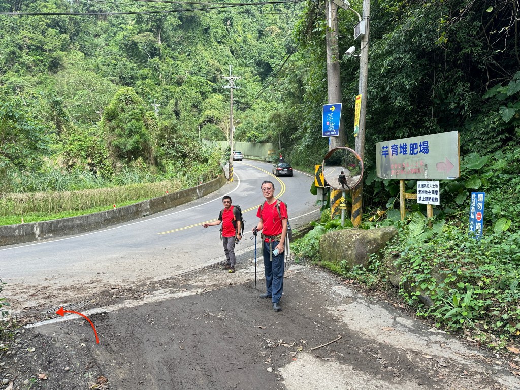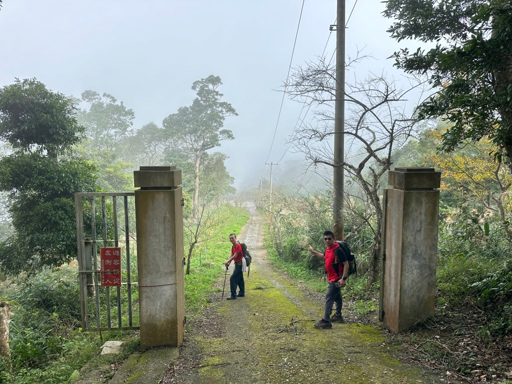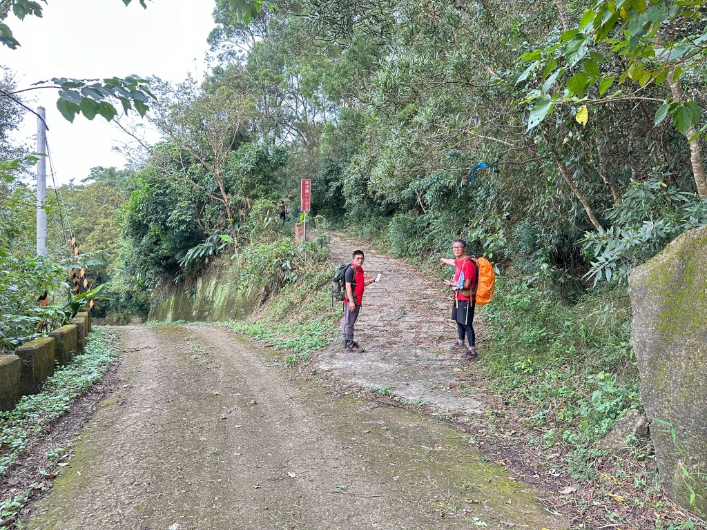 我正在說,記得這個露營區路口有警報器?耶!我們就剛好跨過,警報器鳴叫了一陣!抵達沖庫山,回走100m,由斜坡陡下接上產業道路,接著走3.5K一路陡下,到最低海拔H260m的茄苳老樹福德祠,再由此一路沿著產業道路陡上到H488m,接上龍骨古道。