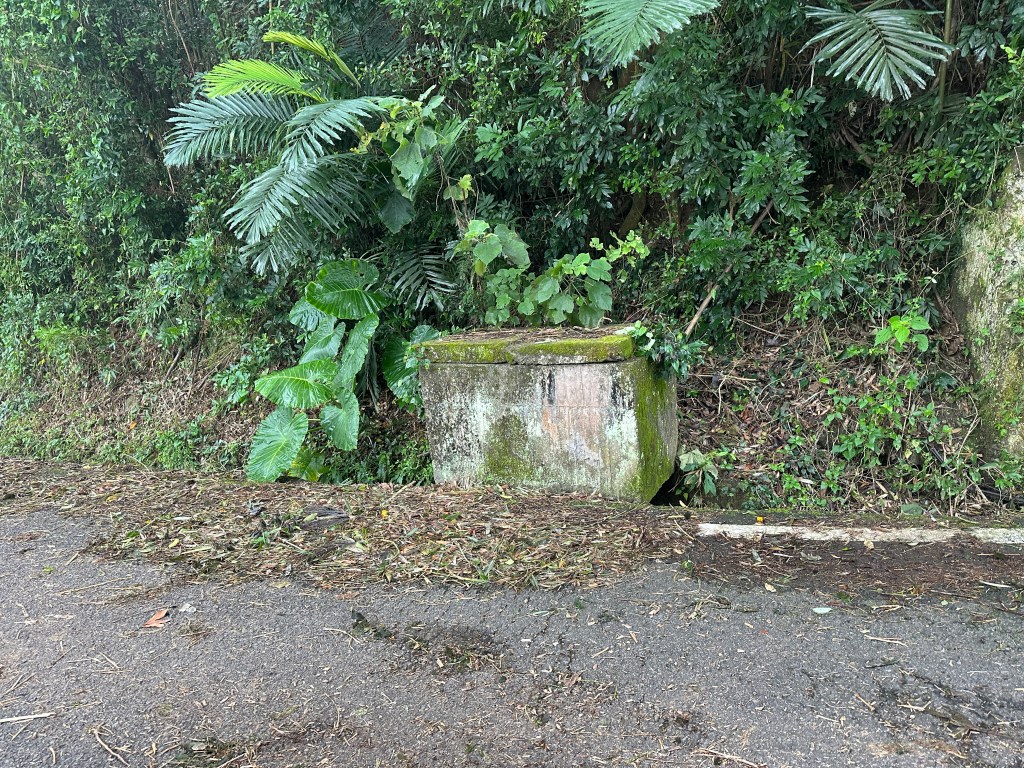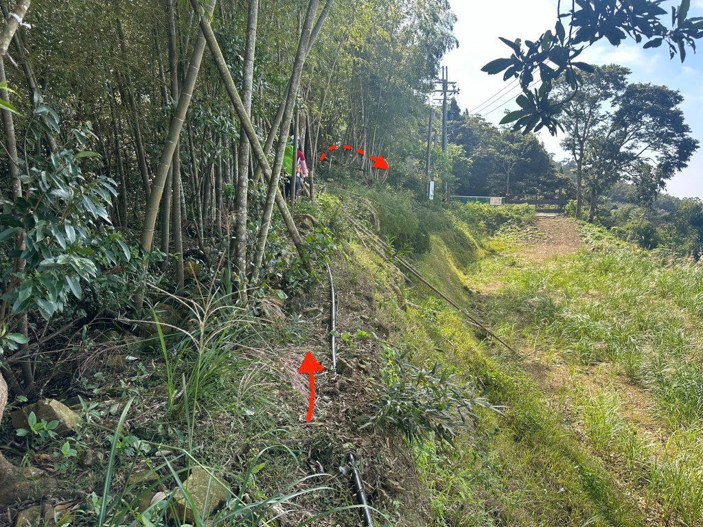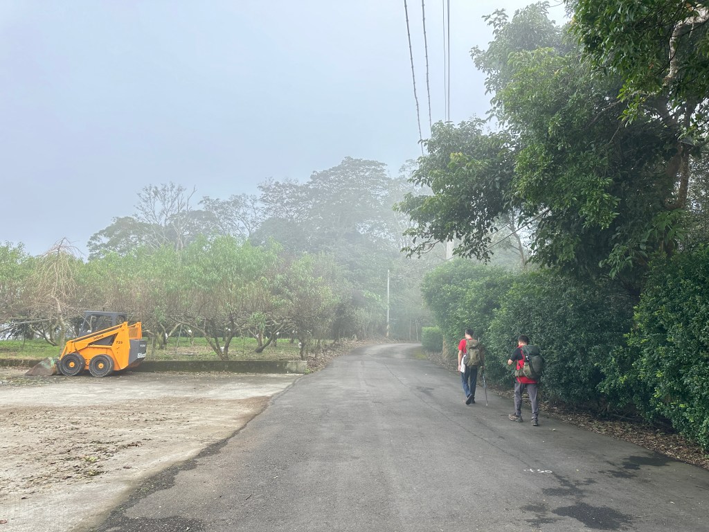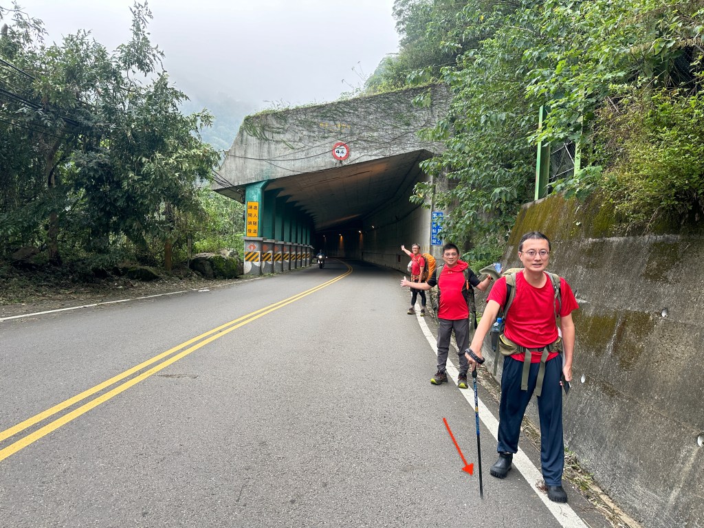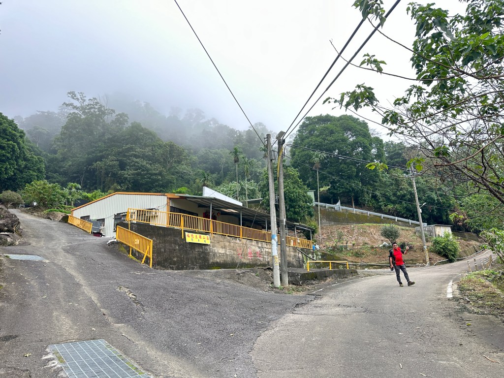 我正在說,記得這個露營區路口有警報器?耶!我們就剛好跨過,警報器鳴叫了一陣!抵達沖庫山,回走100m,由斜坡陡下接上產業道路,接著走3.5K一路陡下,到最低海拔H260m的茄苳老樹福德祠,再由此一路沿著產業道路陡上到H488m,接上龍骨古道。