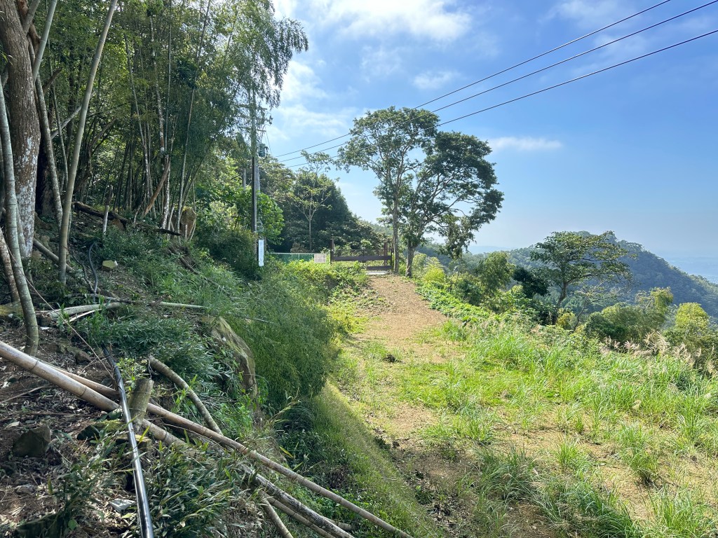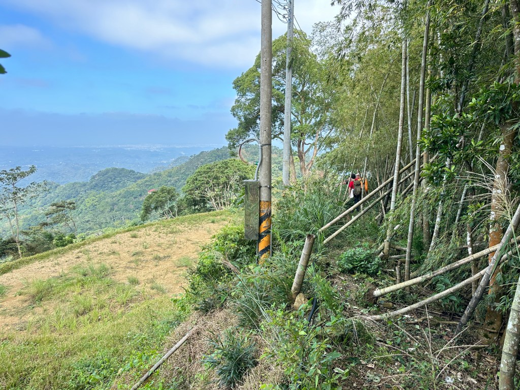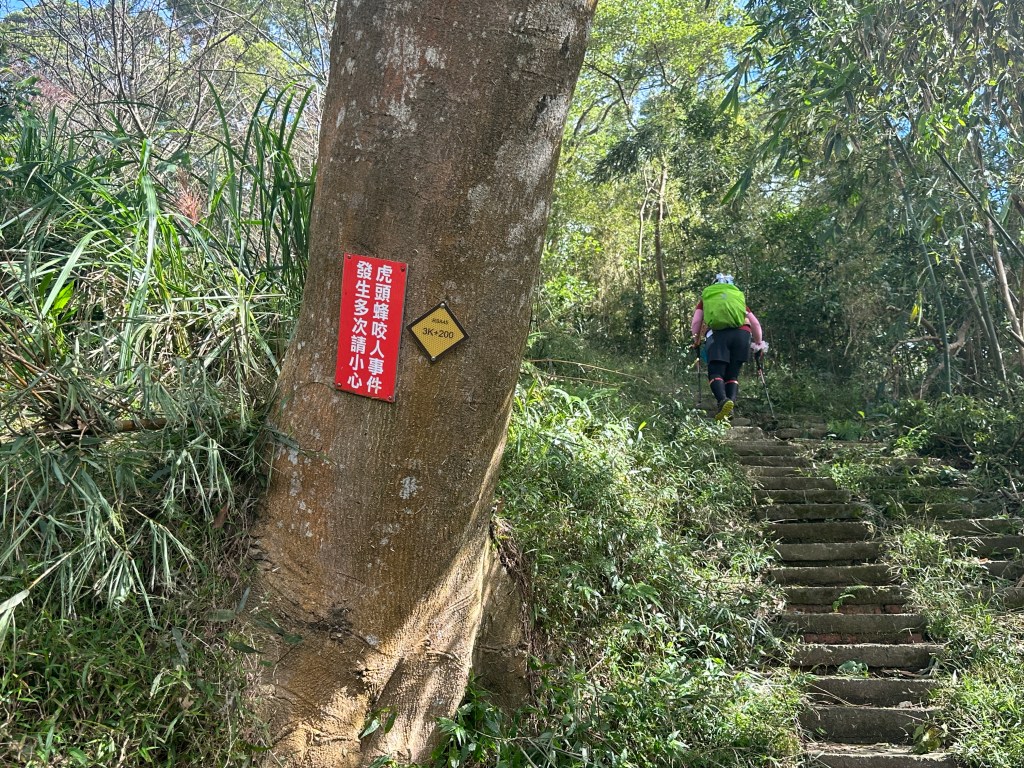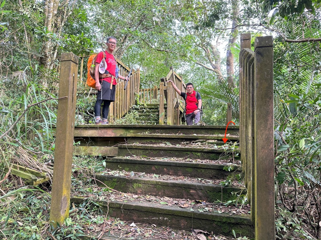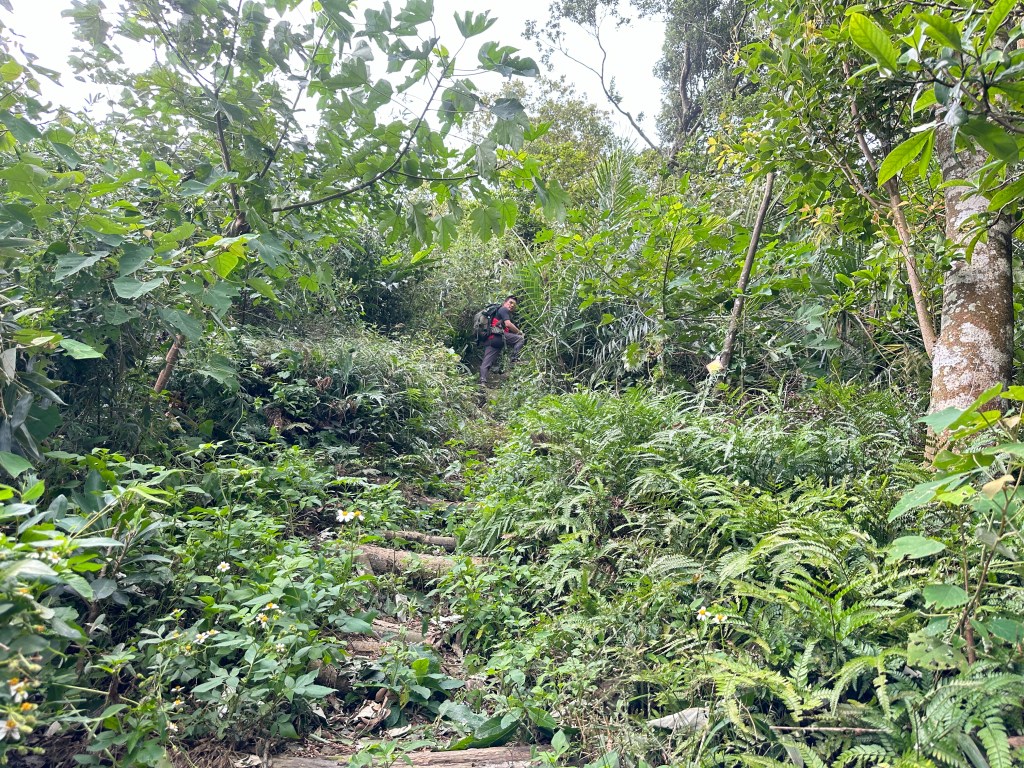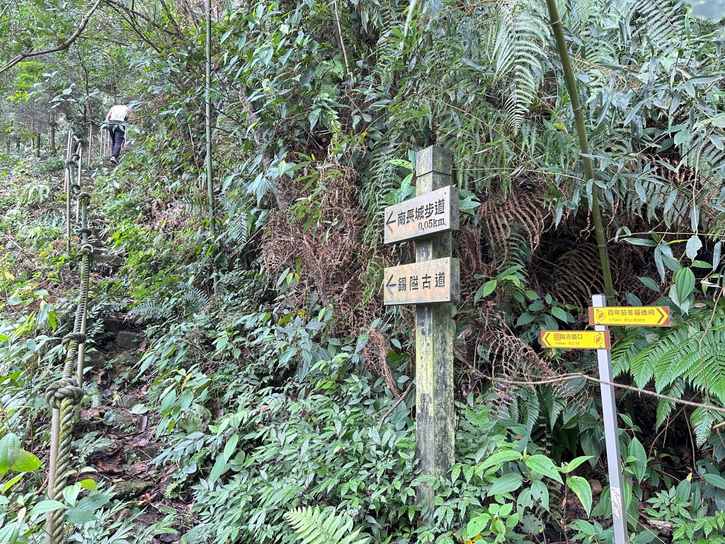距離有3.4K,也是一段深V地形。但因為都是較為熱門的路線,路徑條件都很好,先沿著南長城步道陡下走1.4K來到雲洞宮。再來!沿著苗22線陡上1.3K抵達9K處,切入山徑,持續沿著北隘勇線走800m,陡上木梯前可以看到嬲崠茶亭(嬲:ㄋㄧㄠˇ,客家音ㄌㄧㄠ),最後陡上200m的木梯超陡上到蕃子寮山,因為這一次的颱風,這段木梯上有不少大型倒木!且木梯兩側有不少黃藤都傾向木梯上,陡上過程可能勾到,但可以通過!