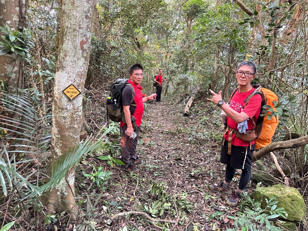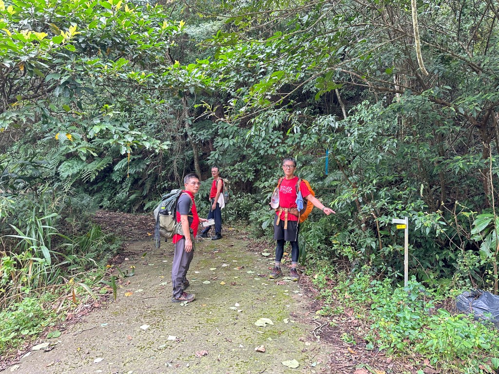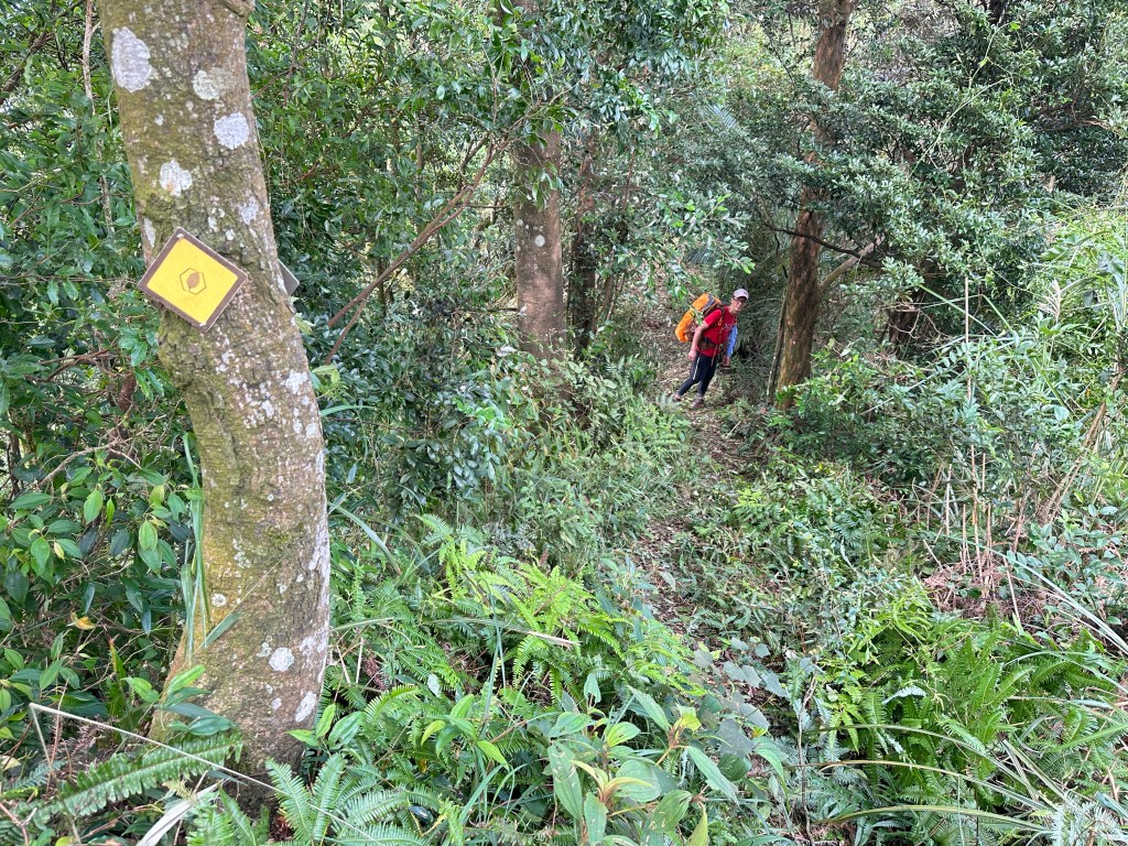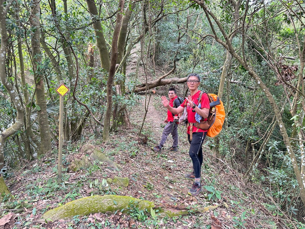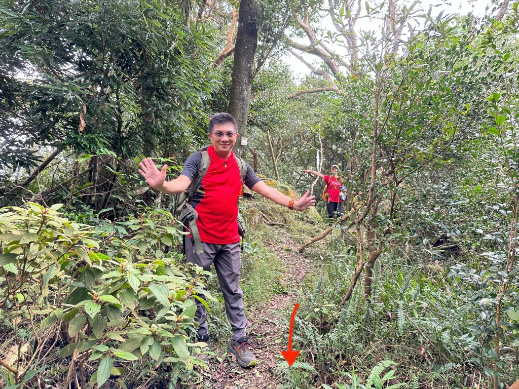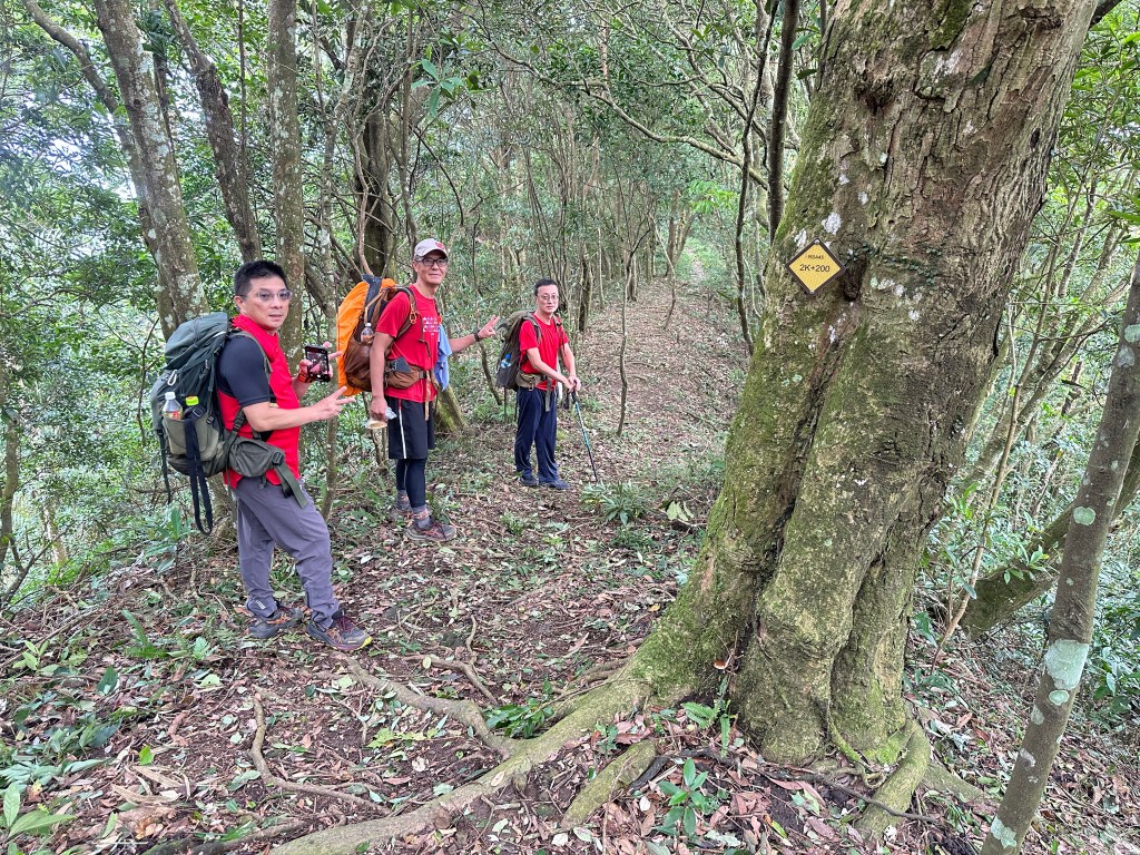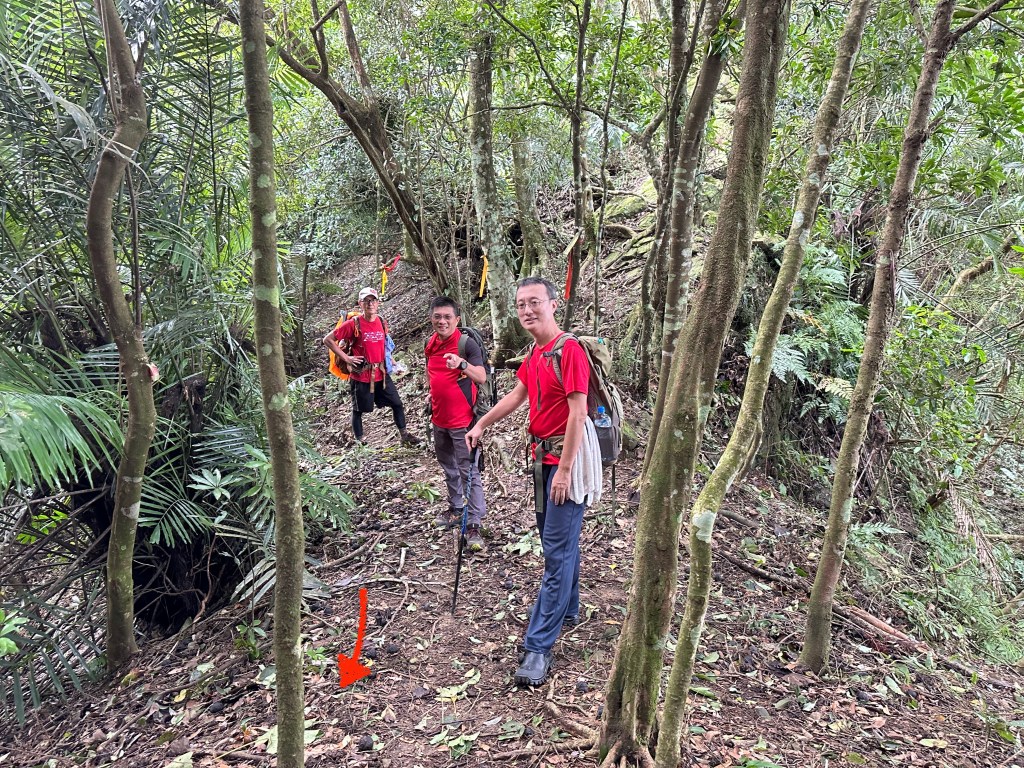 今天,他的里程必然會比我們多6K,Hank、Smile與我(Gosen)在八角崠山拍完照也等了約20分鐘後,因為Jun還沒到,我們就提前下山接回樟之細路,陡下中途,沒想到Jun居然已然追上!因Smile的速度比較慢,因此,讓Jun先自行去拍三角點,而我們就繼續往協雲宮走。