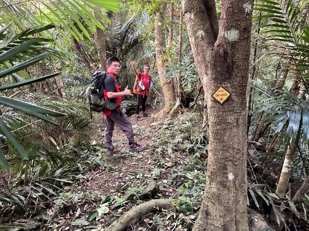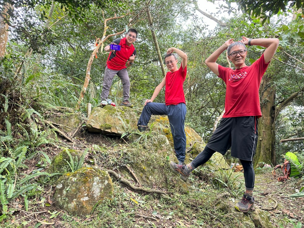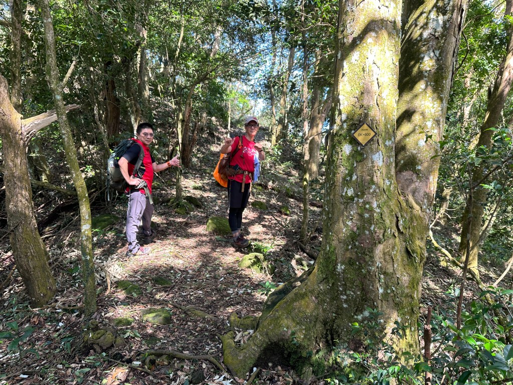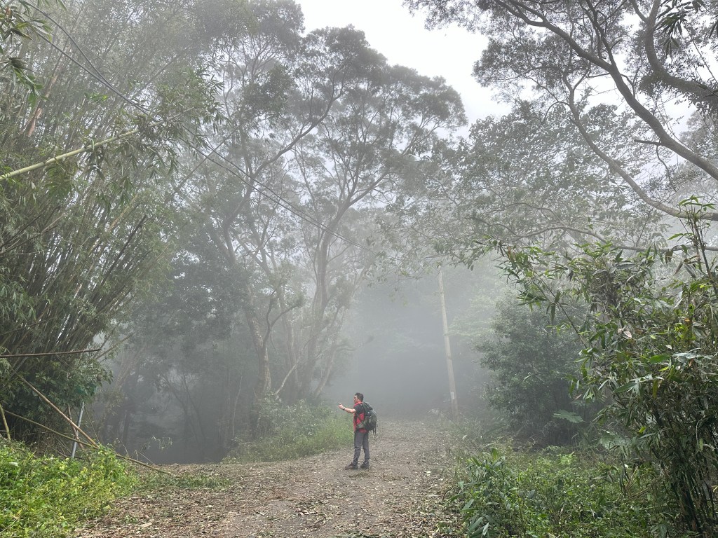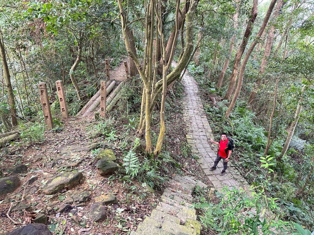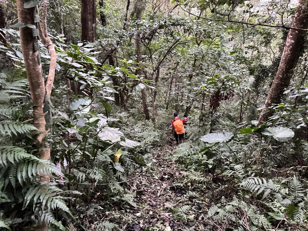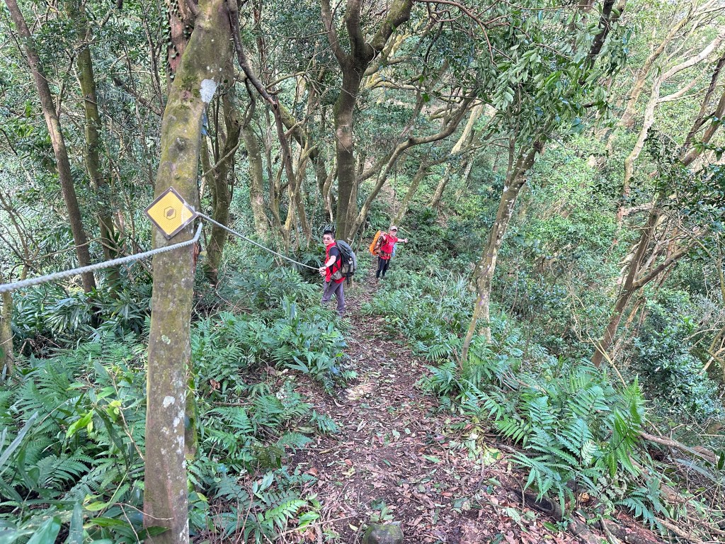今天,他的里程必然會比我們多6K,Hank、Smile與我(Gosen)在八角崠山拍完照也等了約20分鐘後,因為Jun還沒到,我們就提前下山接回樟之細路,陡下中途,沒想到Jun居然已然追上!因Smile的速度比較慢,因此,讓Jun先自行去拍三角點,而我們就繼續往協雲宮走。
