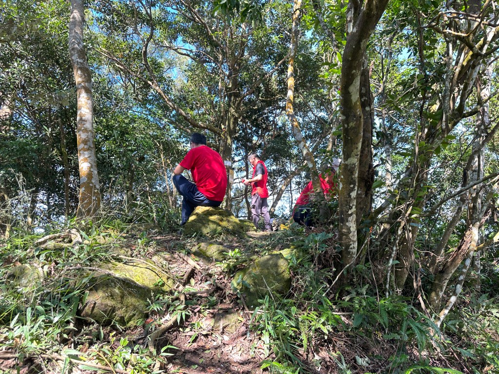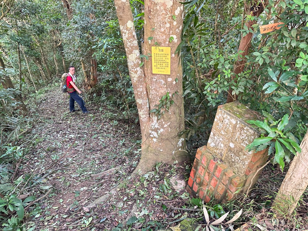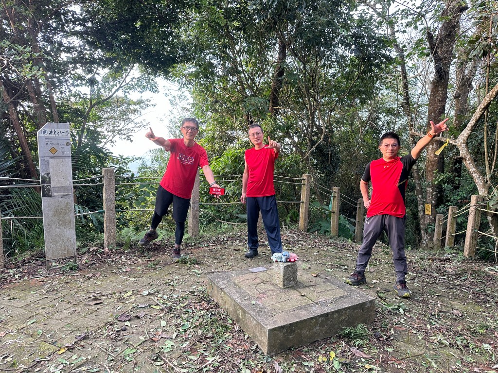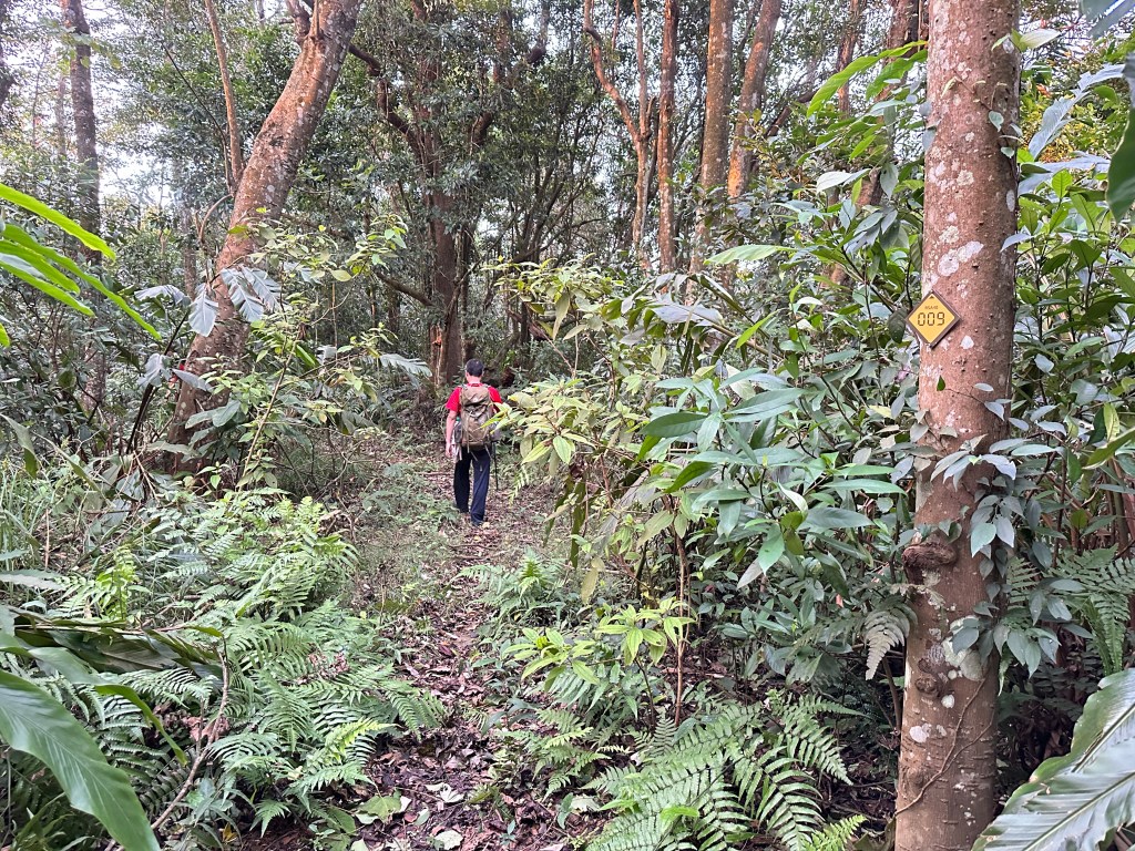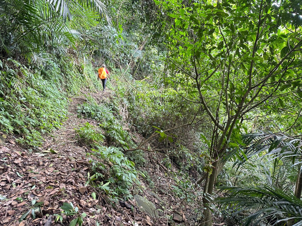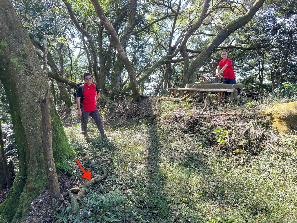 今天,他的里程必然會比我們多6K,Hank、Smile與我(Gosen)在八角崠山拍完照也等了約20分鐘後,因為Jun還沒到,我們就提前下山接回樟之細路,陡下中途,沒想到Jun居然已然追上!因Smile的速度比較慢,因此,讓Jun先自行去拍三角點,而我們就繼續往協雲宮走。