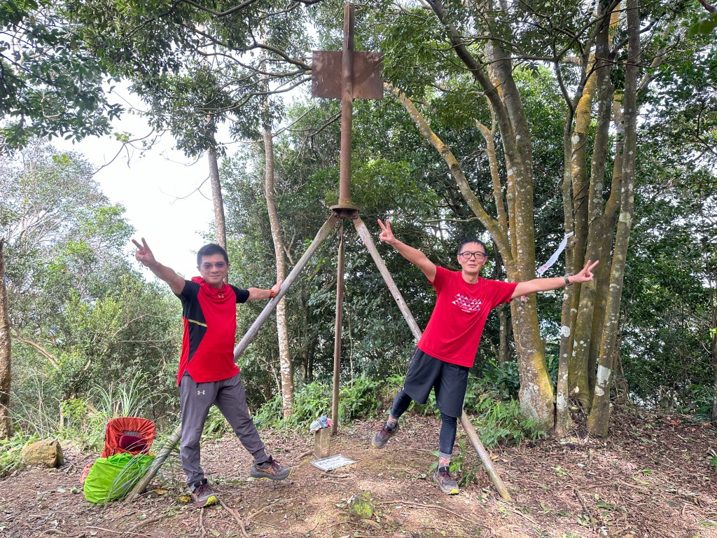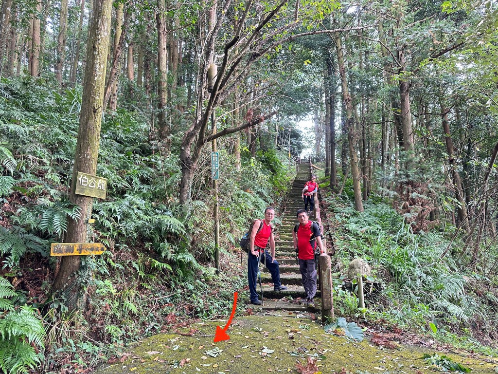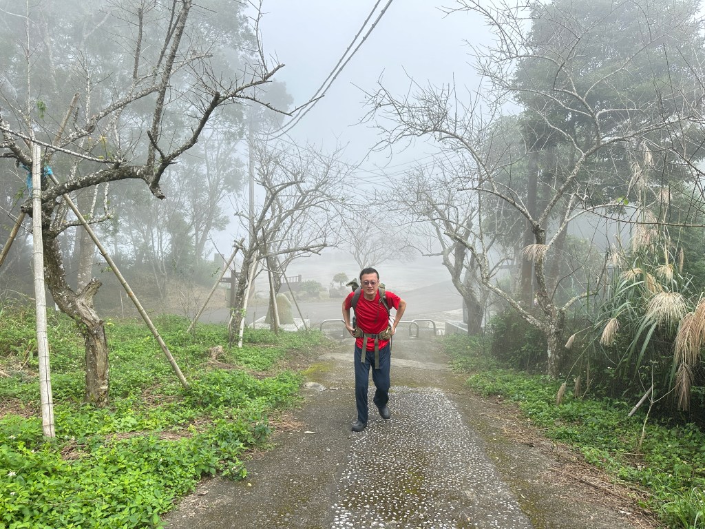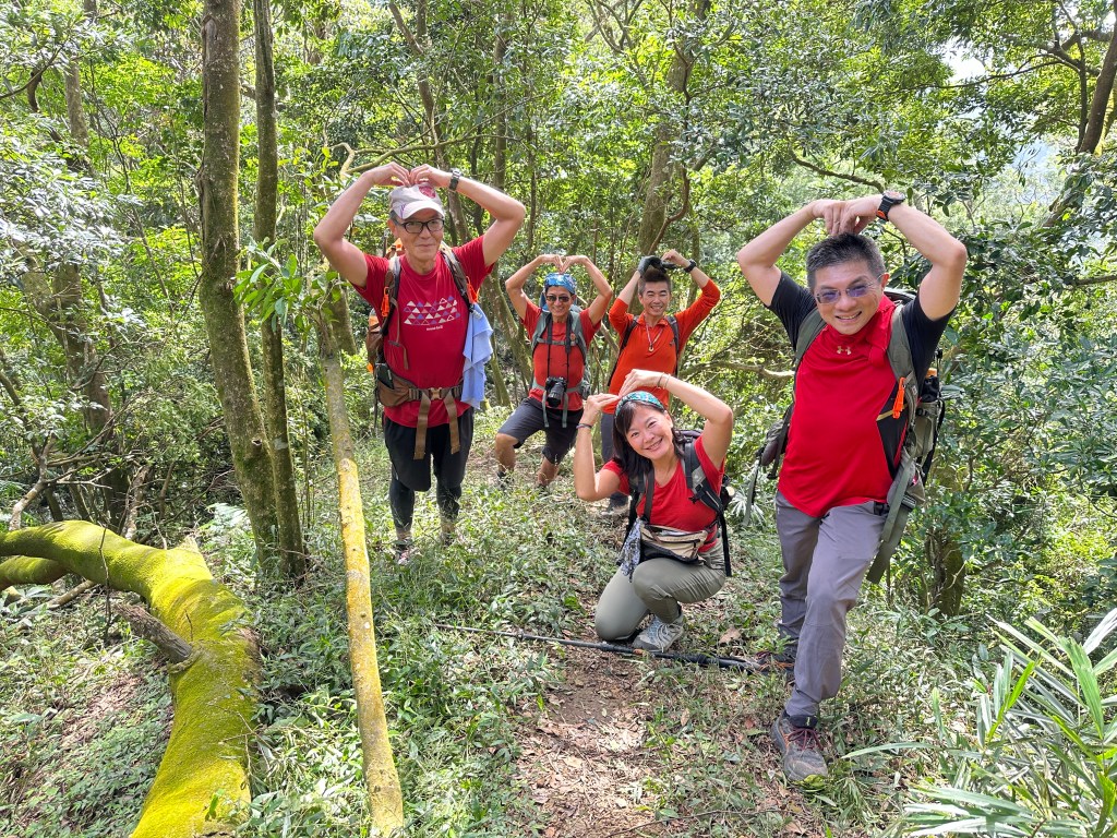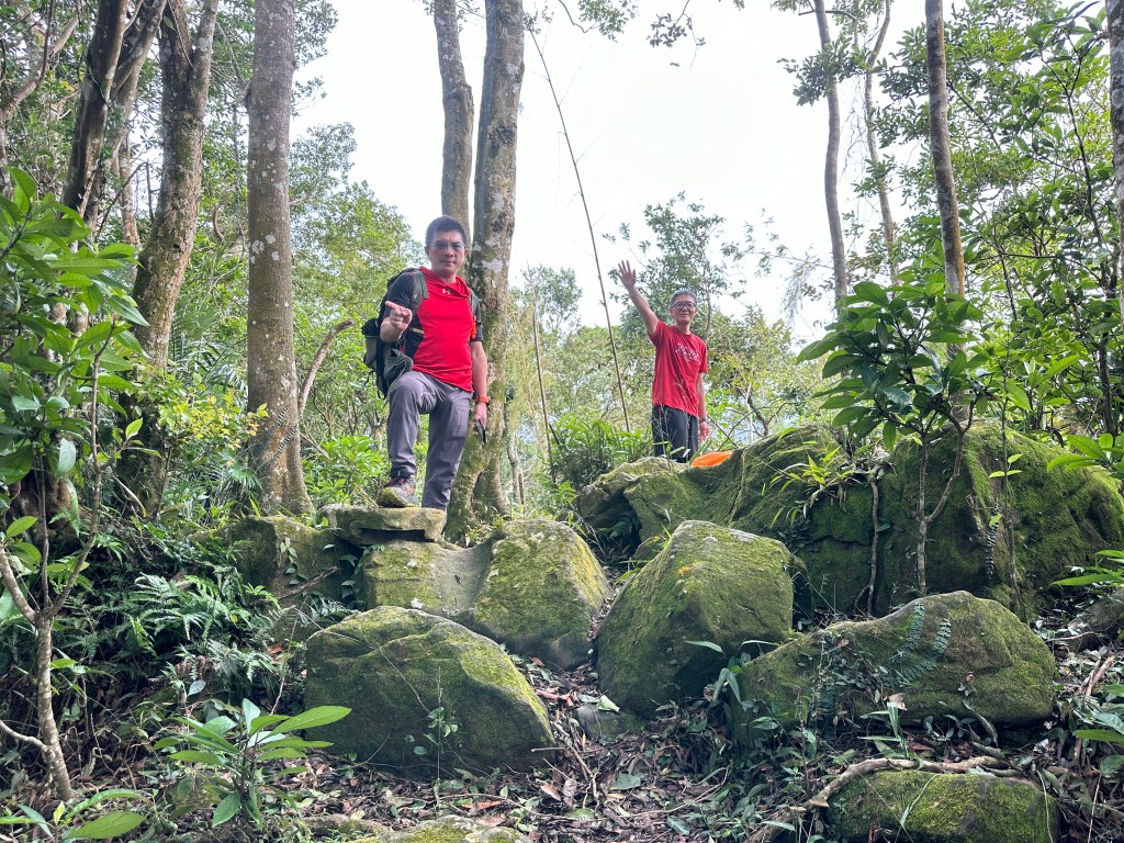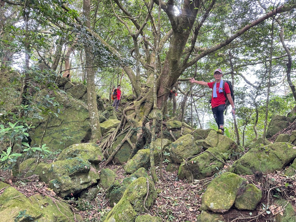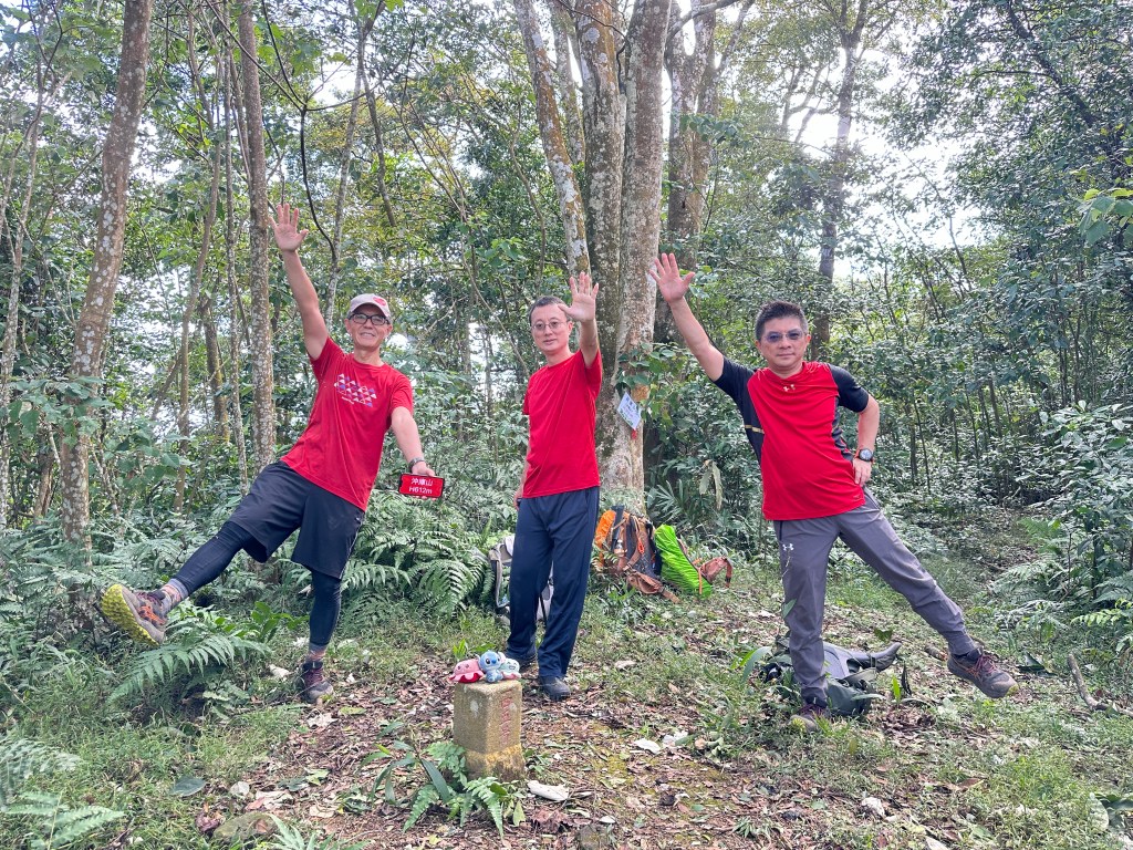 今天,他的里程必然會比我們多6K,Hank、Smile與我(Gosen)在八角崠山拍完照也等了約20分鐘後,因為Jun還沒到,我們就提前下山接回樟之細路,陡下中途,沒想到Jun居然已然追上!因Smile的速度比較慢,因此,讓Jun先自行去拍三角點,而我們就繼續往協雲宮走。