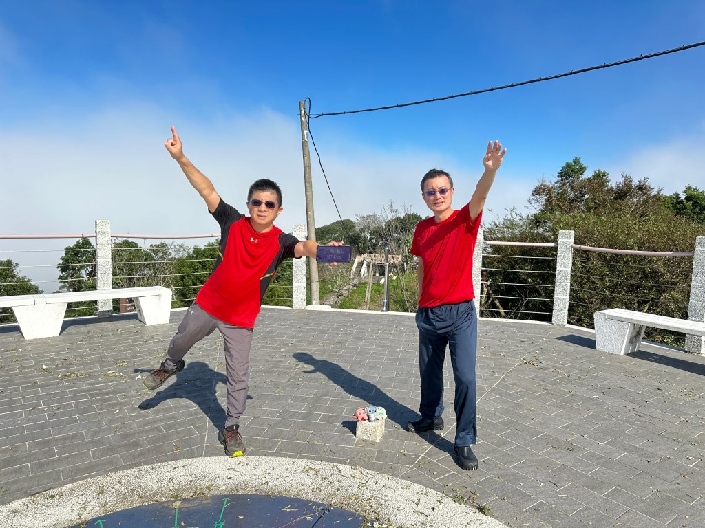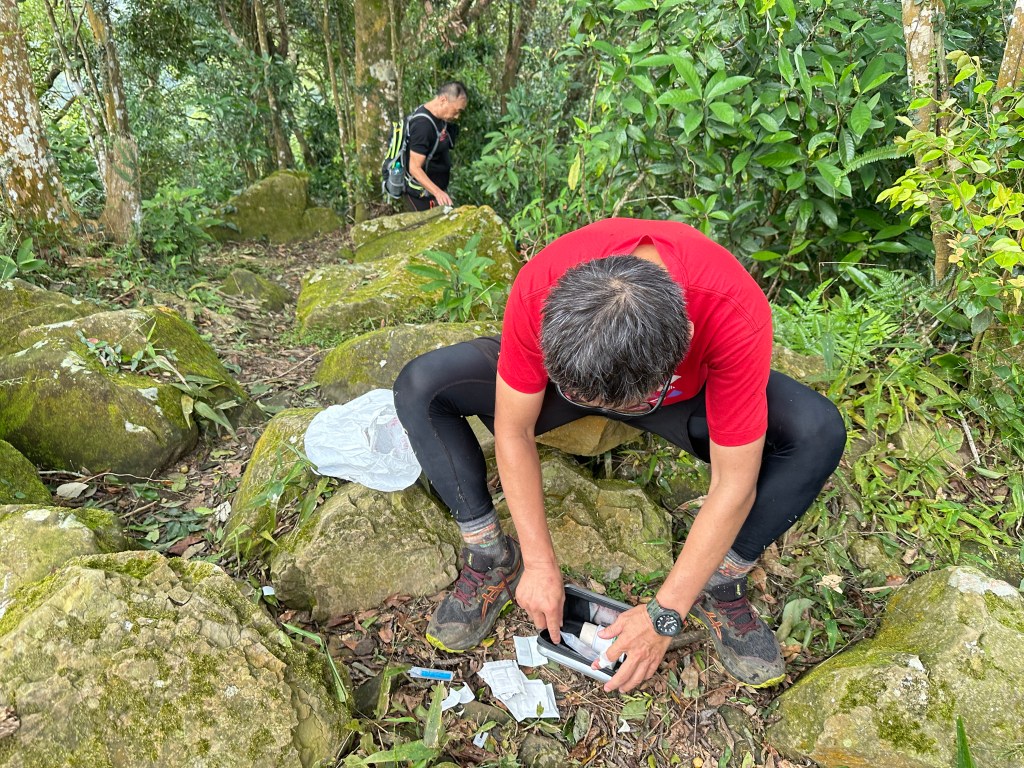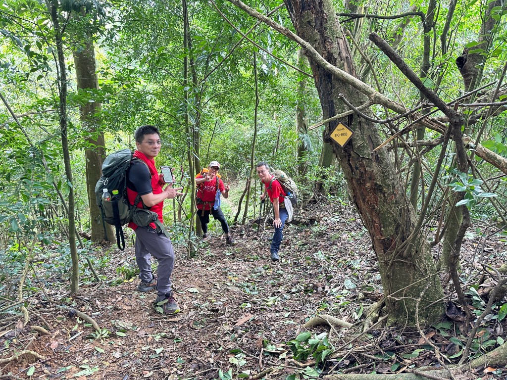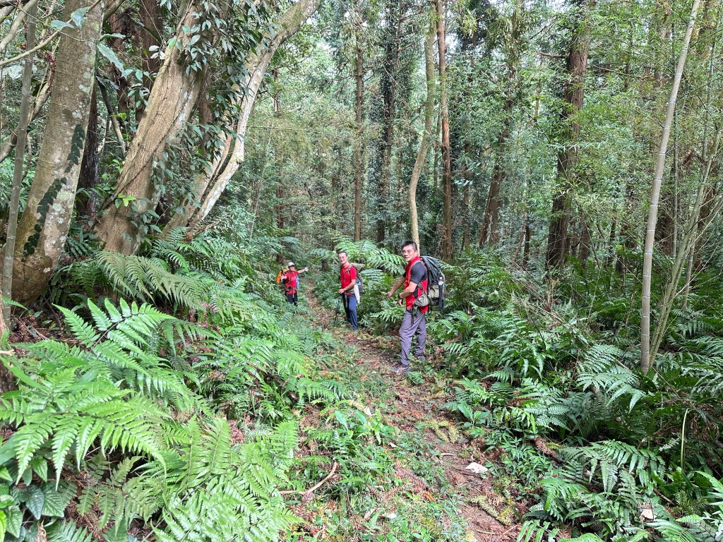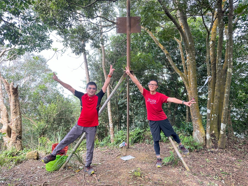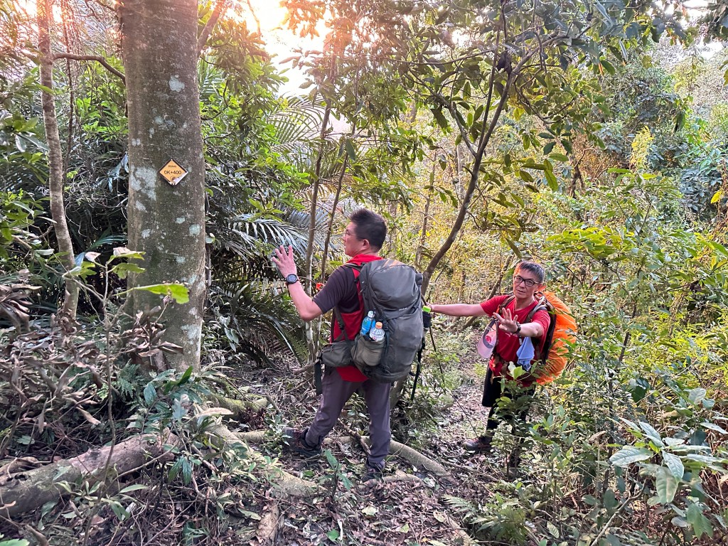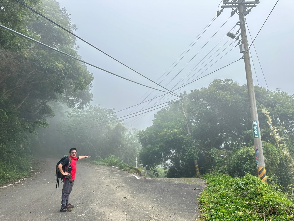 今天,他的里程必然會比我們多6K,Hank、Smile與我(Gosen)在八角崠山拍完照也等了約20分鐘後,因為Jun還沒到,我們就提前下山接回樟之細路,陡下中途,沒想到Jun居然已然追上!因Smile的速度比較慢,因此,讓Jun先自行去拍三角點,而我們就繼續往協雲宮走。