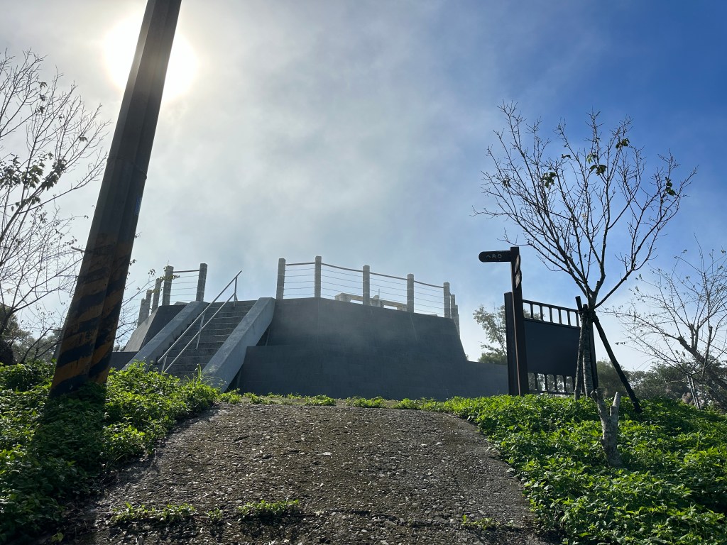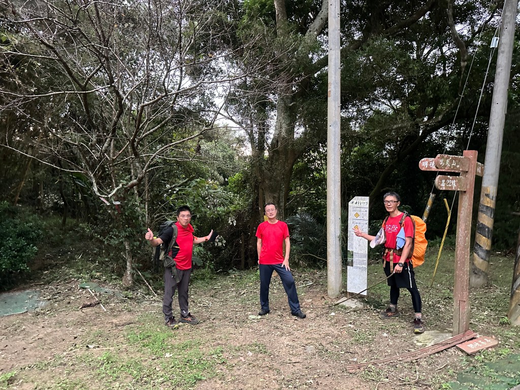 來到蕃子寮山時,已經是下午4點半。離天黑5點40分僅剩下1小時10分,此地離明德水庫福德祠水頭伯公還有4.5K的距離,四人一路沿著北長城步道,來到帽盒東山蘧盧書院登山口前(蘧盧ㄑㄩˊ ㄌㄨˊ驛站附設專供行人休息的房舍),這時候天色稍黑夕陽仍在,我(Gosen)跟大伙討論一番,樟之細路並沒有通過帽盒東山,接著,要摸黑走2K才能出苗16線,再走300m才能抵達福德祠水頭伯公,所以,我們要跳過帽盒東山。