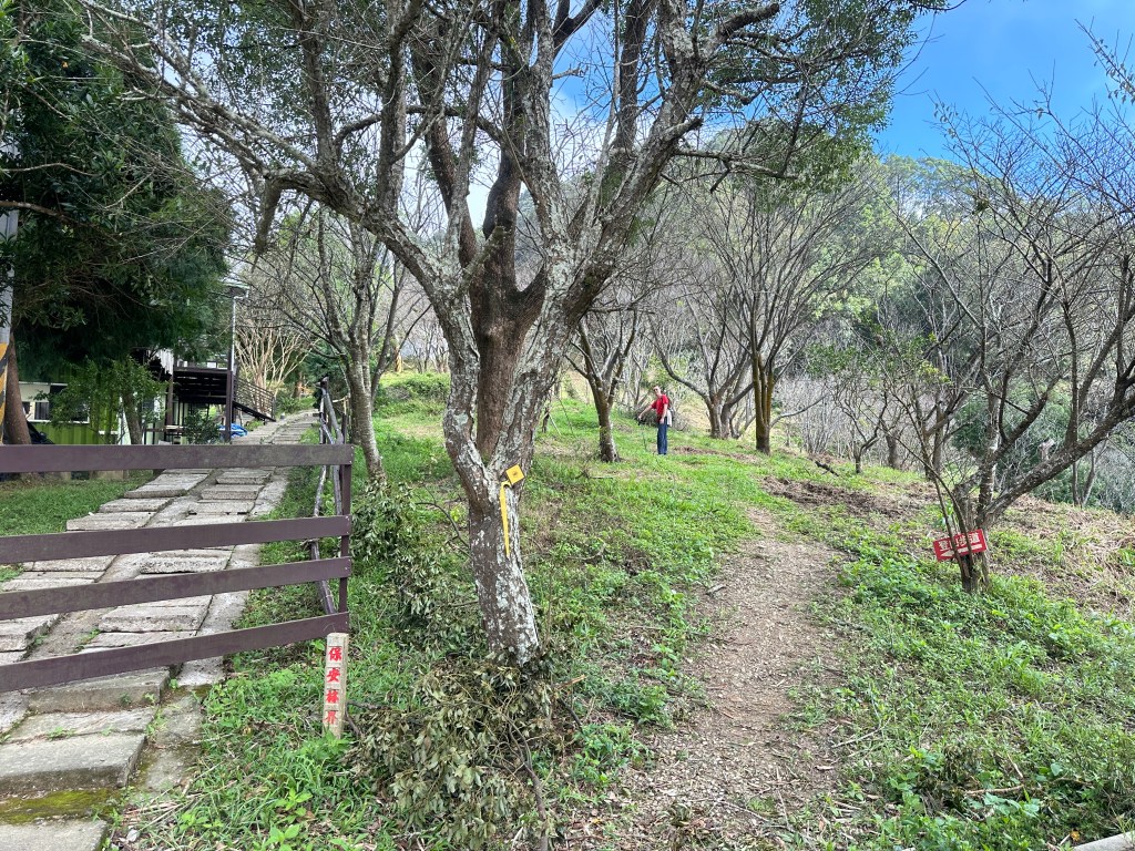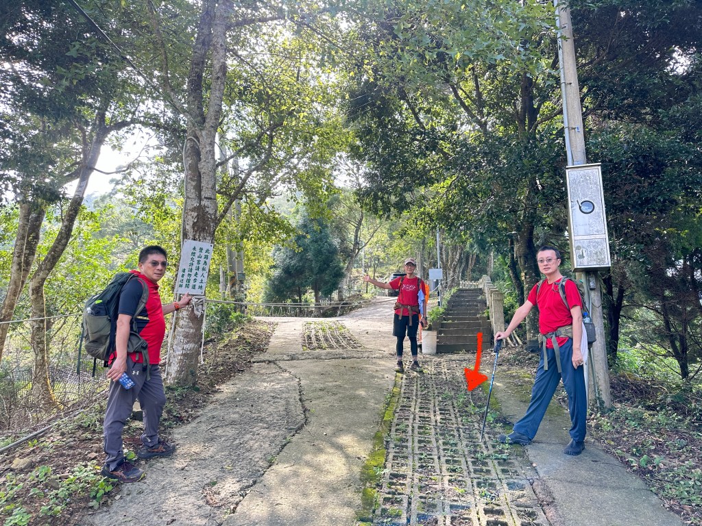 此時是晚間6:20,由普光寺左側路徑陡上,100m後陡上稜線,沿著稜線往左再走100m即抵達水塞下山,四人在此拍照休息一下,緊接著,由三角點右側路徑直接陡下200m的距離,接上水泥路徑繼續再走300m看到民宅,直接由左側民宅前鐵皮下走道穿越,這裡是福州農場,就可以看到樟之細路水塞下古道的路線導覽圖。