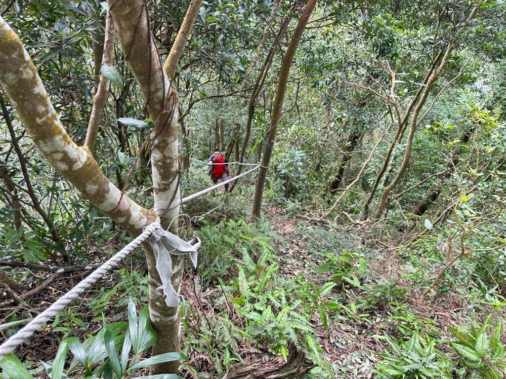 距離有6.4K,這一段的地形是深V過程。由銃庫山先經過一小段右側為斷崖但有繩索的地形,接著就會連上進入私人露營區,記得,要由露營區左側的木梯陡下,而不要走進私人露營區喔!
