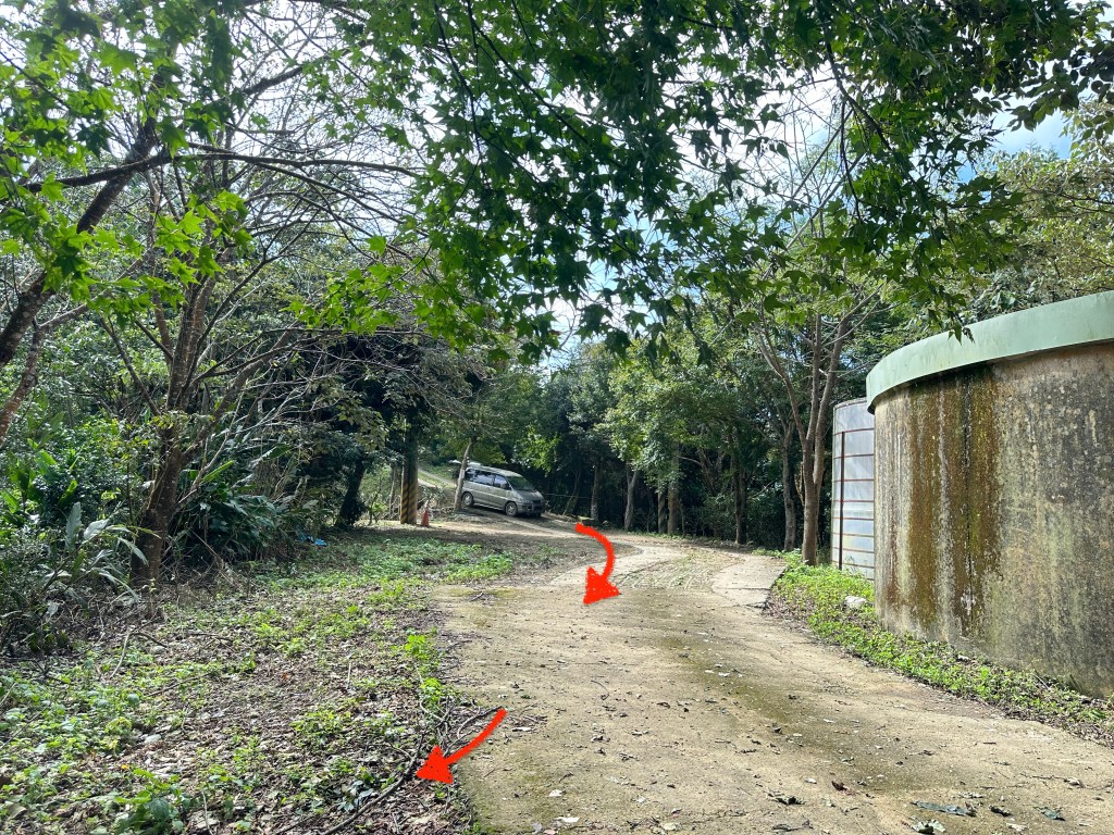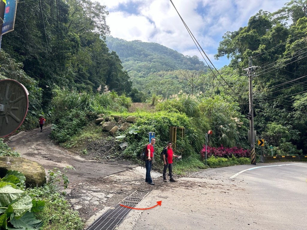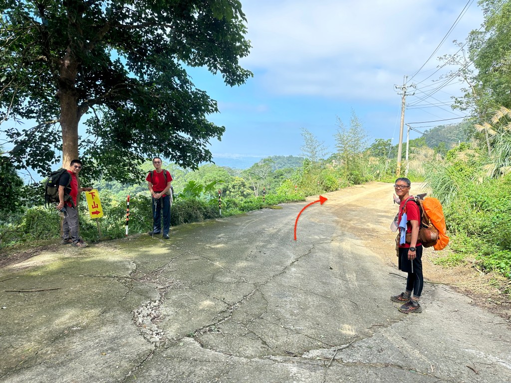 投影片:接上了十字鞍部!右轉可以沿著產業道路一路陡下接上台3線的香圓窩,這裡也可以當作是撤退路線。左轉則是死胡同,無法通往任何地方。我們要繼續直走陡上。11:14