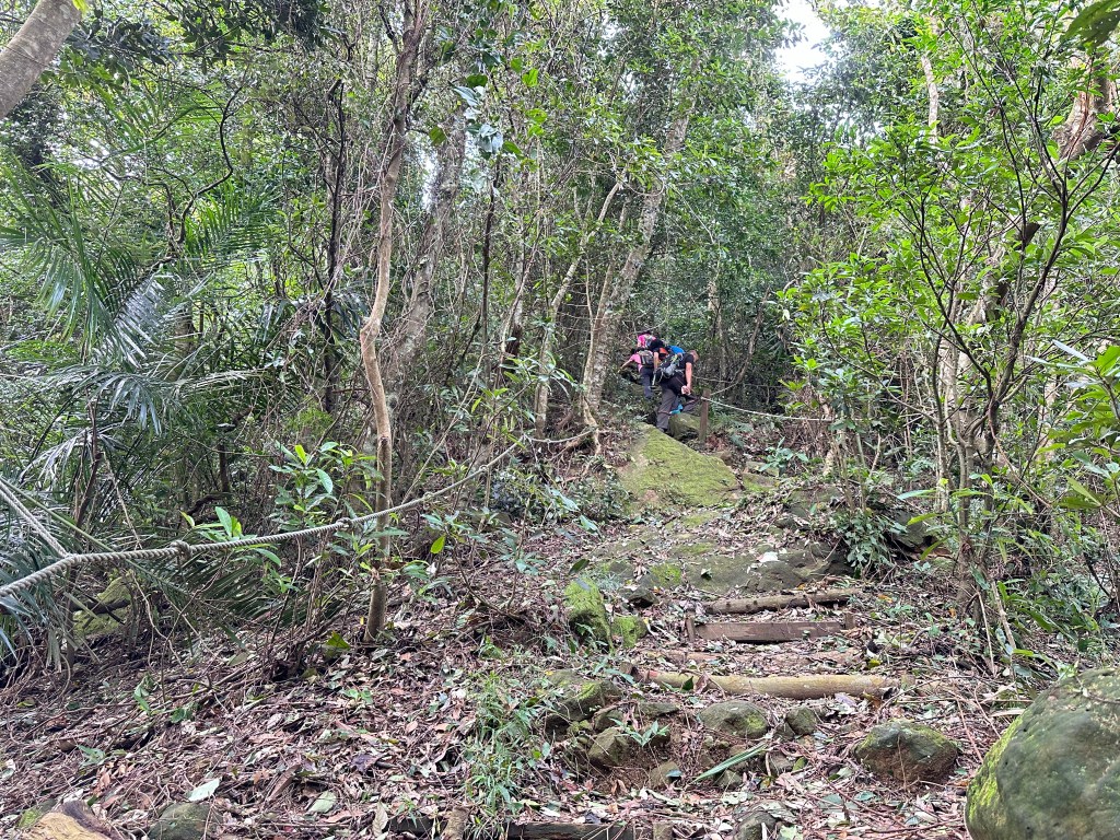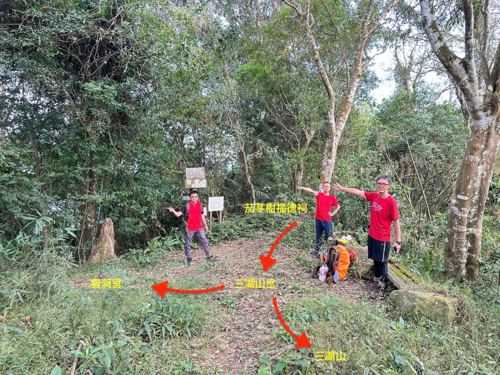 接上龍骨古道,恰好遇到幾位山友也正在此處。接回正常的樟之細路後,繼續陡上經過兩次的V型陡下陡上抵三岔路高點,切出去走略微緩下在100m距離時抵達三湖山,所以三湖山並不是位在高點,實際上站在三湖山三角點往前望,可以看到正前方就有一壟起的山頭,那應該才是正常的三湖山吧?