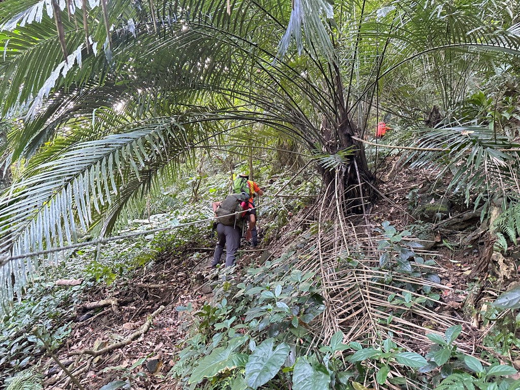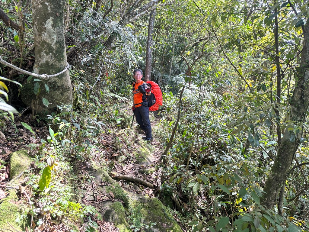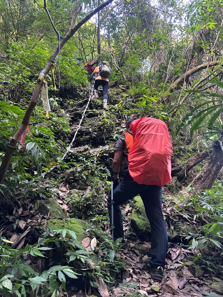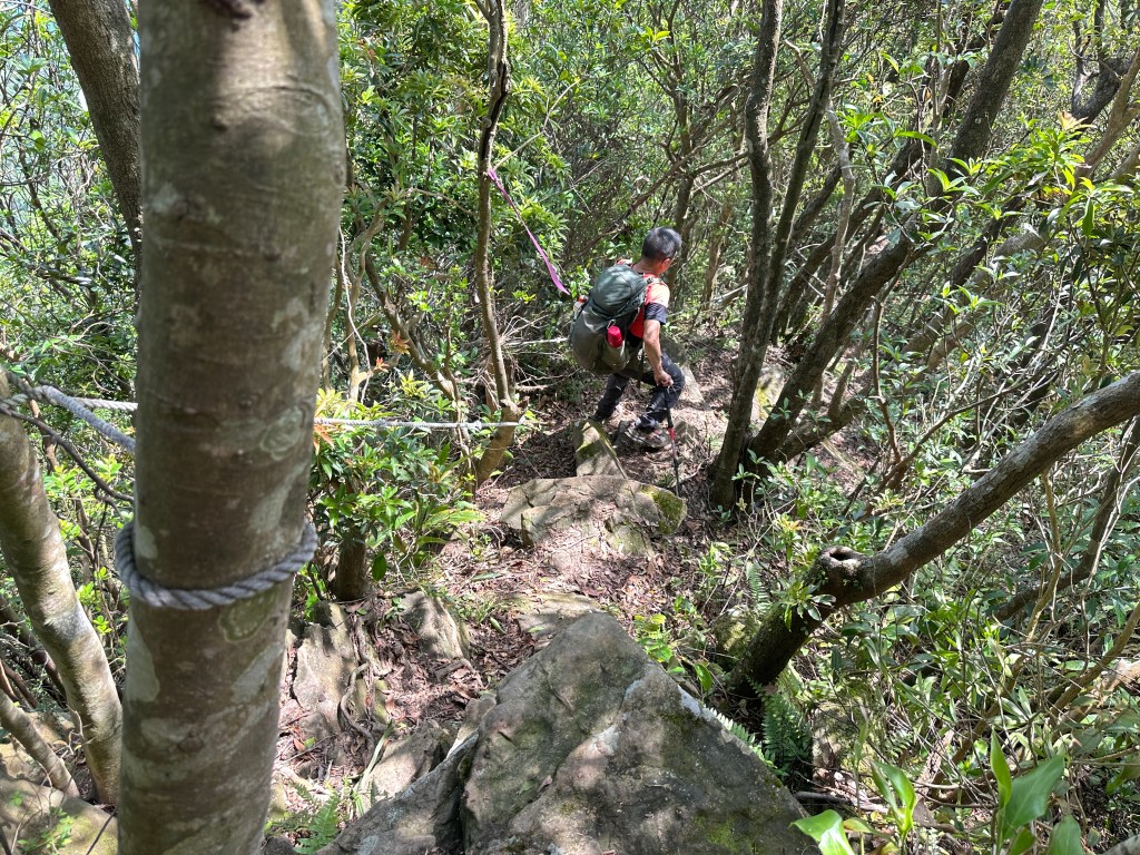 休息後,接續往赤腳蘭山、鳥嘴尖,這些路徑都優美,搭配今天天氣大好又有些林蔭,走起來蠻是舒服!Eva與第一次加入我們的Yuna兩人整天都是一馬當先。從鳥嘴尖到暗寶劍山,前階段左側都是邊坡斷崖路徑但不危險且有繩索,後段路徑穩穩緩上,最後100公尺直接拉高上到暗寶劍山。