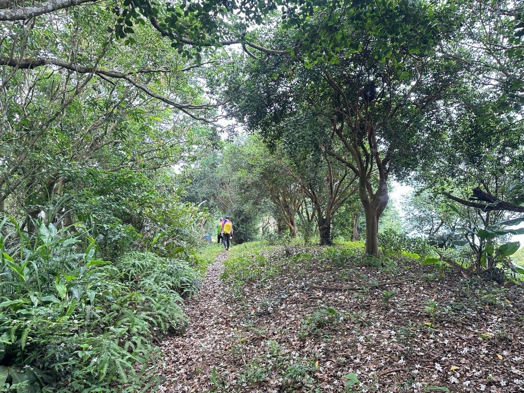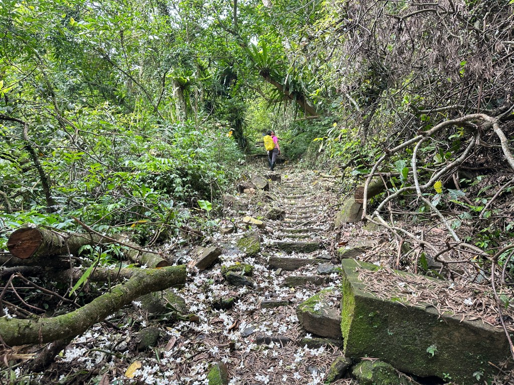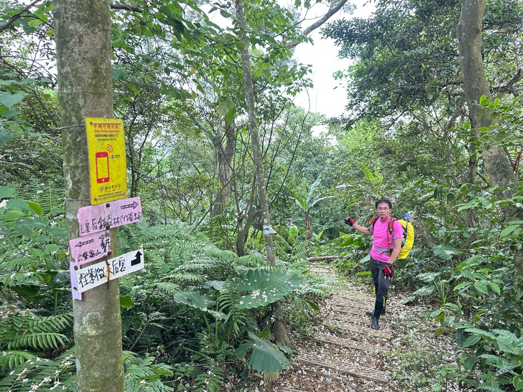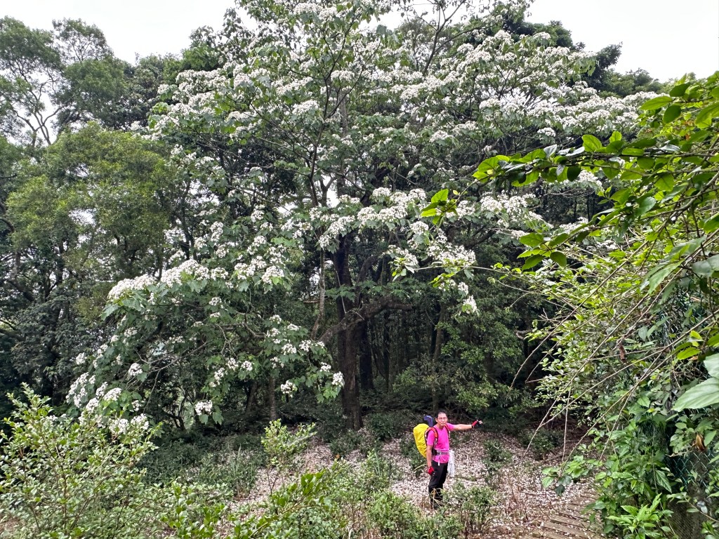 接著,就會連上稜線,這一天這一段路徑上滿滿四月雪的桐花!蠻漂亮的一段!接上四岔路口後,往右陡下而走,岔路口這裡有藍天隊的方向指標,就是要往六寮崙山/紫微天后宮的方向走。持續陡下走1K即可接上紫微南路,左轉沿著紫微南路走150公尺即可看到紫微森林。