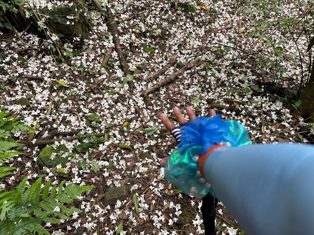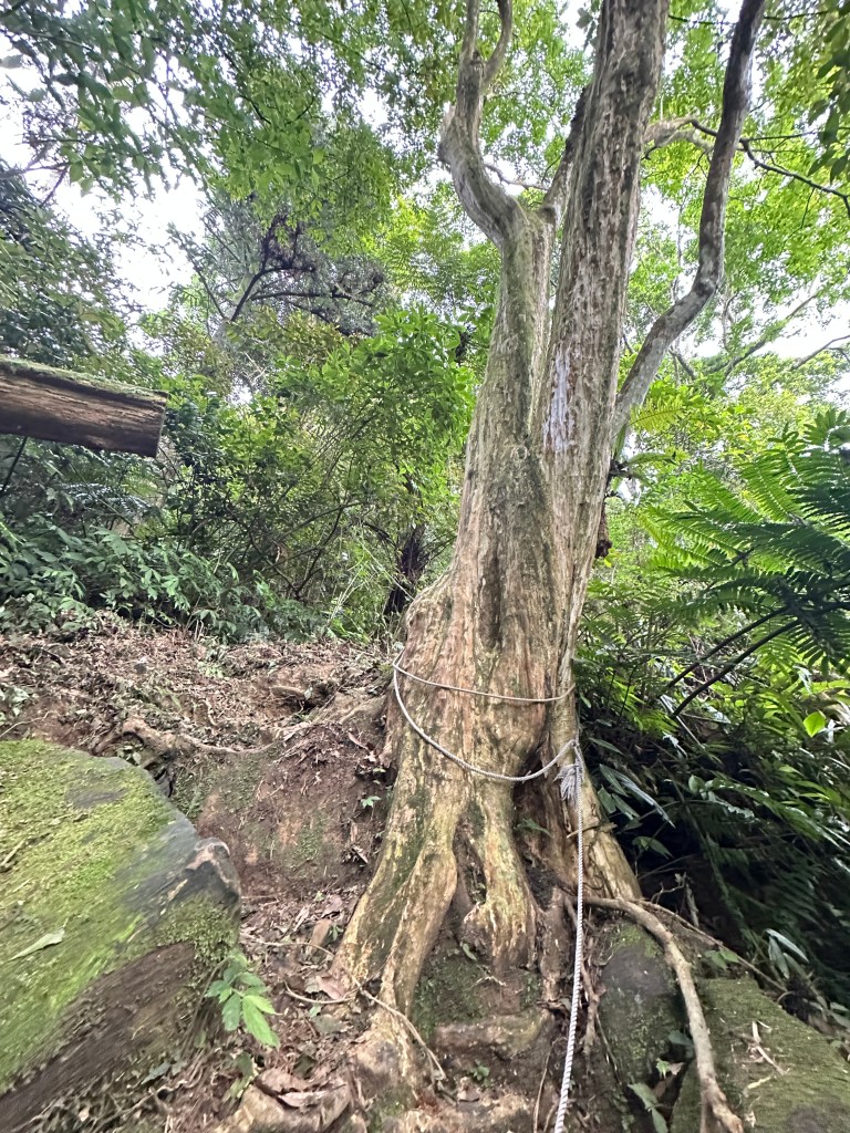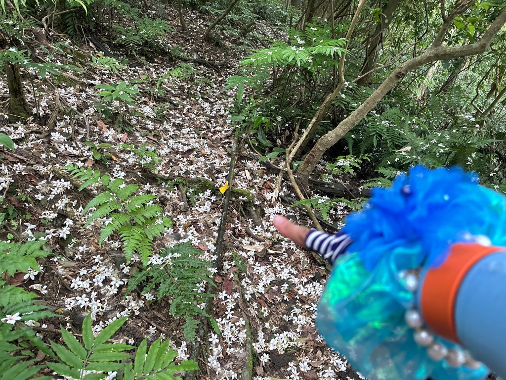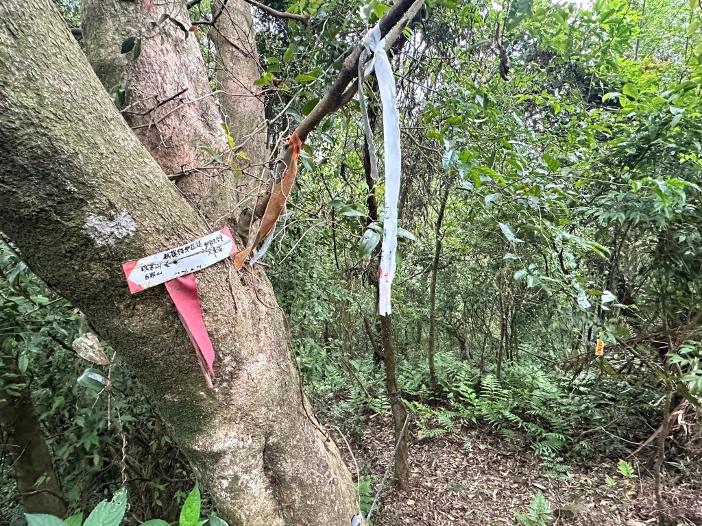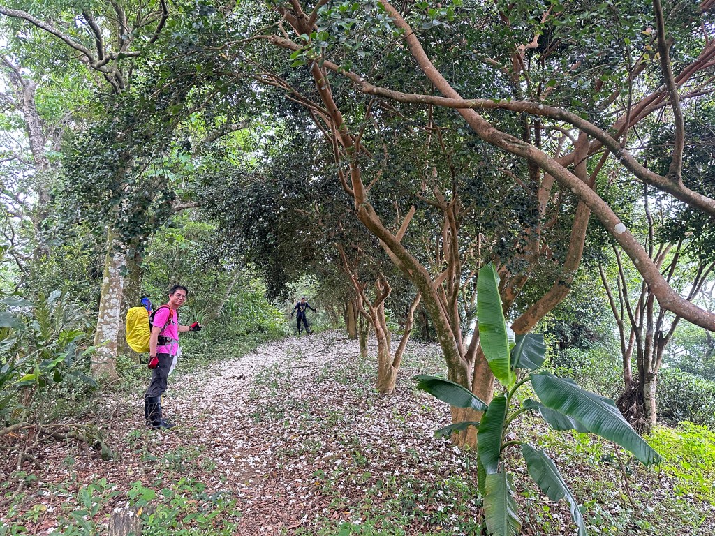 接著,就會連上稜線,這一天這一段路徑上滿滿四月雪的桐花!蠻漂亮的一段!接上四岔路口後,往右陡下而走,岔路口這裡有藍天隊的方向指標,就是要往六寮崙山/紫微天后宮的方向走。持續陡下走1K即可接上紫微南路,左轉沿著紫微南路走150公尺即可看到紫微森林。