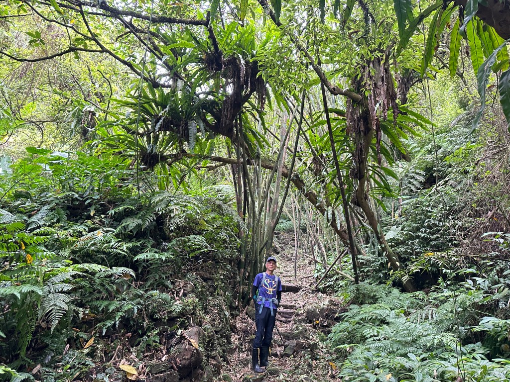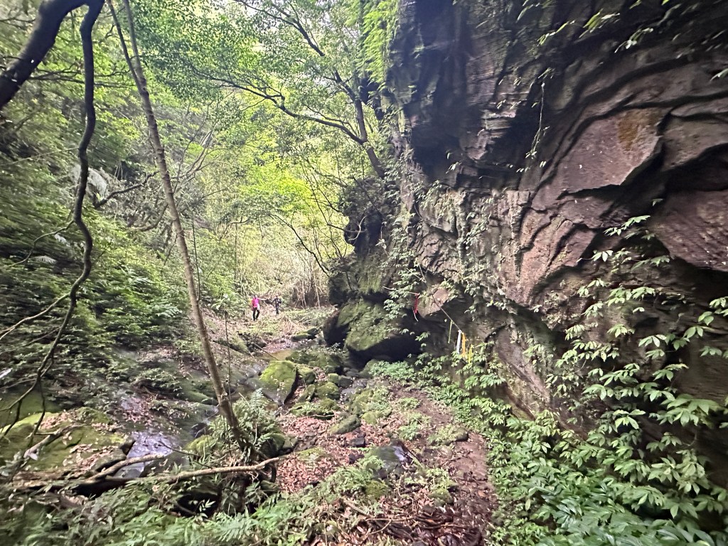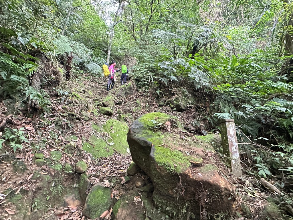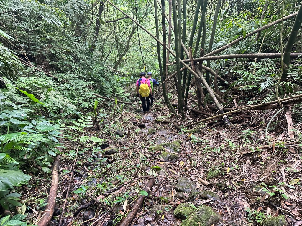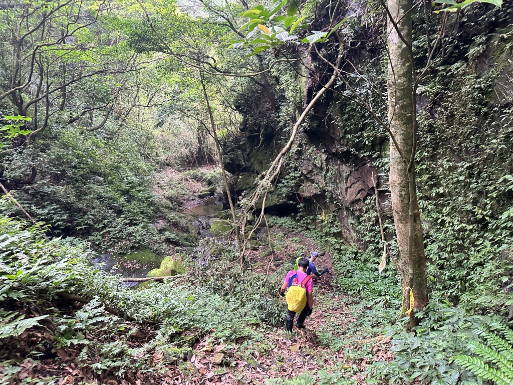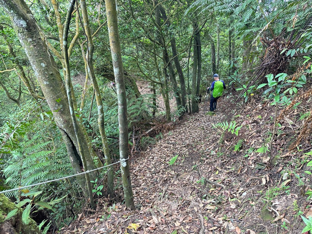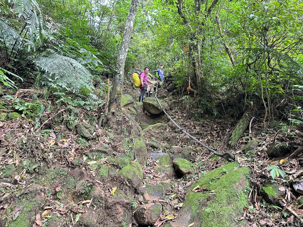 到此,白雞三山已經完成!接著由雞罩山回走,經過雞罩山前峰後馬上看到岔路,接著就往右岔陡下,開始往六寮崙山方向走。陡下到海拔H630m時開始進入400公尺長的溪溝路,濕滑不好走得放慢速度!陡下到海拔H610m時溪溝路右側出現大岩壁,這一小段特別不好走!持續往前後即脫離溪溝路,接續的路徑到連上稜線路岔前,都是右側邊坡的路徑,其中一小段是滿滿青苔的石階路,越陡上有小一段路徑的邊坡路幅很小具有風險性,小心通過!