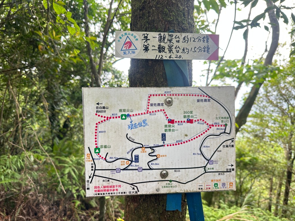 陡上過程上稜線到了T字岔,往右走1.1K先去鹿窟尖!這一段我們之前走過,知道必須要經過好幾個假山頭的上下,707峰、662峰、656峰、684峰一字排開,接著就來到鹿窟尖!拍照後,再原路回走1.1K回到T字岔。通過T字岔繼續前行走500公尺,路徑變成木階梯,陡上後來到白雞山岔,三人決定在此午餐休息了約半小時。